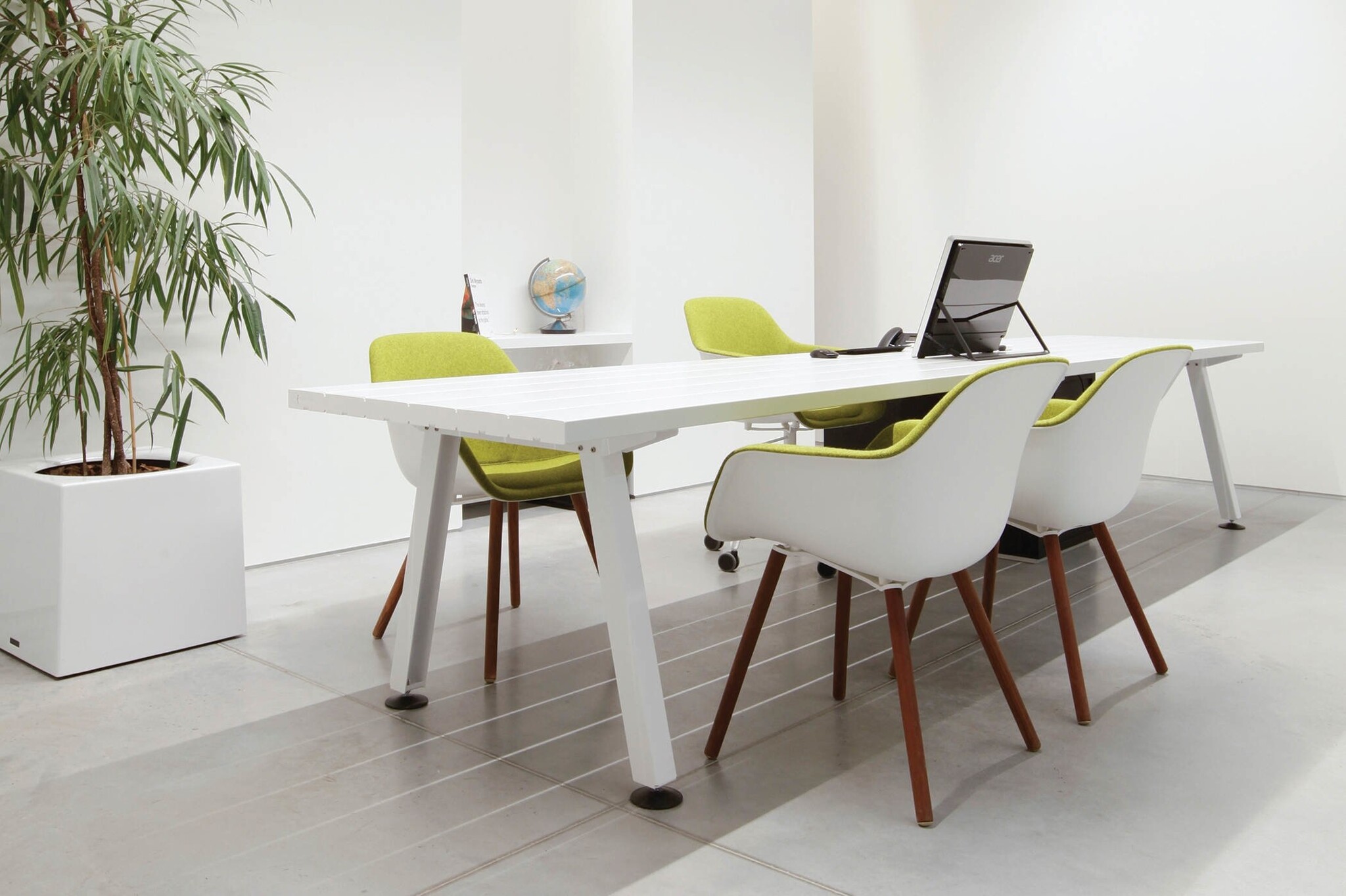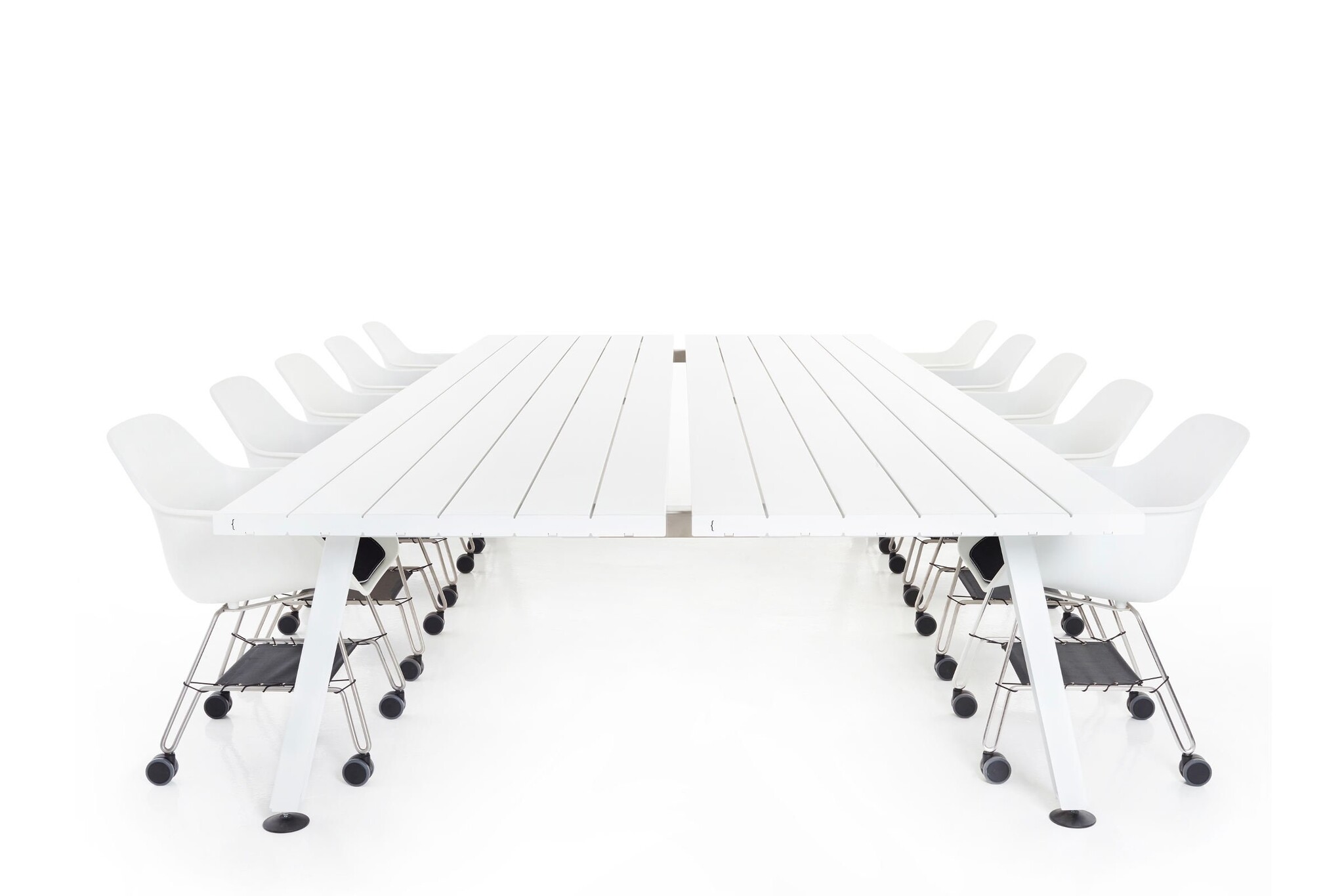 Het showroomexemplaar van de Marina-tafel op het Salone Internazionale del Mobile was ongeveer 12 meter lang, maar je kunt het meubelstuk ook verkrijgen in 'normale' afmetingen (vanaf 2m20). Het was voor Extremis een uitdaging om een ontwerp te maken dat qua budget toegankelijk is voor velen, zonder dat de functionaliteit en designwaarde er moesten bij inschieten. Het feit dat je - dankzij de banken - niet genoodzaakt bent alle stoelen apart te kopen voor aan tafel, spaart al meteen heel wat geld uit.