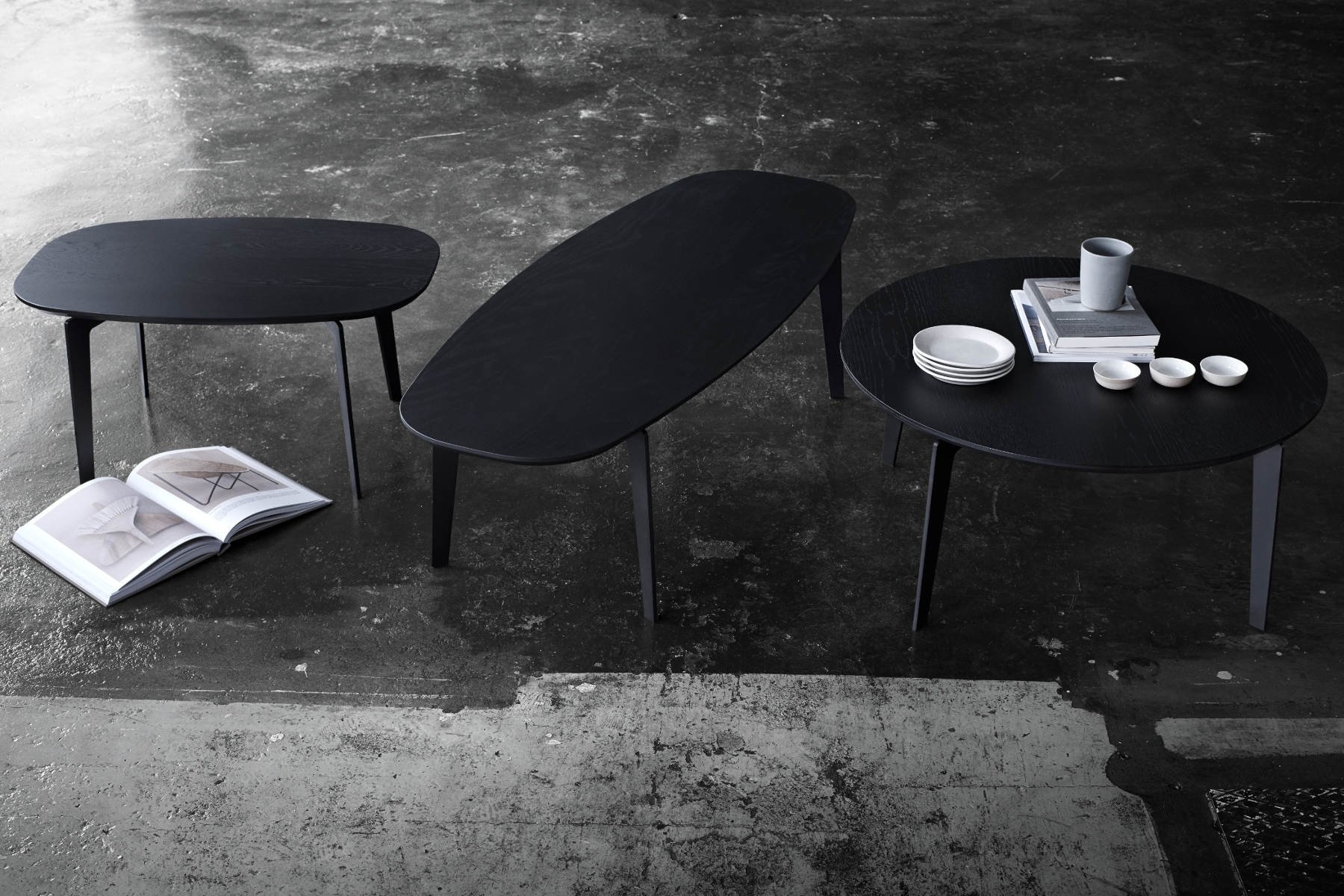 De Fritz Hansen Join lage tafels zijn leverbaar in twee materialen en kleuren: eik en zwart gelakt eik.