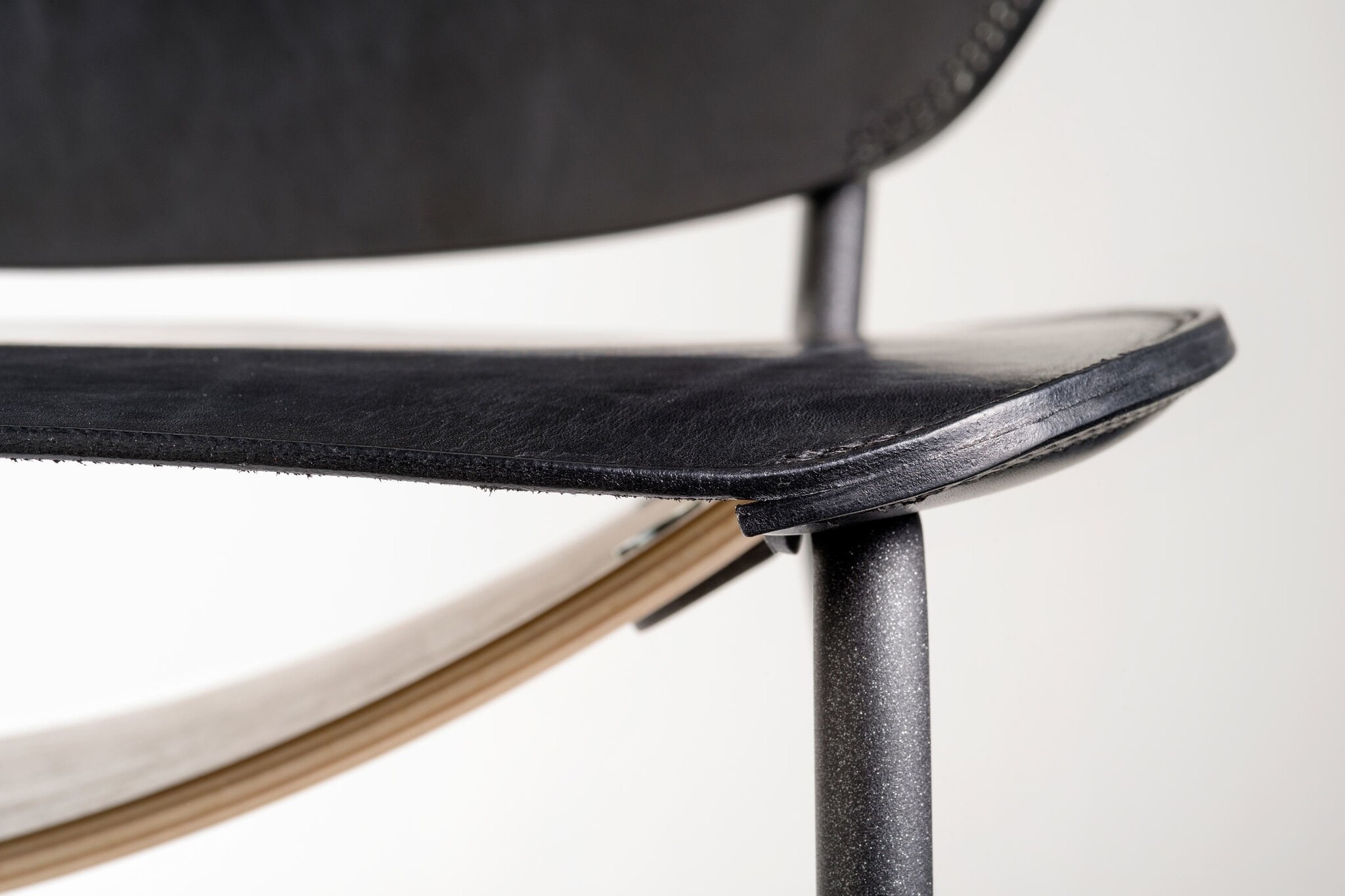 De rug en zitting zijn gemaakt van de hoogste kwaliteit Duitse leer, 5 mm dik en gebruind in een organisch proces.