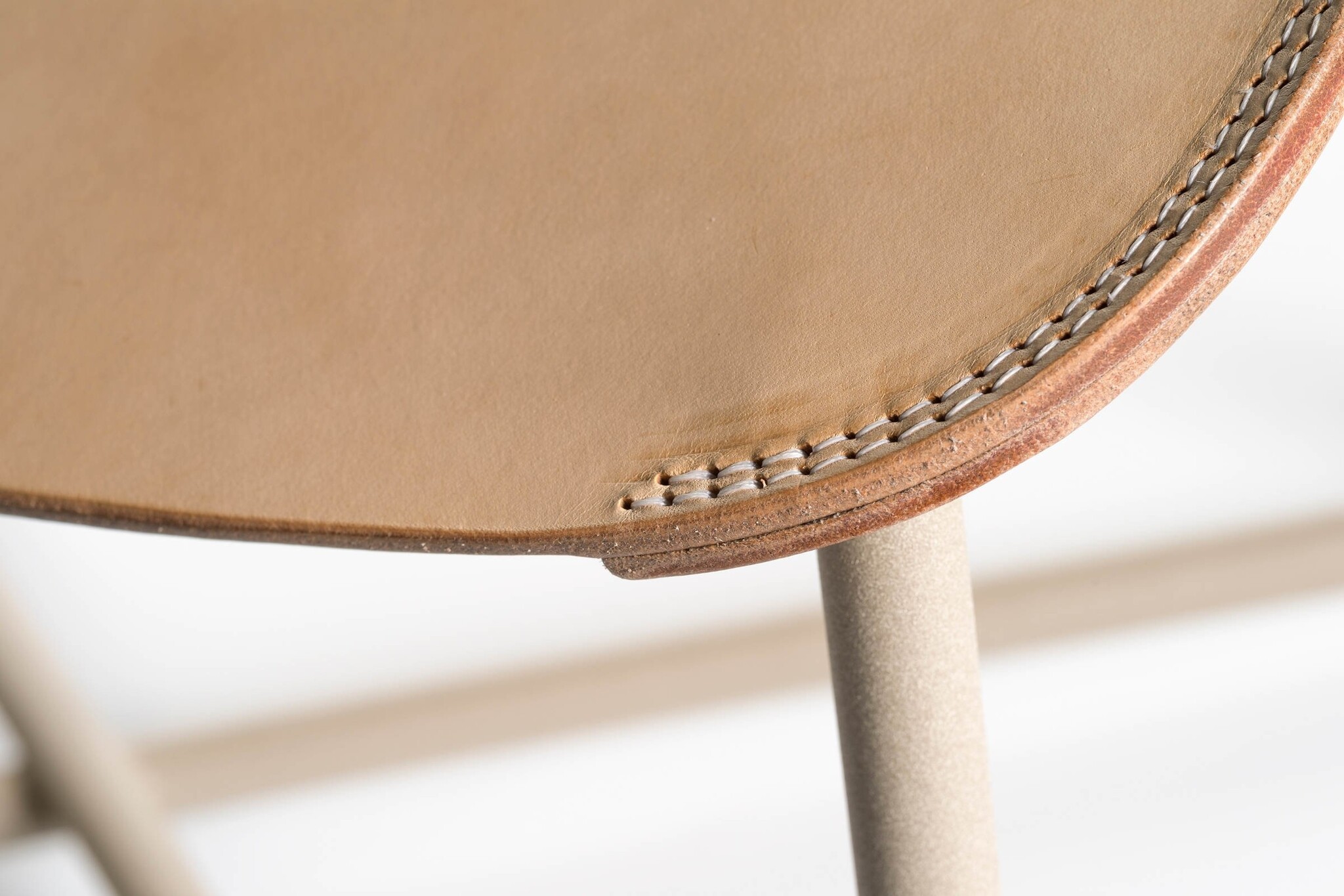 De rug en zitting zijn gemaakt van de hoogste kwaliteit Duitse leer, 5 mm dik en gebruind in een organisch proces.