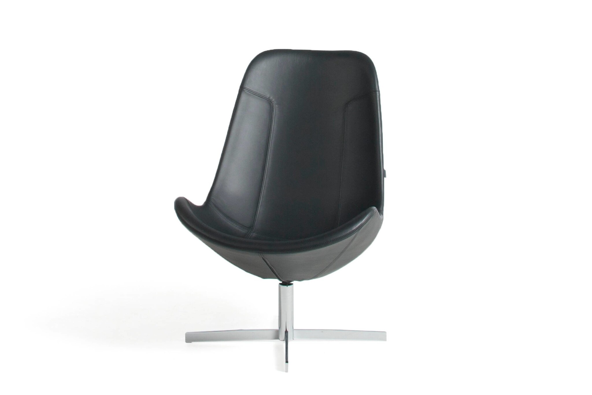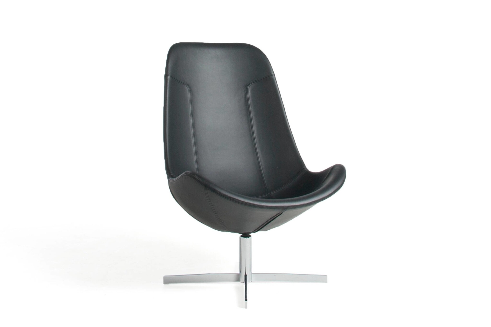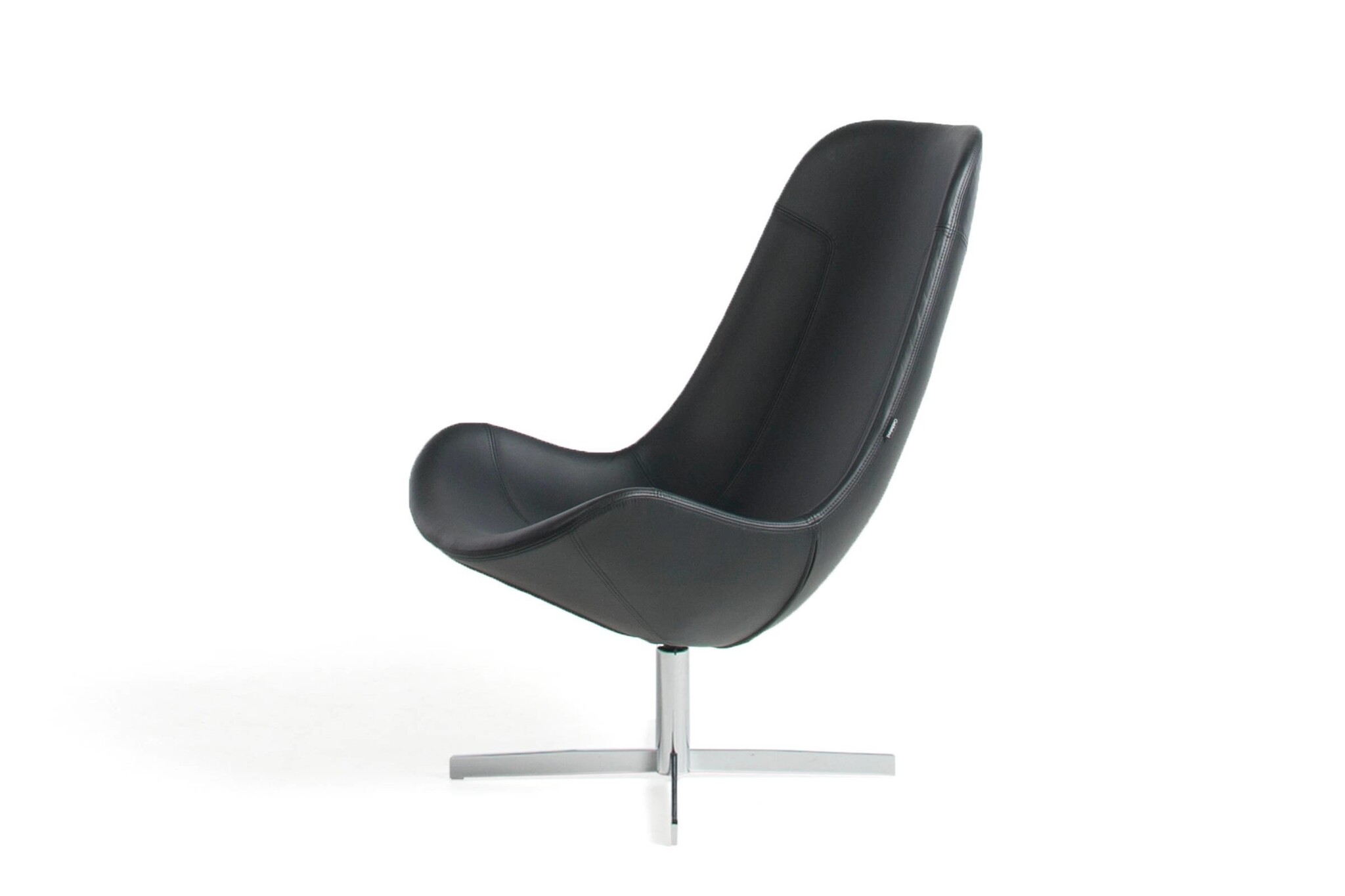 Het onderstel van deze loungefauteuil betreft een kruisvoet, deze is niet alleen in zilver, maar ook in zwart te leveren. Het materiaal betreft chroom.