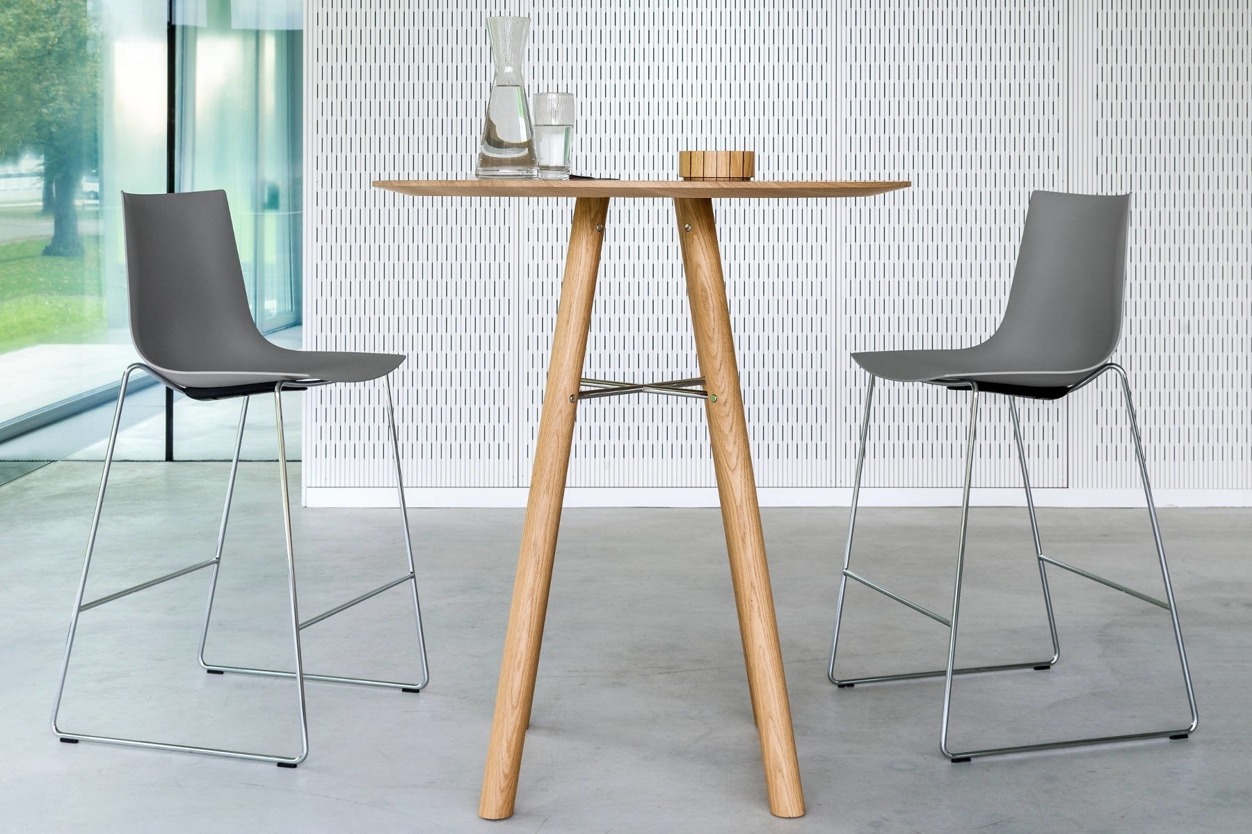 Girsberger Akio High is een programma massief houten statafels die het mogelijk maakt om op oog hoogte met elkaar in gesprek te gaan, staand of zittend op een hoge kruk | barkruk. Akio high is uitermate geschikt om in een open kantoorruimte geplaatst te worden maar de tafel komt ook goed tot zijn recht in andere publieke ruimtes als lounges, kantines en dergelijke. De Akio High tafels maken het mogelijk om gedurende de dag van houding te wisselen en dynamisch en gezond te werken. Tevens zijn ze ideaal om gezamenlijk werk- of overlegprocessen te ondersteunen en zijn ze moeiteloos flexibel in te zetten. Indien gewenst kunnen de tafels uitgerust worden met een mediabox voor elektrificatie als USB charger en netwerkaansluitingen. Eigenschappen Girsberger Akio High houten statafel
