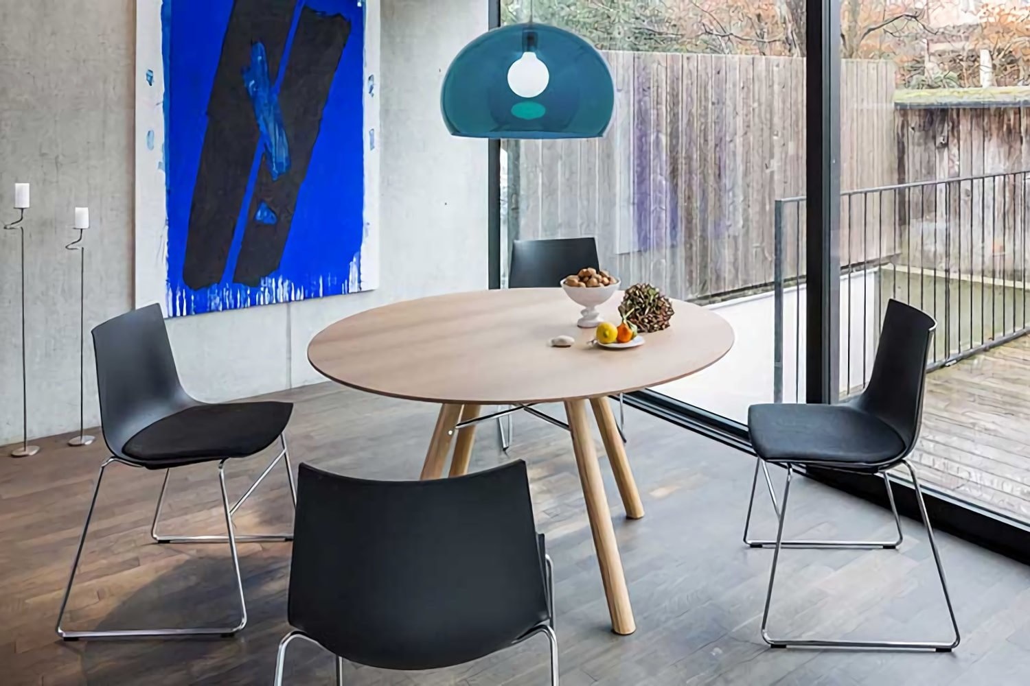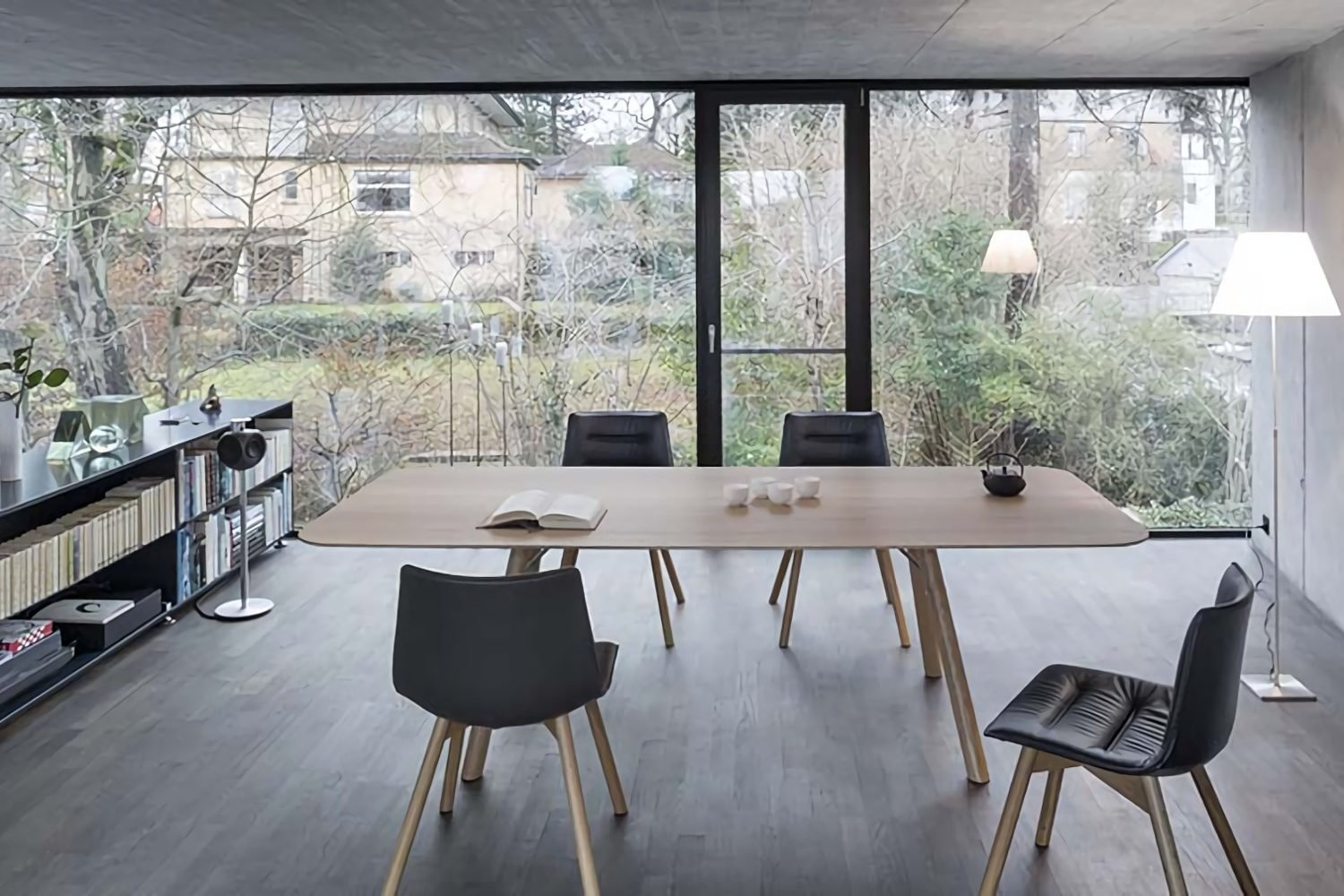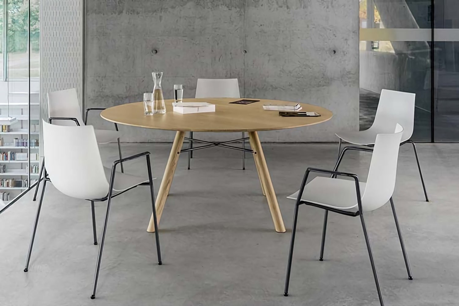 Girsberger Akio is een serie minimalistische tafels van massief hout voor de inrichting van kantoren, projecten en publieke ruimtes. De designtafels zijn verkrijgbaar in warm massief eiken of Amerikaans noten. Hiermee beantwoordt Akio aan de toenemende vraag uit de projectinrichtingsmarkt naar het gebruik van natuurlijke en authentieke materialen.Er is keuze uit verschillende vormen tafelbladen; rond, ovaal, vierkant of een rechthoekig blad met afgeronde hoeken in verschillende afmetingen. De randen van het blad lopen aan de onderzijde schuin af. Ook bij het onderstel zijn verschillende varianten mogelijk. De tafel is breed toepasbaar en kan gebruikt worden in vergaderruimtes tot lunchruimtes. Maar Akio is ook zeer geschikt als bureau en kan indien gewenst uitgerust worden met een mediabox voor het integreren van stopcontacten, netwerkaansluitingen en dergelijke. Eigenschappen Girsberger Akio massief houten tafel