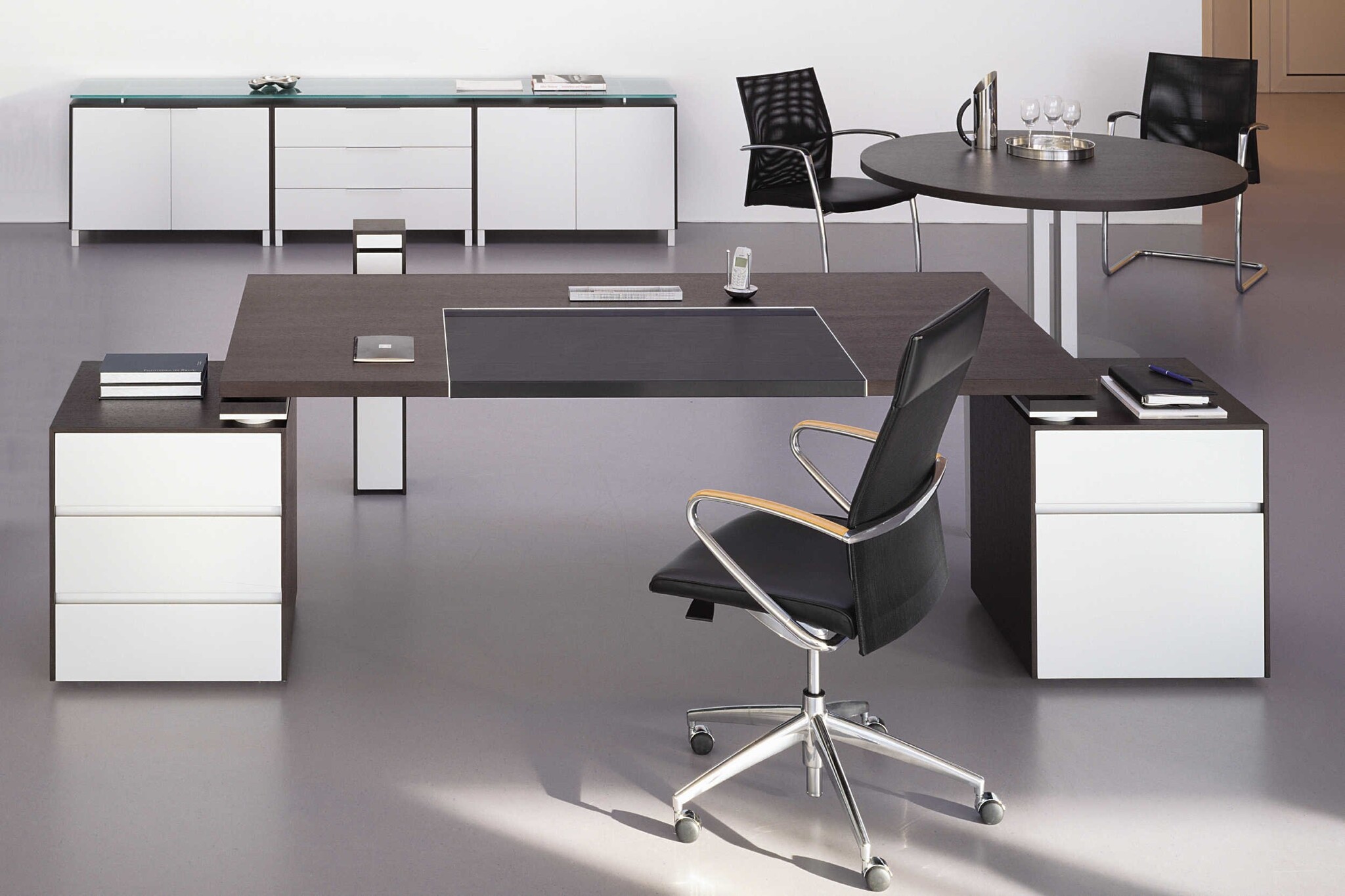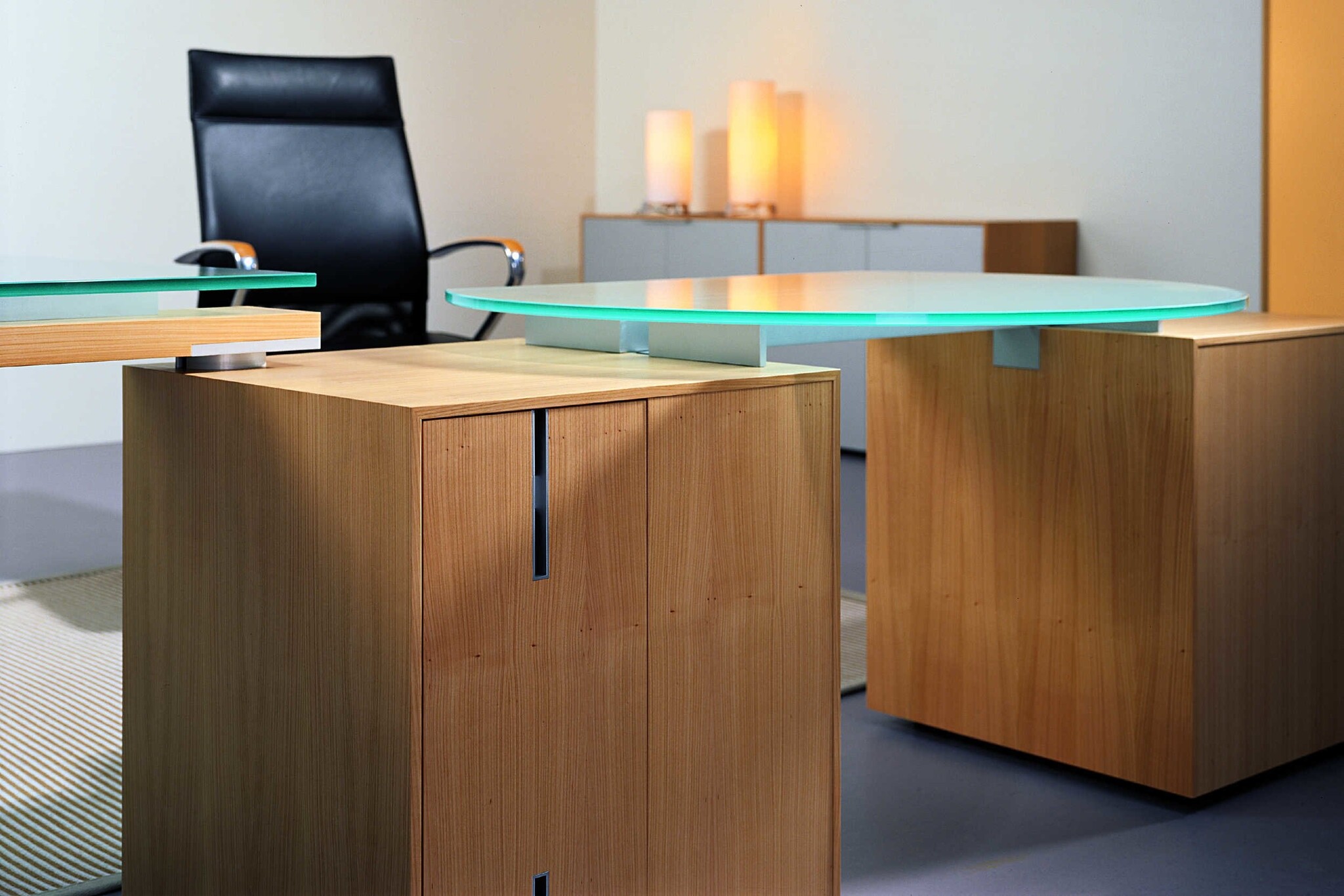 Tafelbladen: Fineer, 40 mm (bureaublad) of 30 mm (vergadertafel), helder glas of gesatineerd glas van 15 mm.