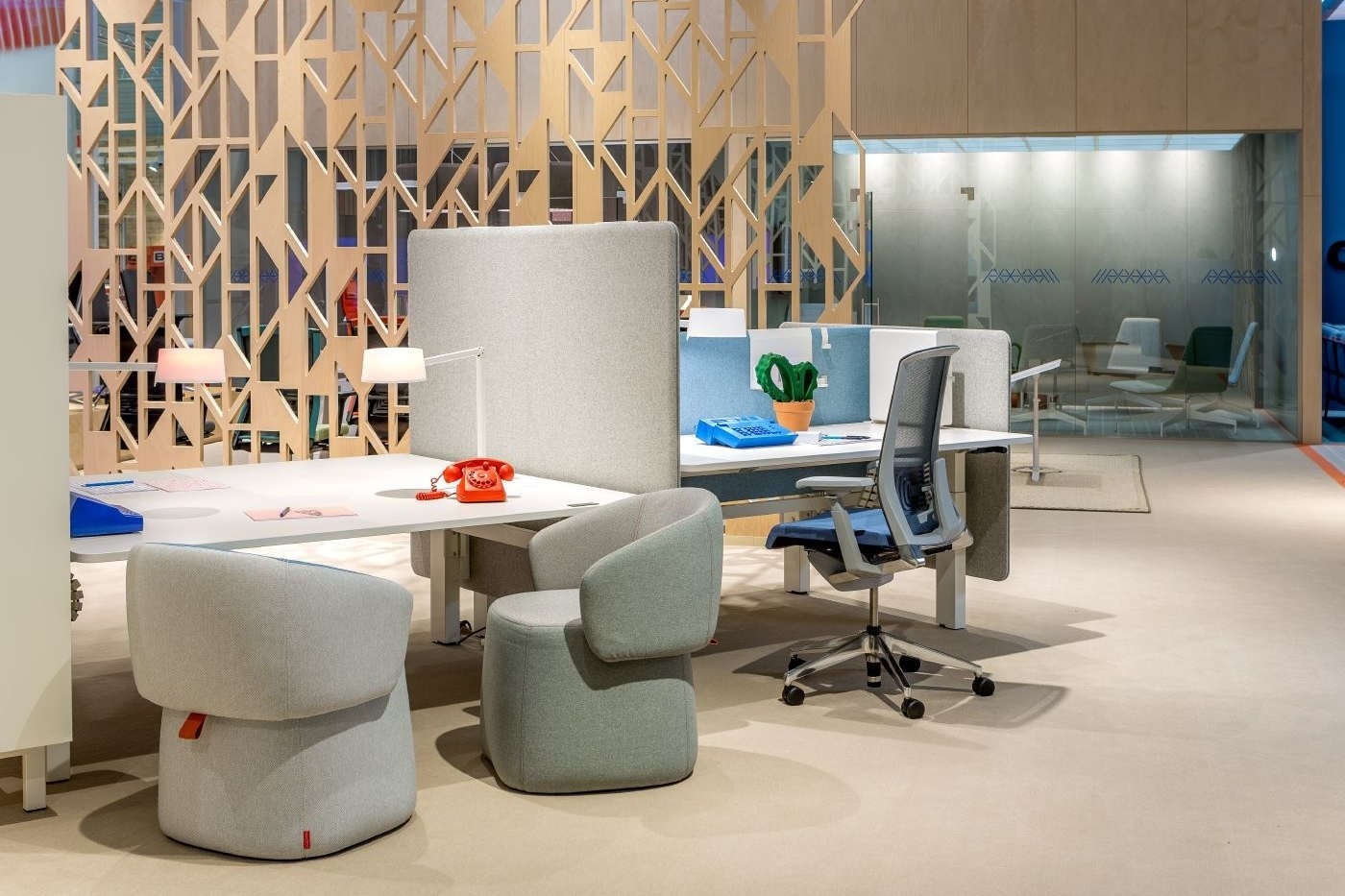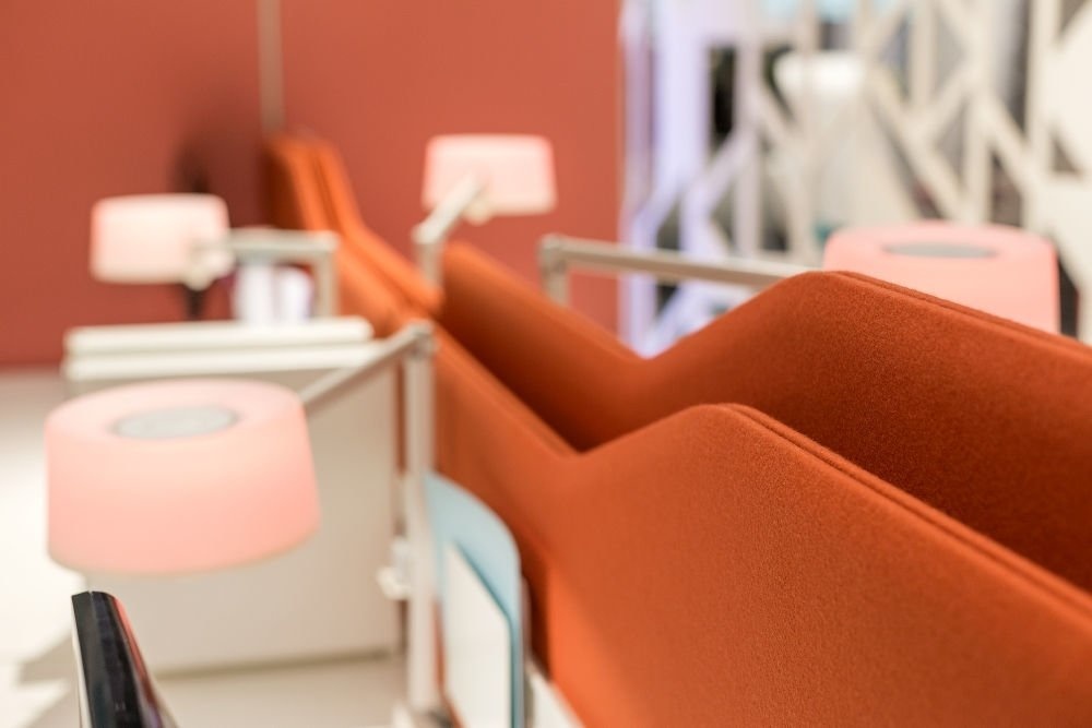Het Haworth YourPlace bureausysteem is ontworpen om de individualiteit van de gebruiker weer te geven door speels met kleuren van de akoestische schermen te spelen Voor elk wat wilsDe Haworth YourPlace biedt naast de werkplekken, die ook in hoogte verstelbaar zijn, leuke gadgets zoals een draadloze (telefoon)oplader en magneetborden voor persoonlijke notities.
