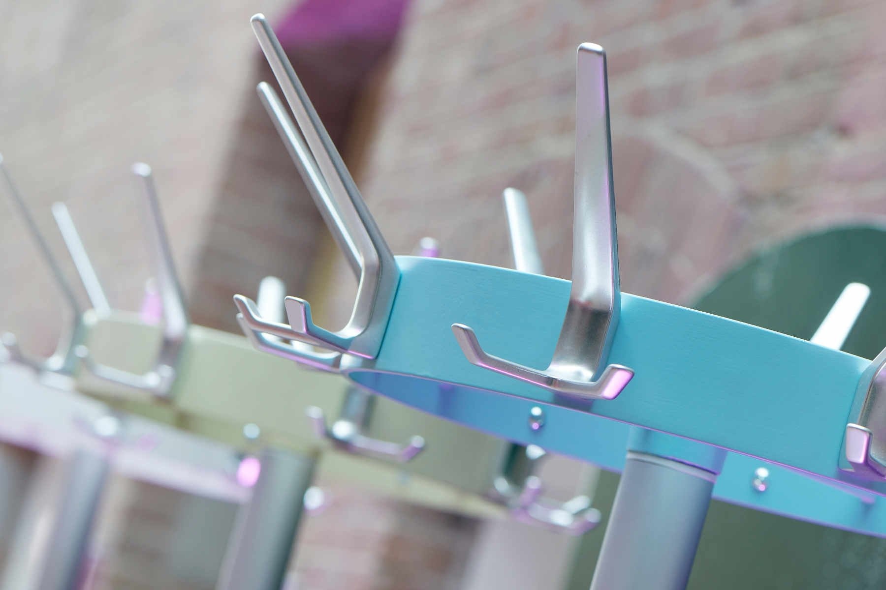 De kapstok heeft een ronde kroon van gegoten aluminium.