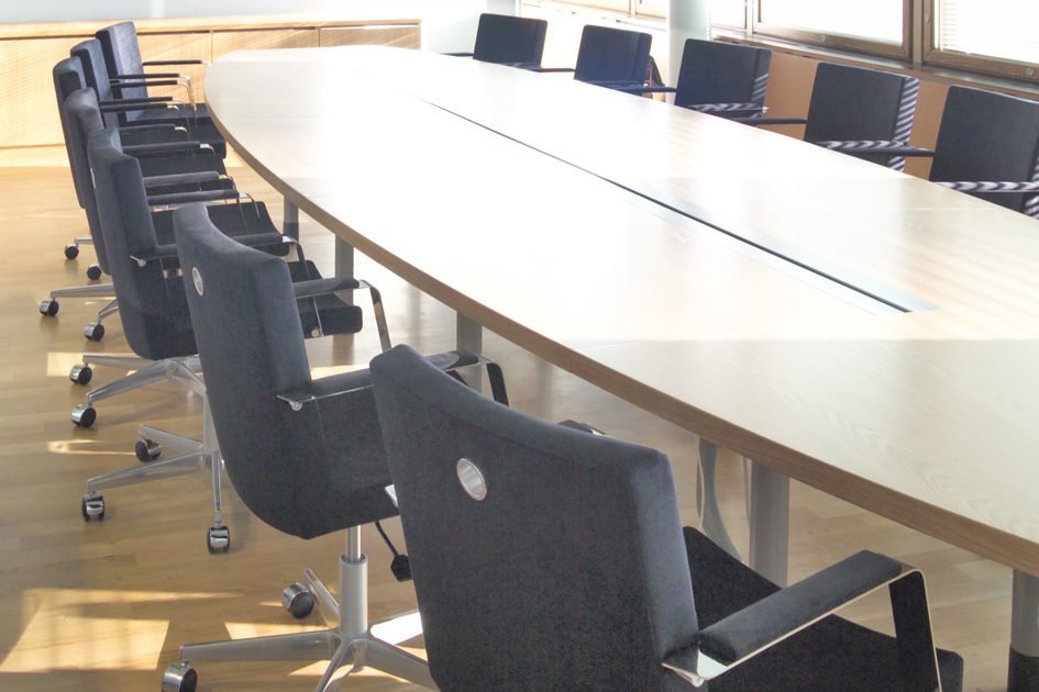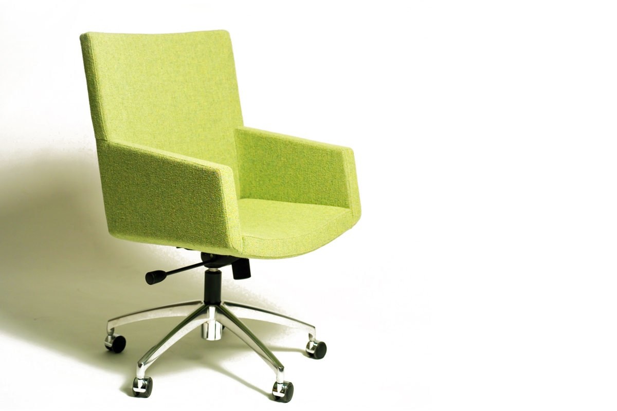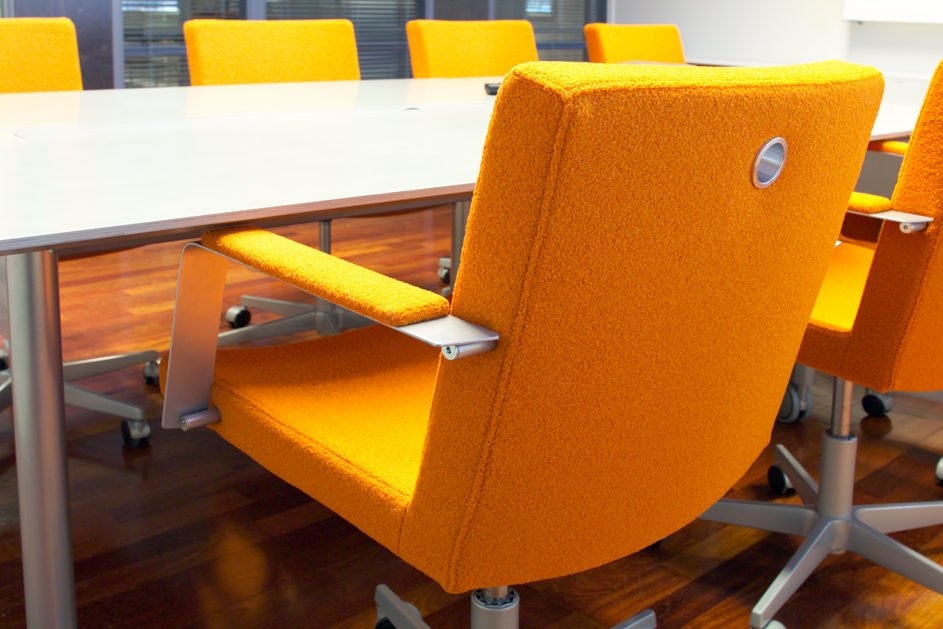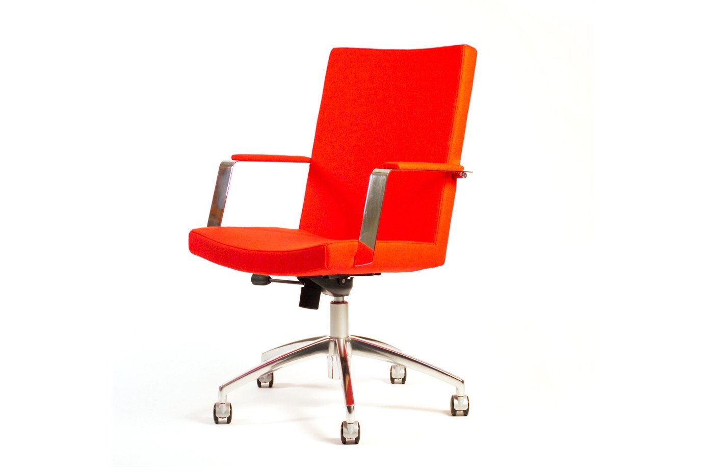 een bureaustoel met sterpoot, voorzien van wielen en deels of volledig gestoffeerde armleuningen (de Select Meeting),