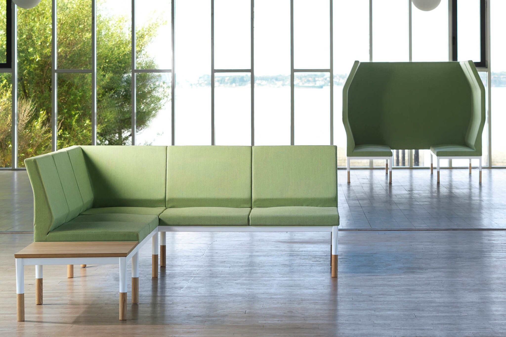 Door de hoge rug bieden de fauteuils en banken akoestische oplossingen voor luidruchtige ruimtes.