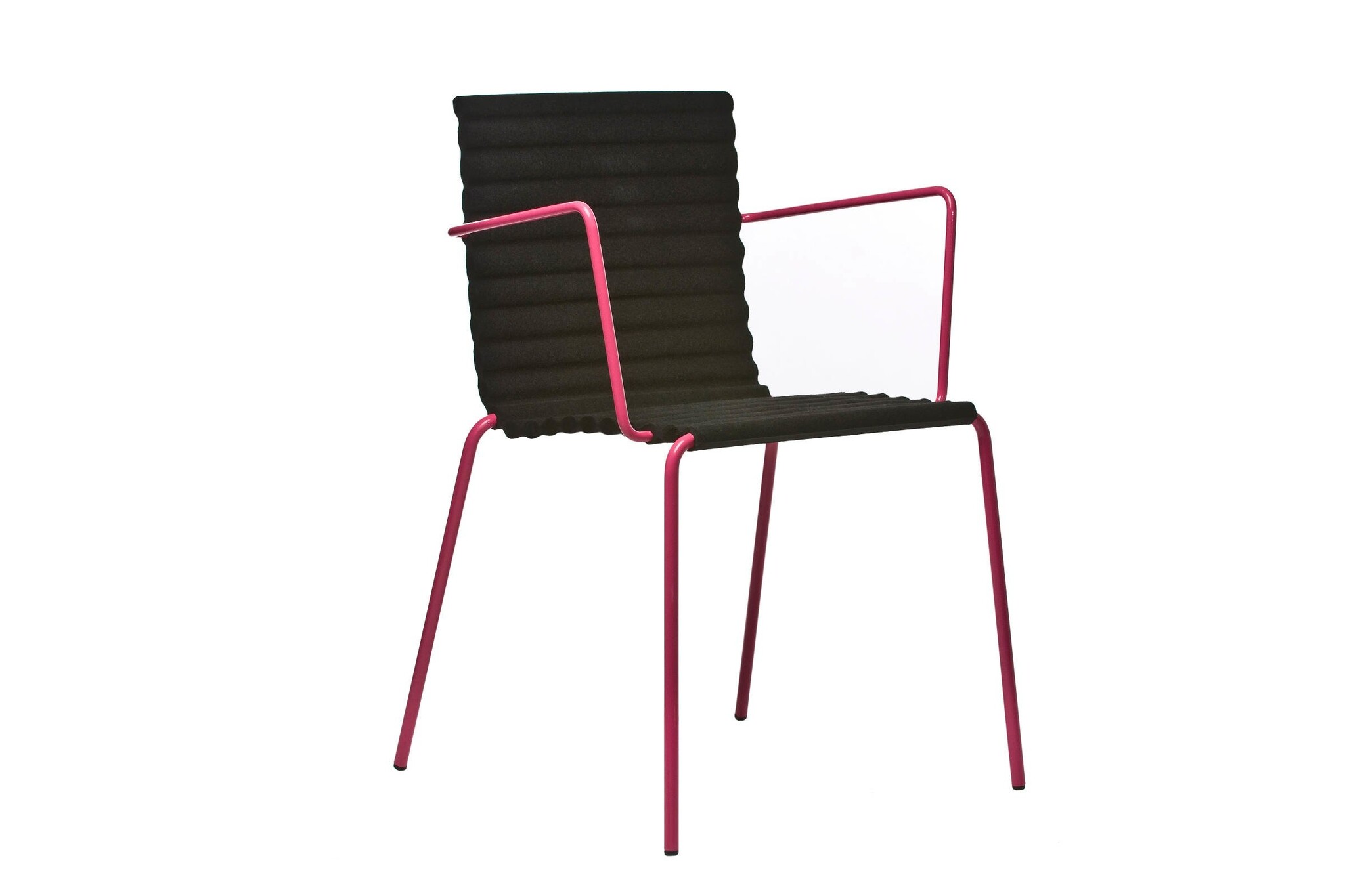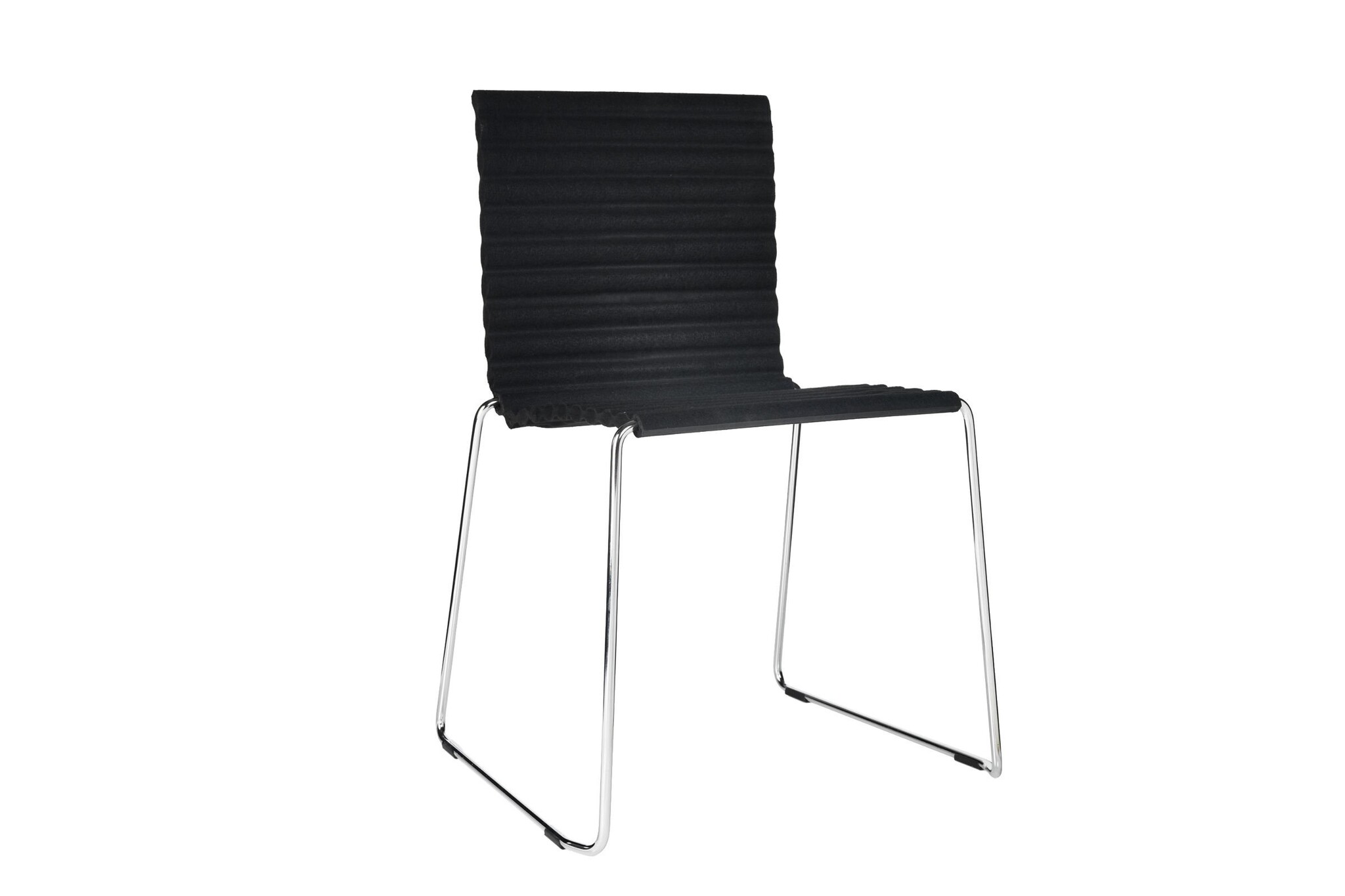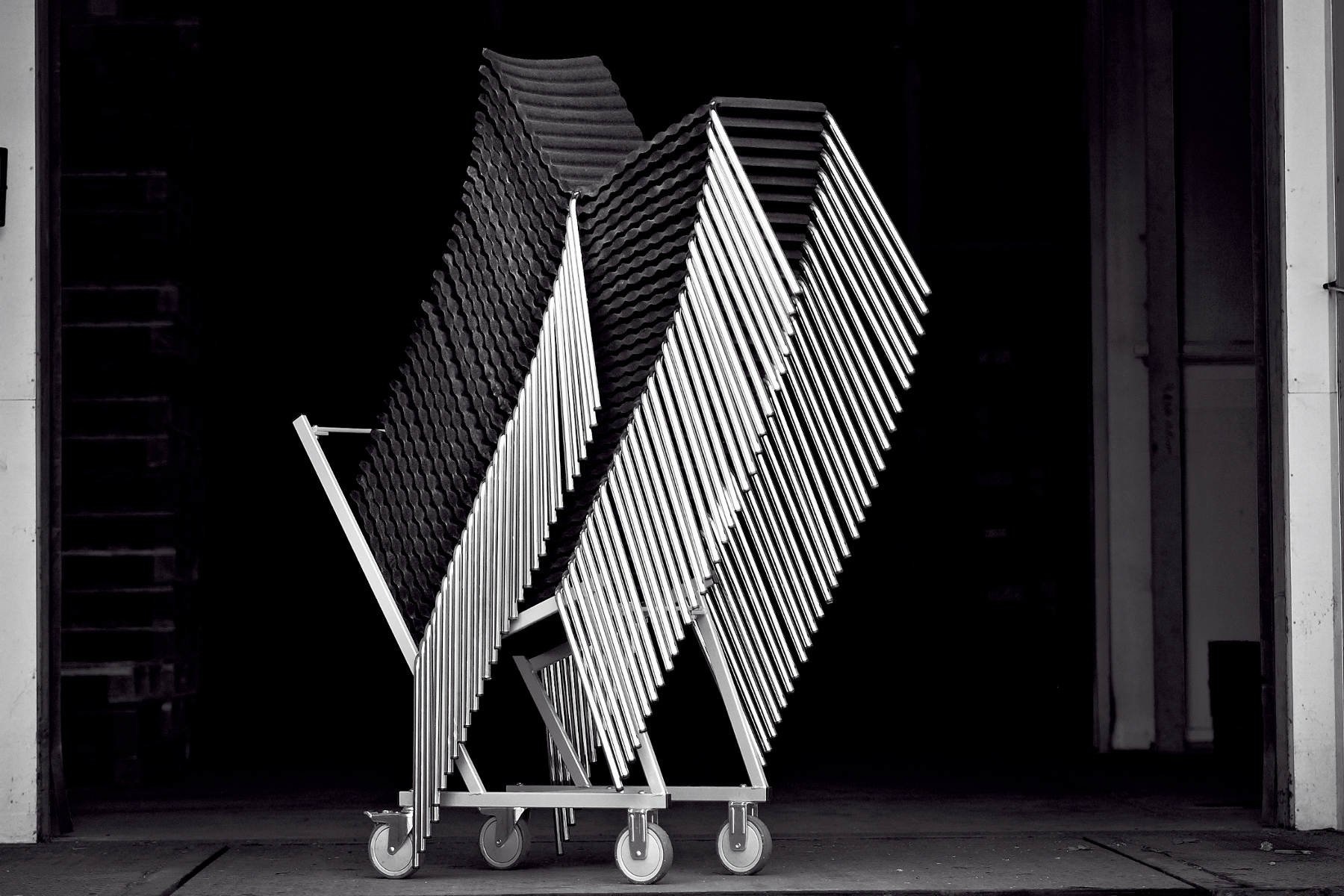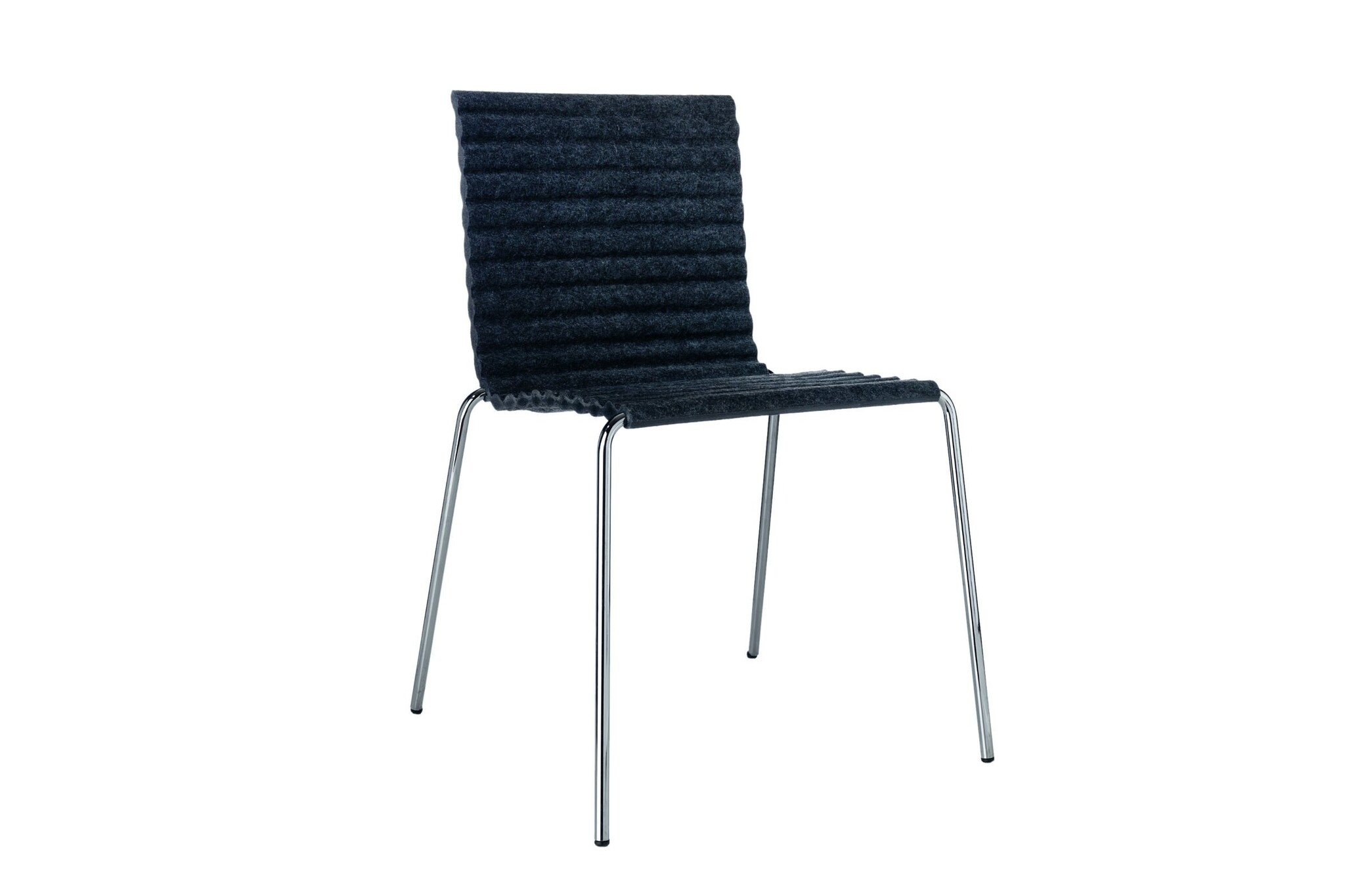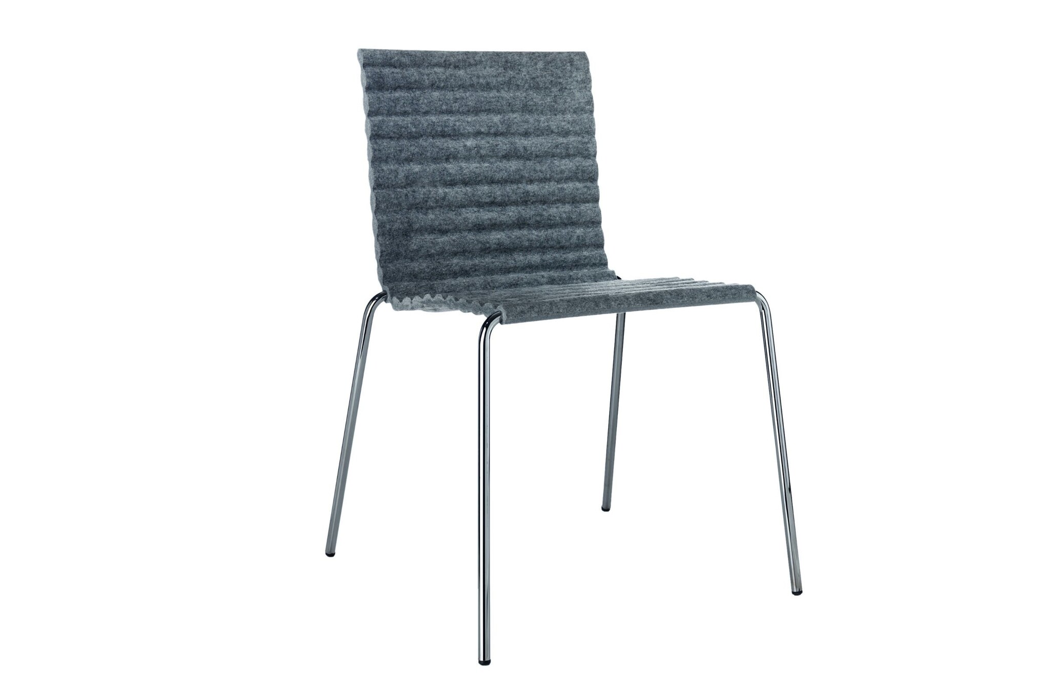 Het geperste vilt is vervaardigd van gerecyclede plastic PET-flessen en is leverbaar in de volgende kleuren: zwart / licht grijs / donker grijs. Het frame is van chroom Satin en leverbaar in meer dan 200 RAL kleuren. Optioneel is een stapelwagen om zo de gestapelde Rib stoelen te verplaatsen leverbaar.