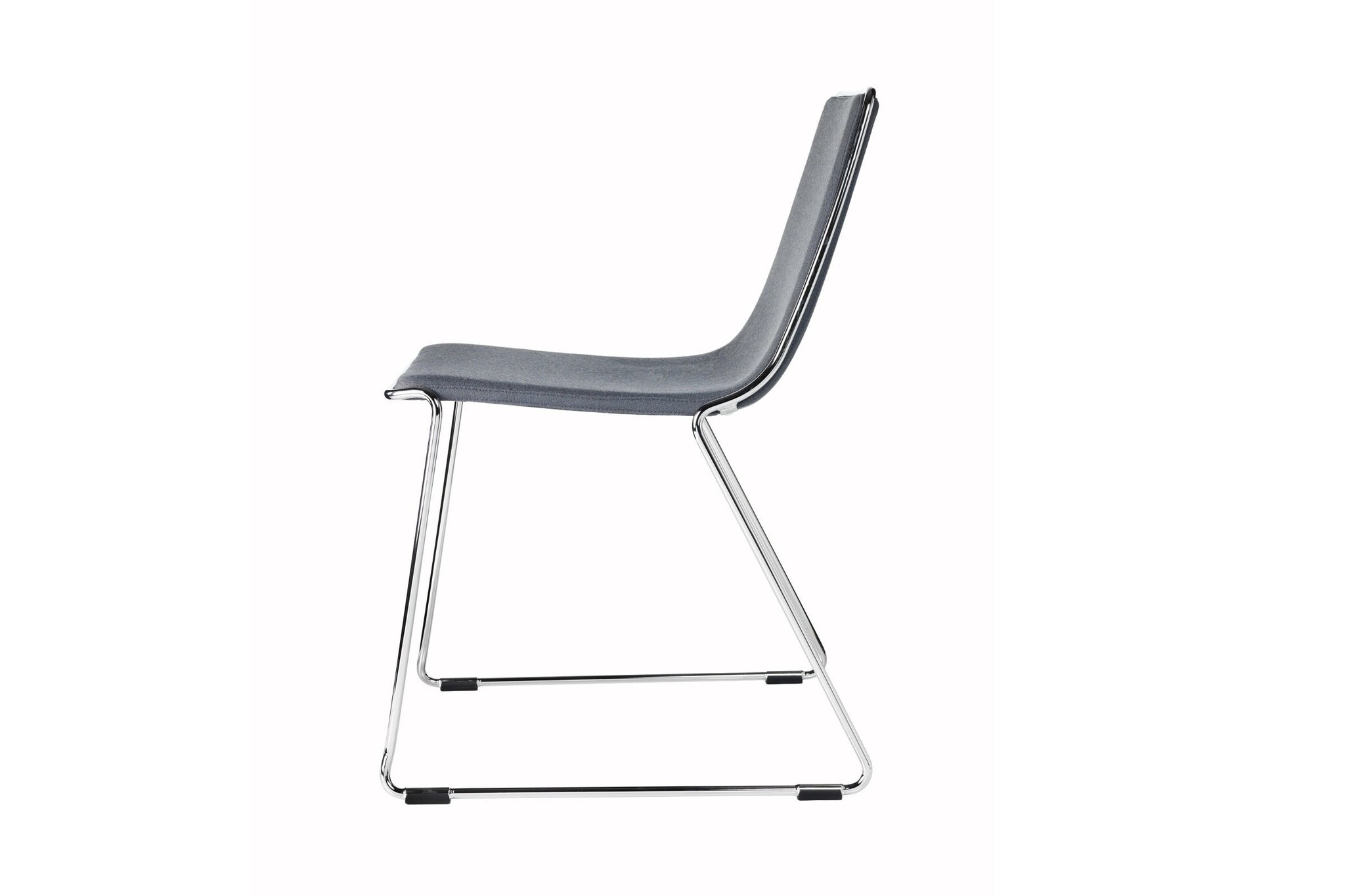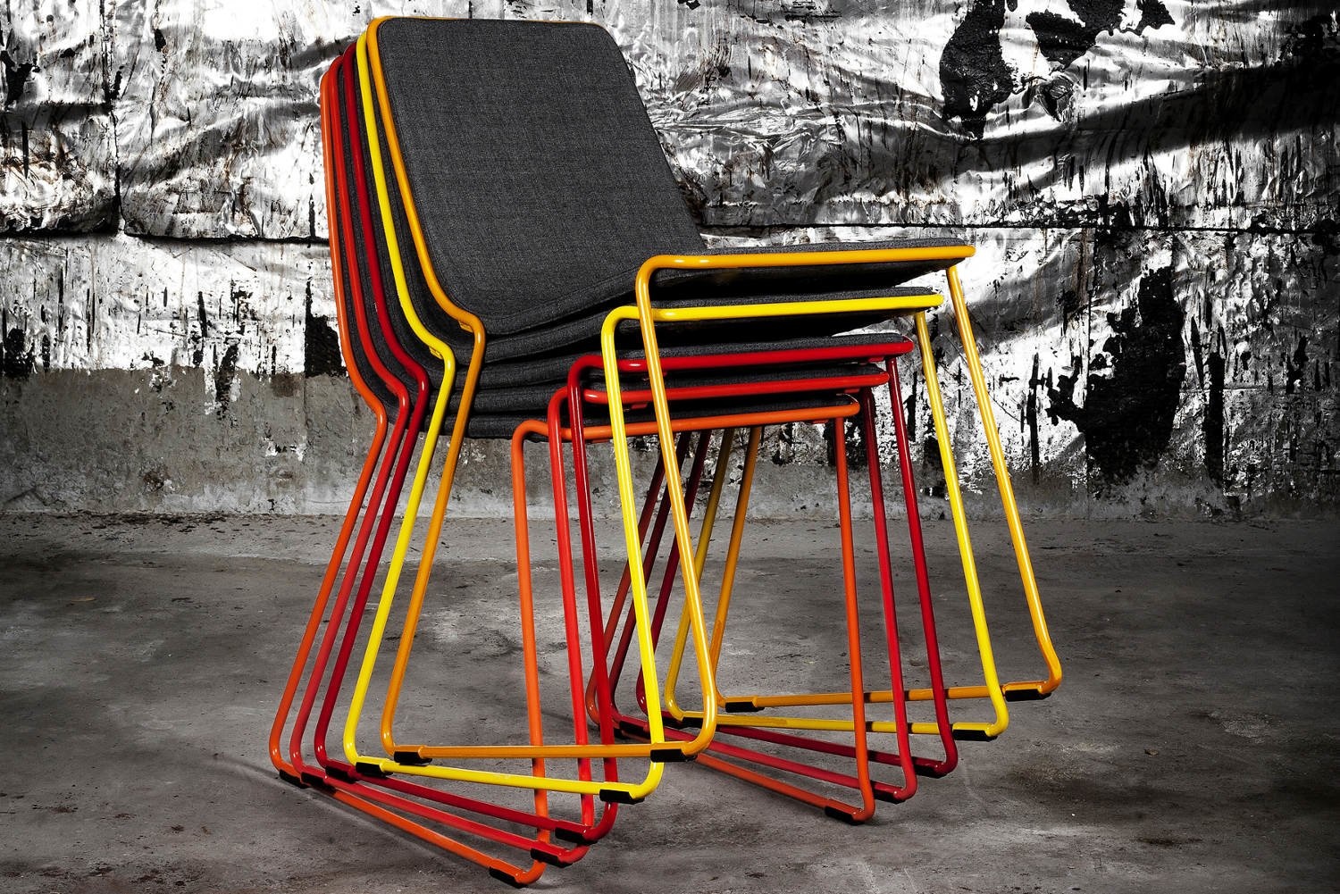 Het frame is van chroom en leverbaar in meer dan 200 RAL kleuren en de stoel is te bekleden in 160 verschillende stoffen.