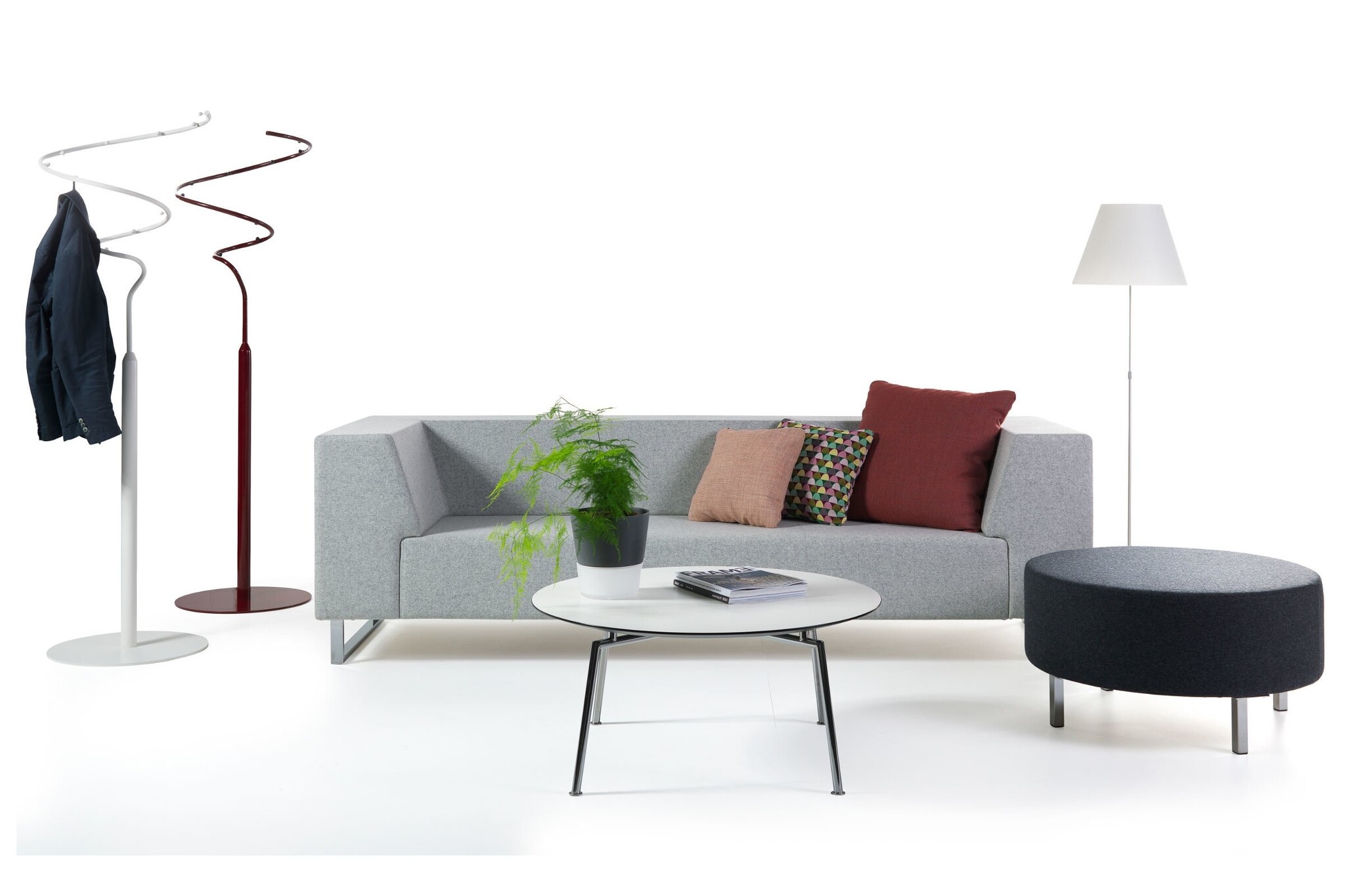 Het frame is in chroom / RAL (207) en de banken zijn te bekleden in verschillende stoffen. Voor de ultieme afwerking is er een keuze uit 8 verschillende poten.