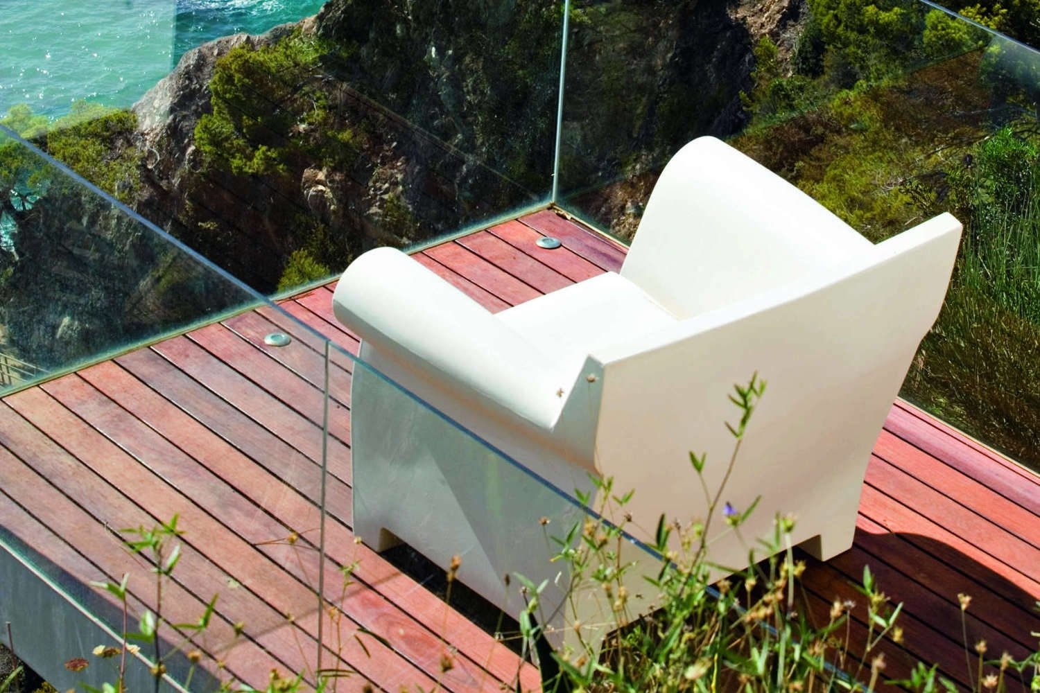 De bank is gemaakt van gekleurd polyethyleen.