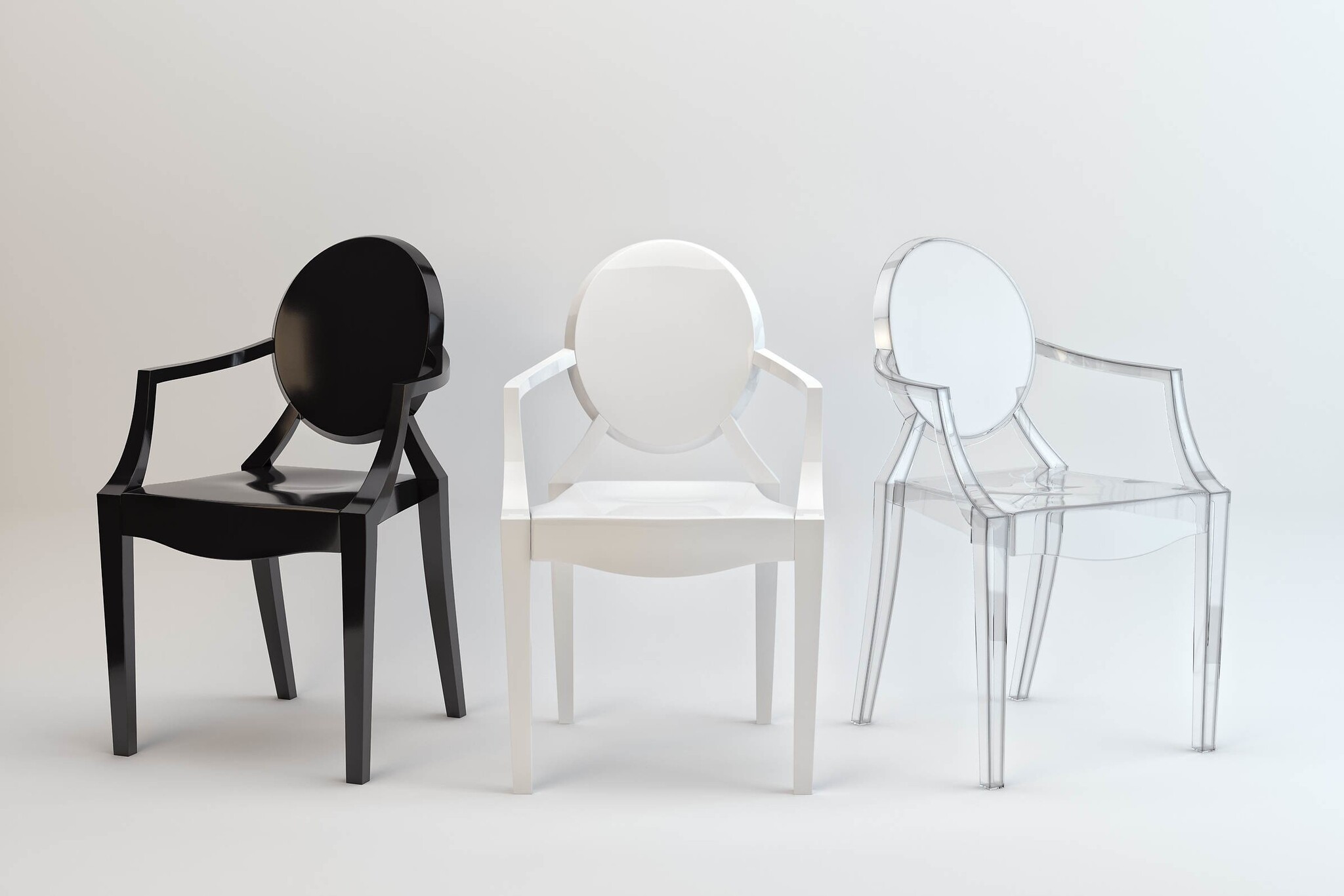De Louis Ghost is de eerste transparante stoel ter wereld in plastische materialen die ook beschikbaar is in een brandvrije versie.