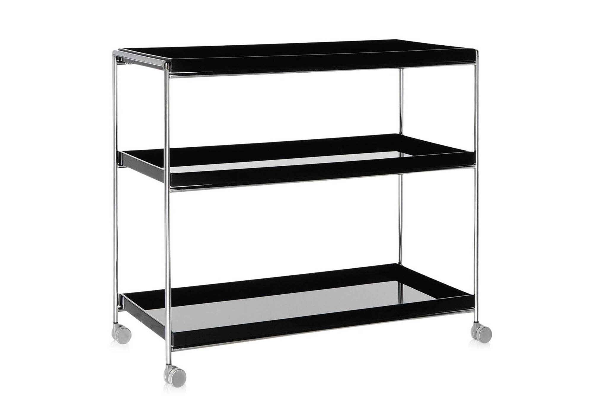 Er is ook een vierkante uitvoering van 80 x 80 cm. De bladen zijn wit of zwart en de ondersteunende structuren zijn van verchroomd staal. Dankzij de mogelijkheid om de metalen structuur weg te halen, dankzij een speciale hoekverbinding om het op zijn plaats te houden, is het verpakte product volledig vlak, waardoor vervoeren en opslaan handiger is. Ook bij het Trays-systeem hoort de trolleyuitvoering op wielen met drie bladen boven elkaar van 80 cm, of van 140 cm als boekenkast.