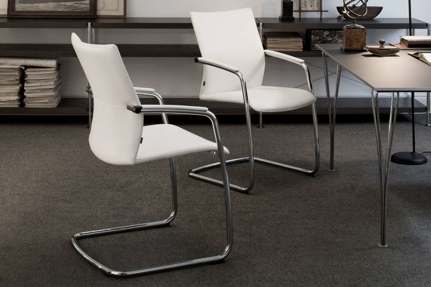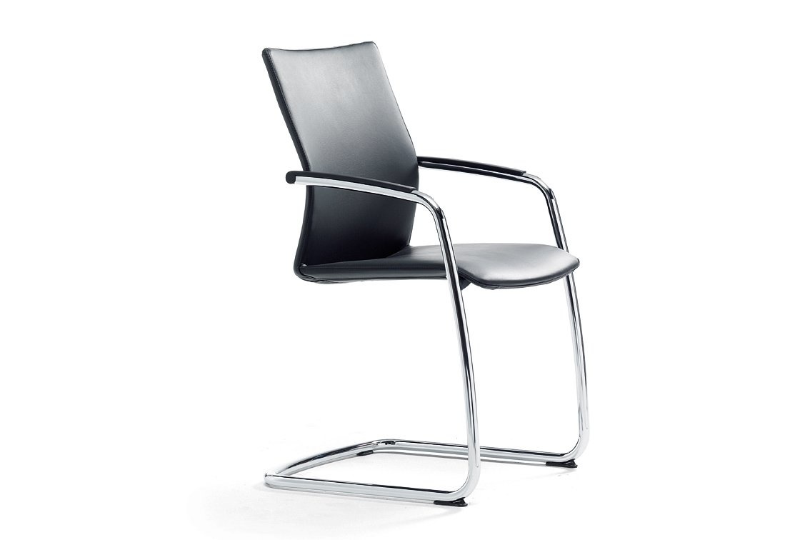 Een slanke vorm ook voor gasten. De onzichtbare netbespanning onder de zitting en rug zorgen voor meer zitcomfort. Het elegante sledemodel biedt ook bij lange vergaderingen comfortabel zitgenot.