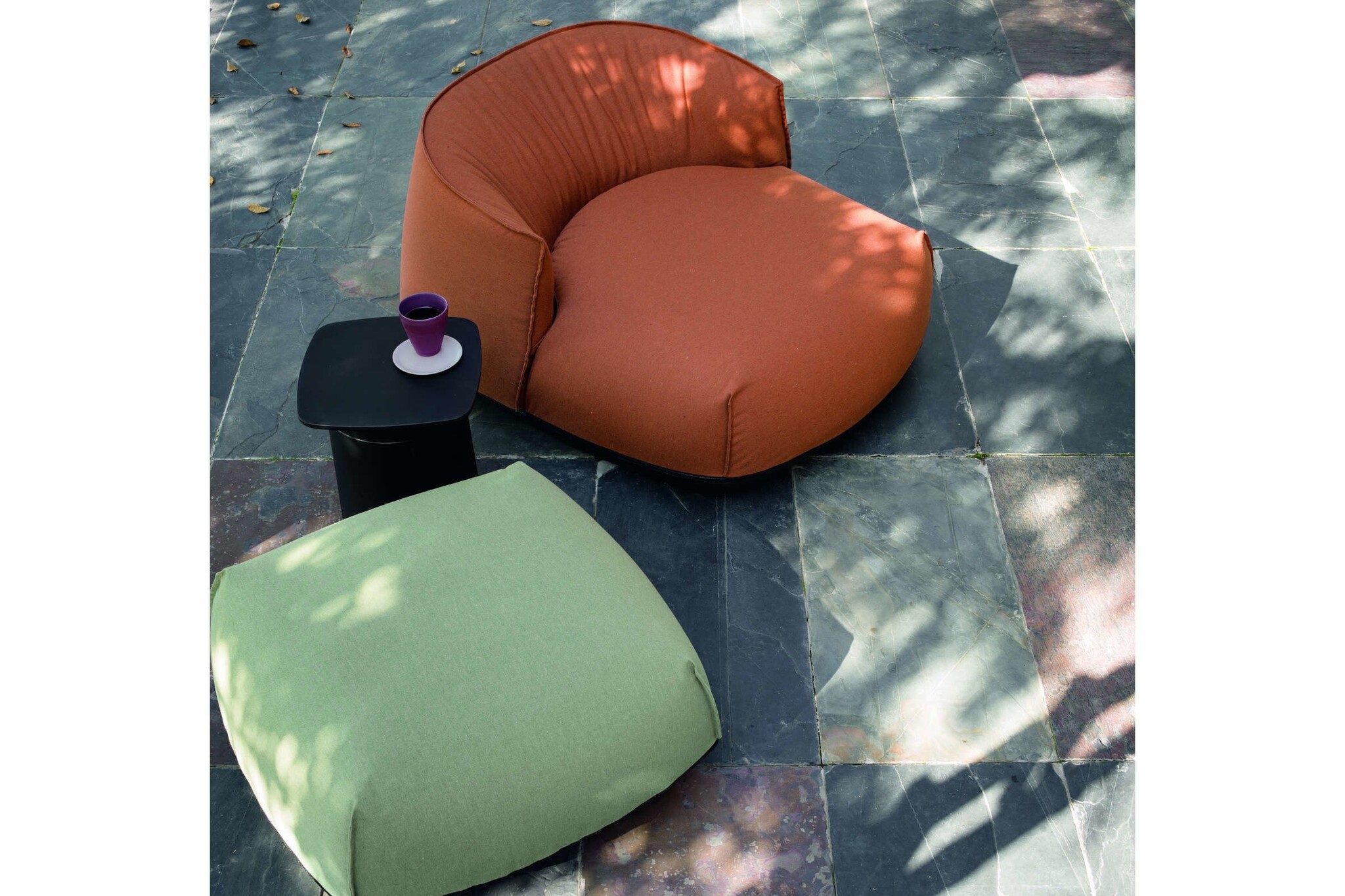 De poef is licht en gemakkelijk te verplaatsen en kan worden gebruikt om talloze composities buitenshuis te creëren samen met de loungefauteuils en te experimenteren met verschillende vormen, kleuren en maten.