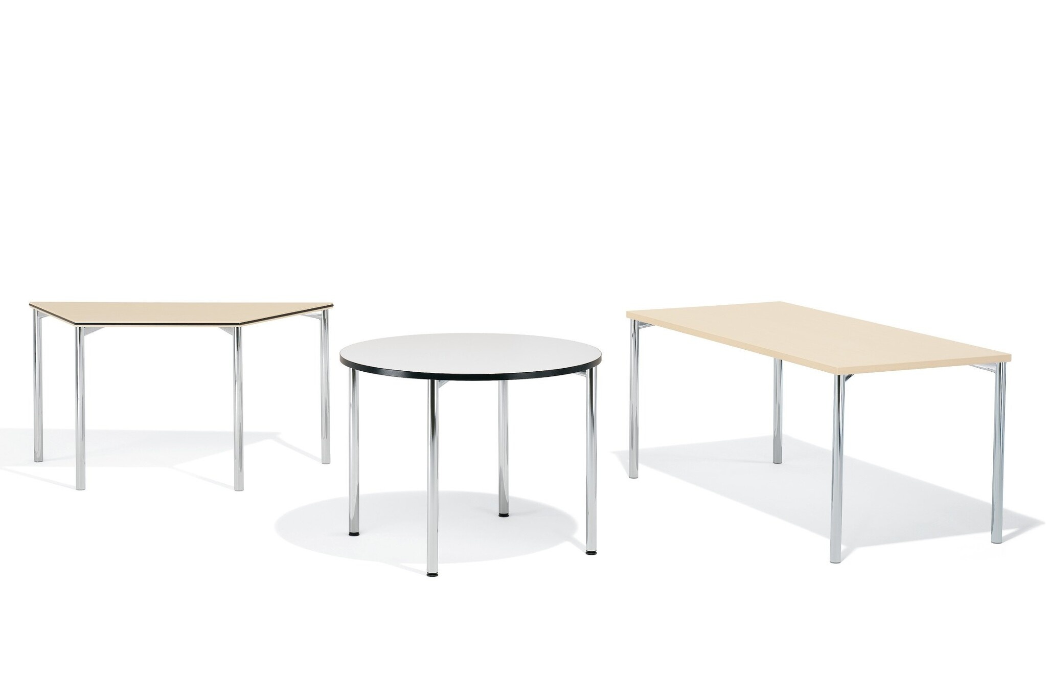 Kusch 3050 tafelserie bestaat uit simpele, praktische tafels met vierkante, rechthoekige, trapeziumvormige, ronde en halfronde tafelbladen. De tafels kunnen snel en op eenvoudige wijze aan elkaar gekoppeld worden om een opstelling naar wens te maken. Handig voor horeca gelegenheden maar ook prima voor conferentie- en vergaderruimtes. De poten zijn aan het tafelblad vastgeschroefd en voorzien van kunststof glijders. Het frame is standaard maar kan eventueel ook glanzend of zijde mat verchroomd worden. Om de tafels te verplaatsen zijn de poten optioneel met twee verborgen wielen verkrijgbaar. Direct uit voorraad leverbaar twee grote tafelopstellingen speciaal voor een conferentie- of vergaderruimte. Mooi afgewerkte tafels uitgevoerd in houtfineer en zijde mat verchroomde poten. De opstellingen kunnen eenvoudig kleiner gemaakt worden door er een tafelblad blad tussenuit te halen.Kusch specificaties grote tafelopstellingen