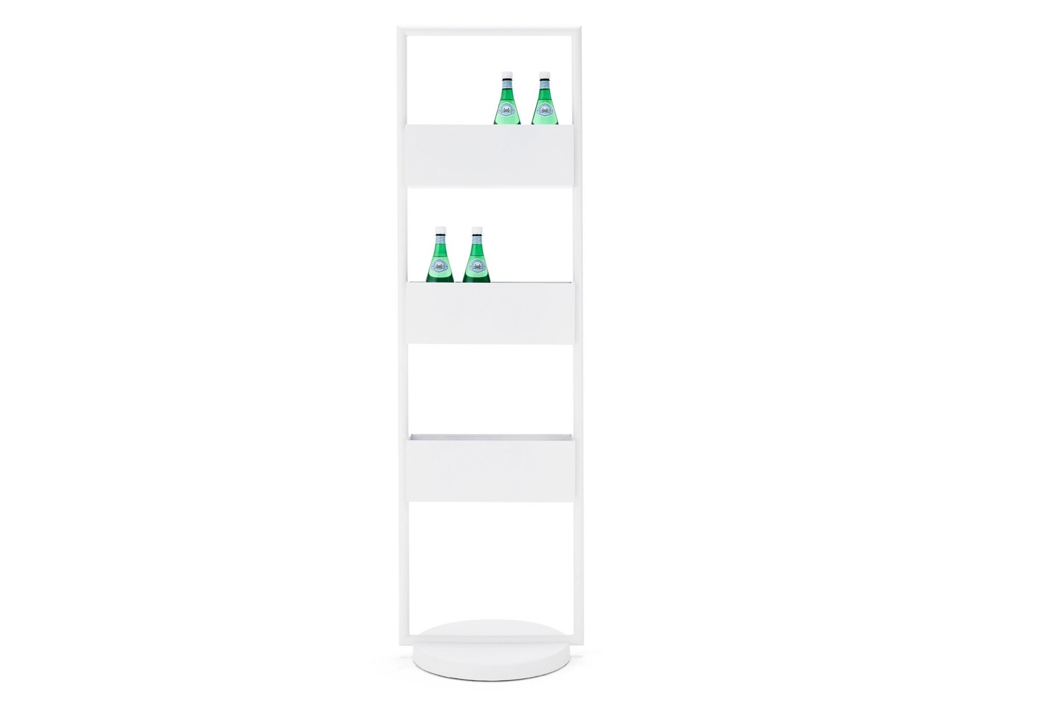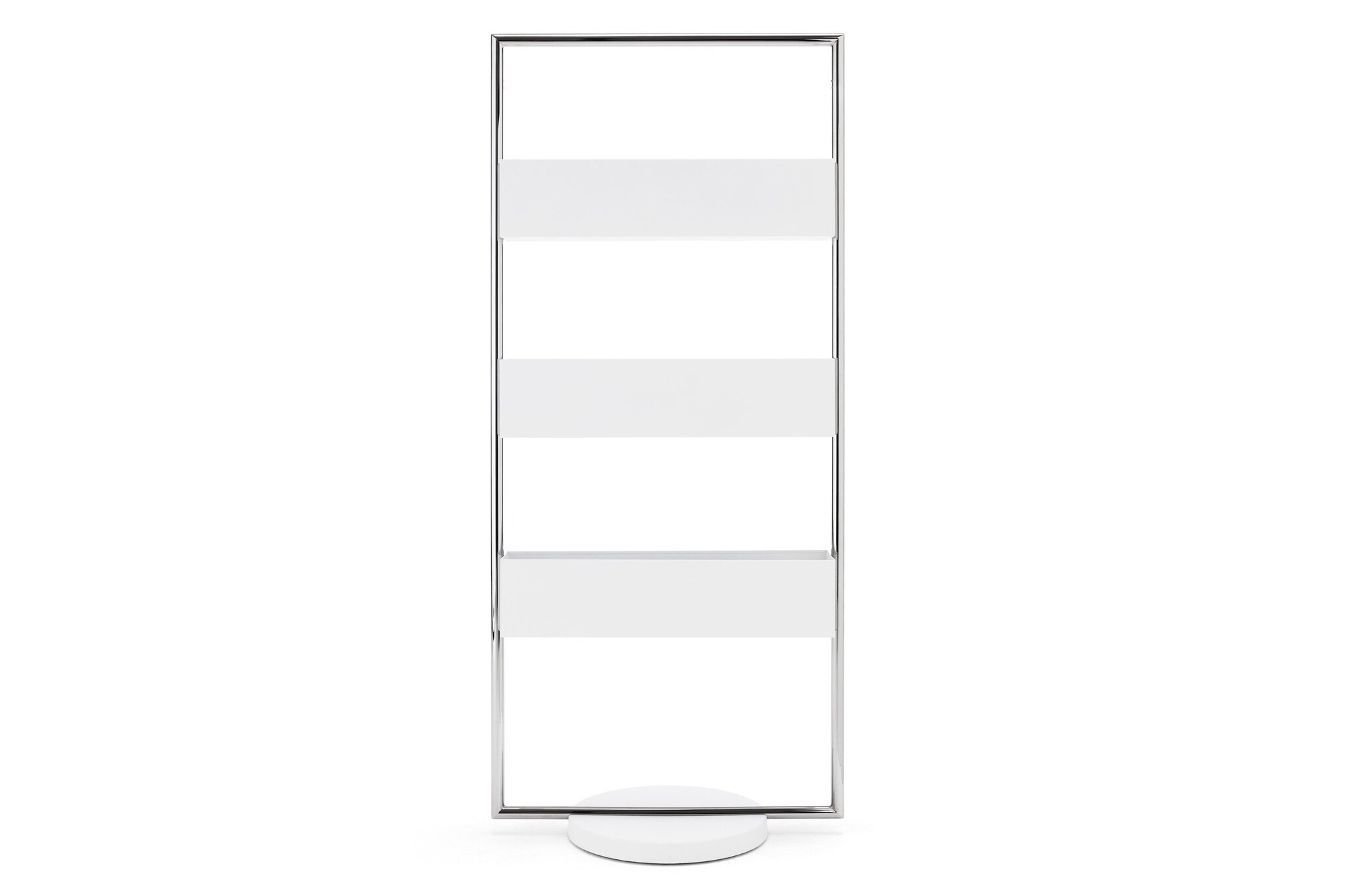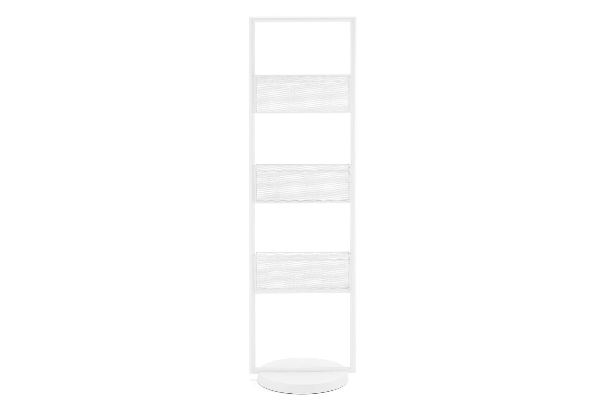 Het Magazinerack heeft een voetplaat van gegoten ijzer in structuur poedercoating, zwart of wit, voorzien van verstelbare voetjes. Deze is optioneel met draaibare voetplaat te verkrijgen. De brochurestandaard heeft een frame van 28 mm stalen buizen in poedercoating of verchroomd, breedte 50 of 75 cm. Magazinerack wordt incl. 3 stuk boxen van gepoedercoat geperforeerd ijzer geleverd.