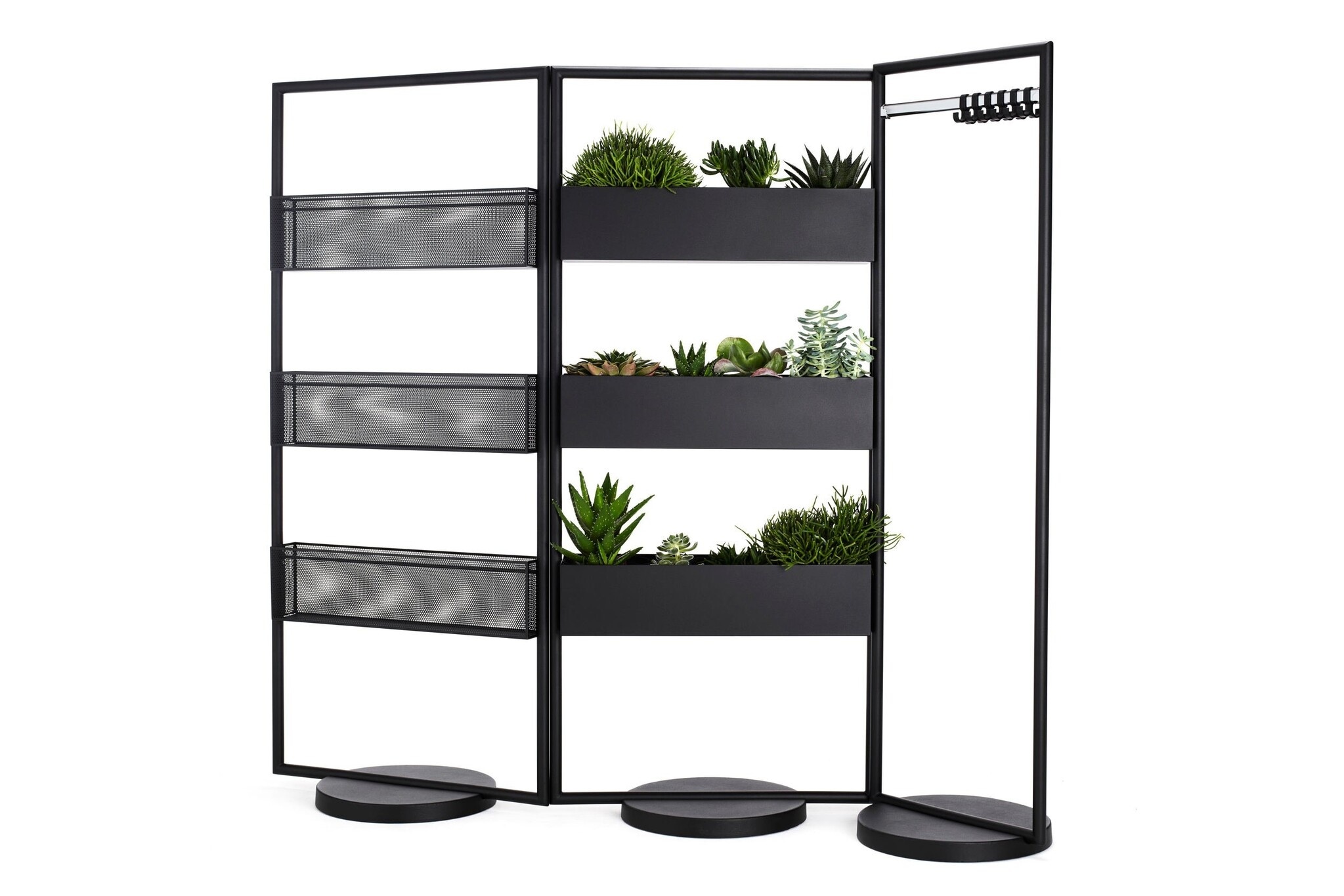 Het Storagerack heeft een voetplaat van gegoten ijzer in structuur poedercoating, zwart of wit, voorzien van verstelbare voetjes. Optioneel met een draaibare voetplaat. Het is voorzien van een frame van 28 mm stalen buizen in poedercoating of verchroomd, breedte 50 of 75 cm. Storagerack wordt incl. 3 stuks boxen van gepoedercoate metaal geleverd. Eventueel met plastic pot voor planten te verkrijgen.