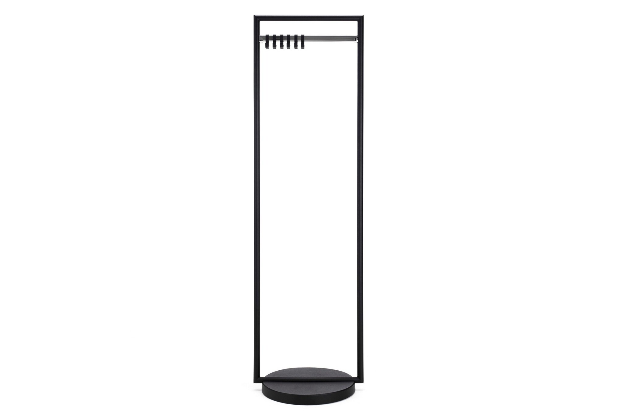 De Coathanger heeft een voetplaat van gegoten ijzer in structuur poedercoating, zwart of wit en is voorzien van verstelbare voetjes. Deze is optioneel leverbaar met een draaibare voetplaat. De kapstok is voorzien van een frame van 28 mm stalen buizen in poedercoating of verchroomd, breedte 50 of 75 cm. De kledingroede is gemaakt van verchroomd ovale stalen buizen van 30x15 mm of in natuurlijke essen. Haken zijn beschikbaar in zwart of wit polyamide.