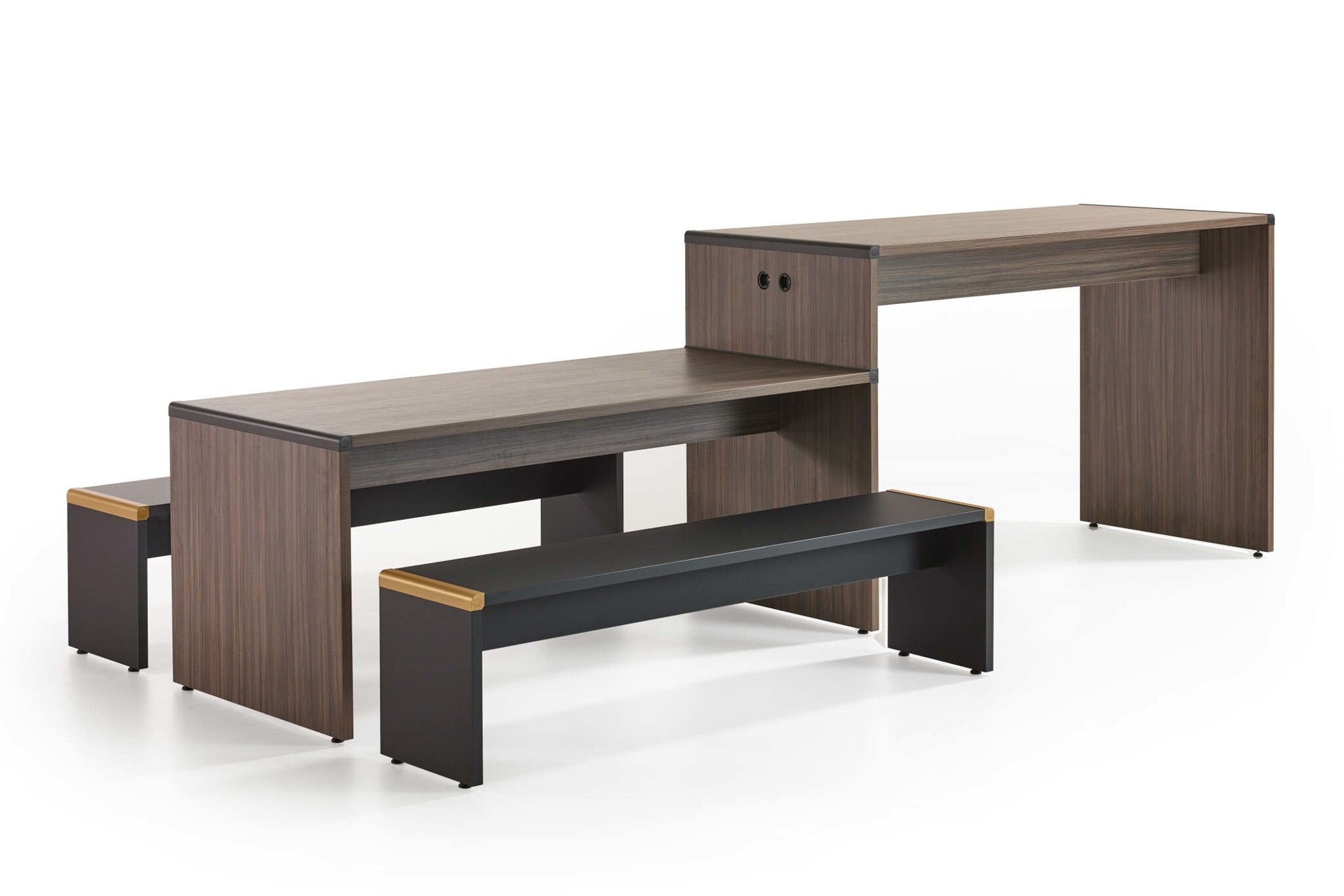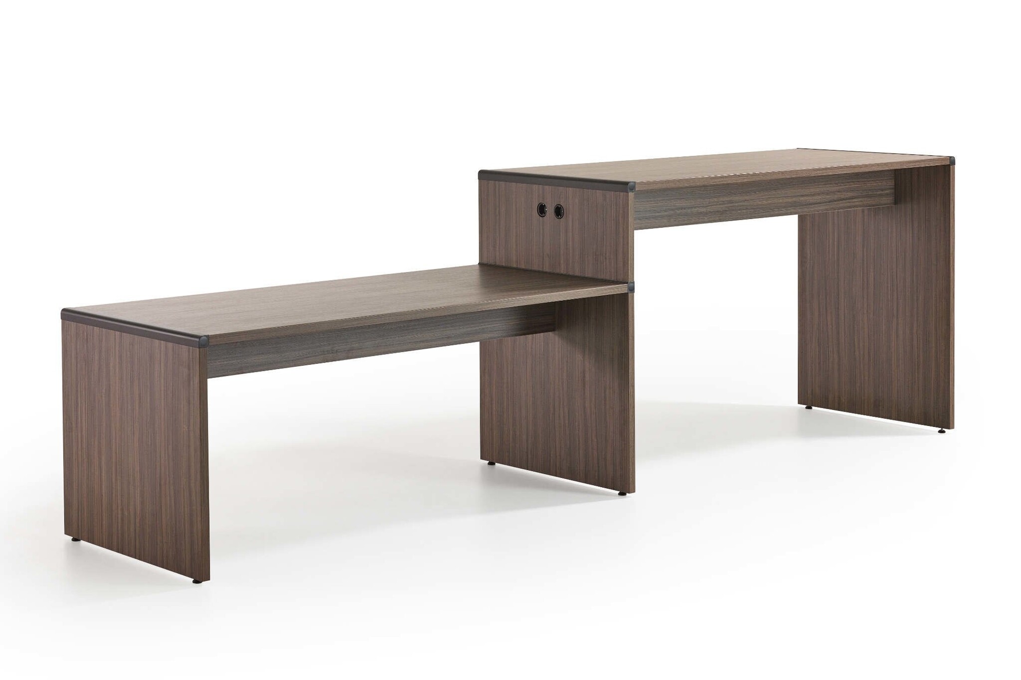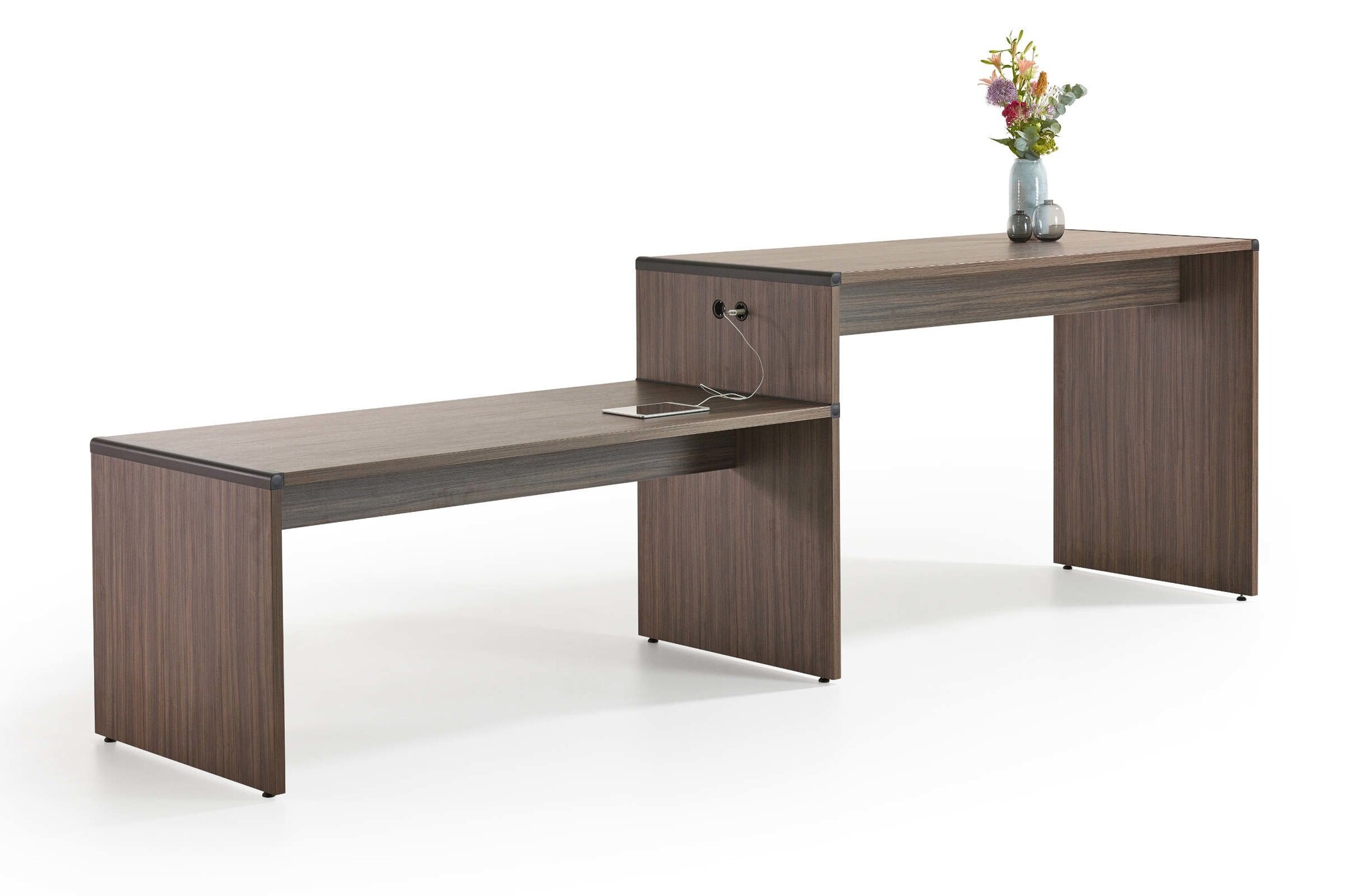 De toplaag van het blad is in laminaat of fineer. Randafwerking: transparant gelakt, recht gefreesd. Stelvoeten: standaard.