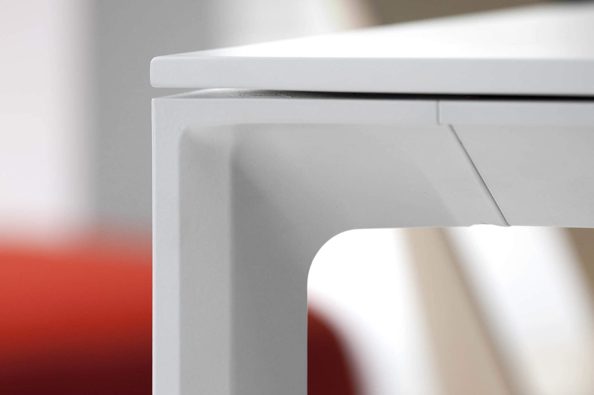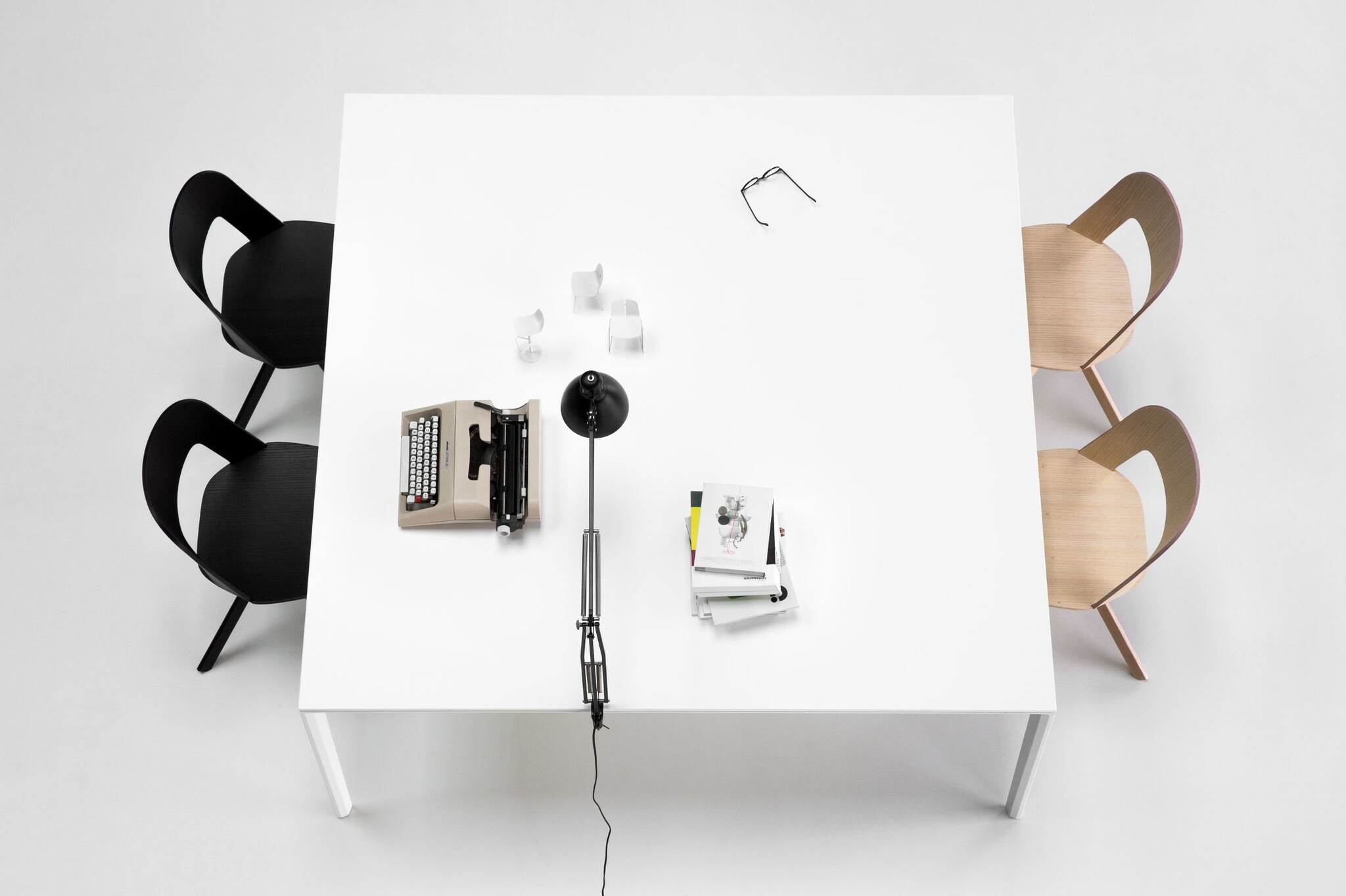 Verkrijgbaar met een tafelblad in Fenix HPL, wit gelakt hout of gebleekt eik.