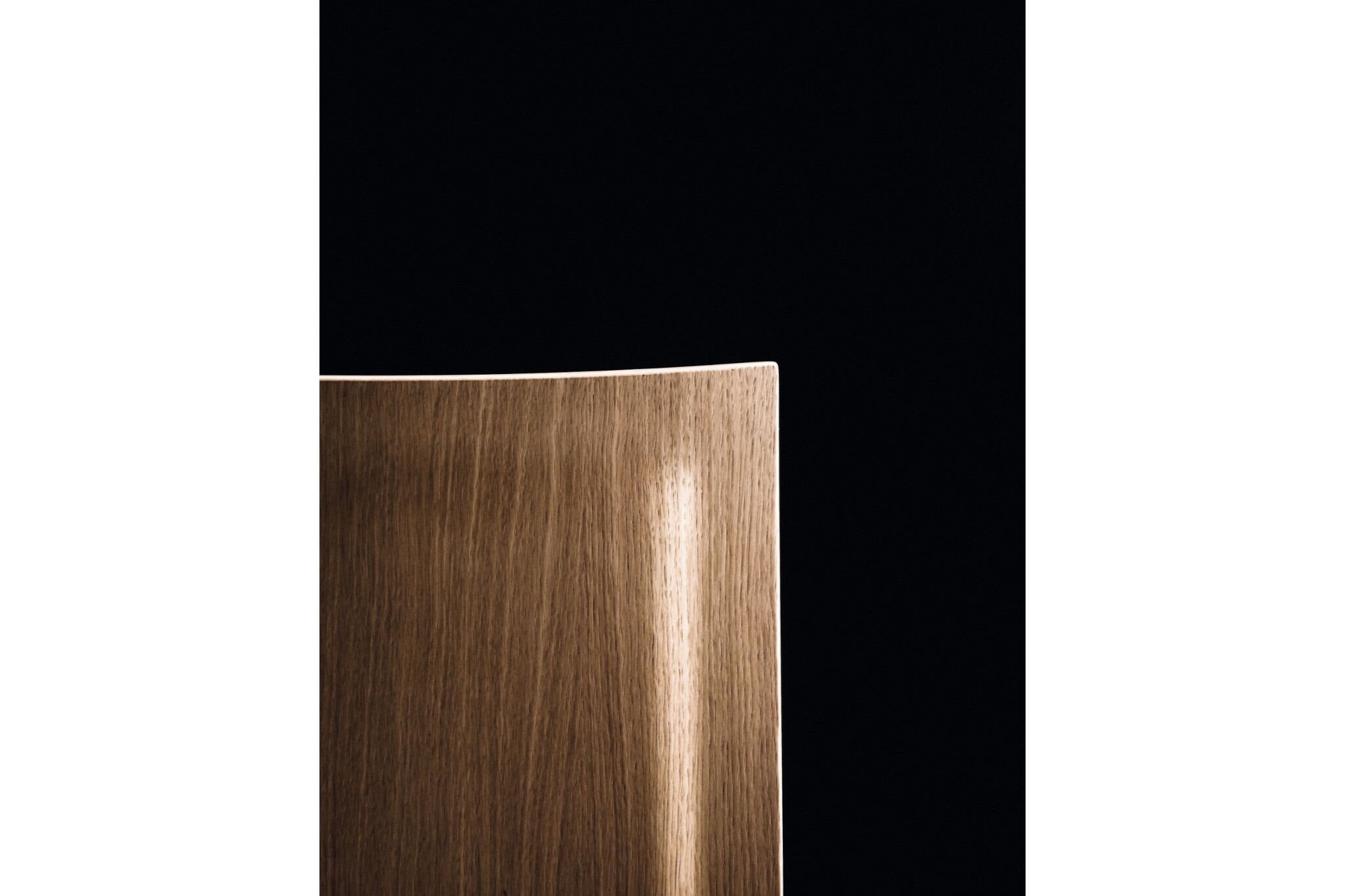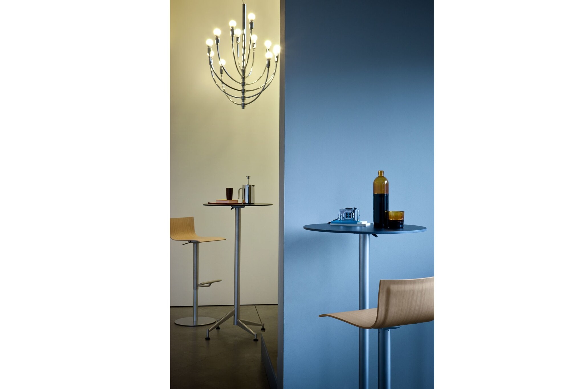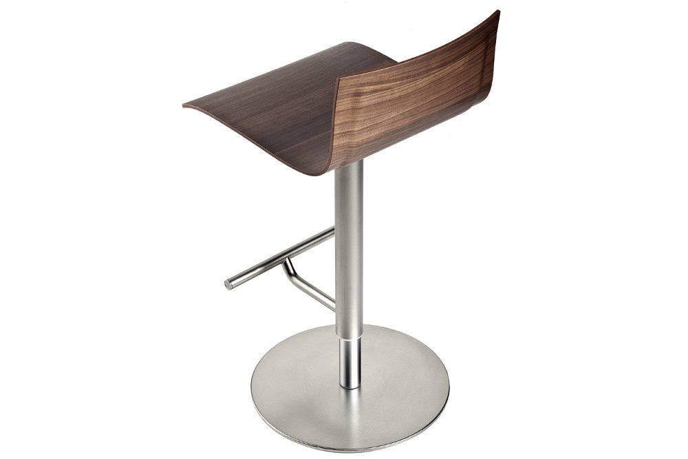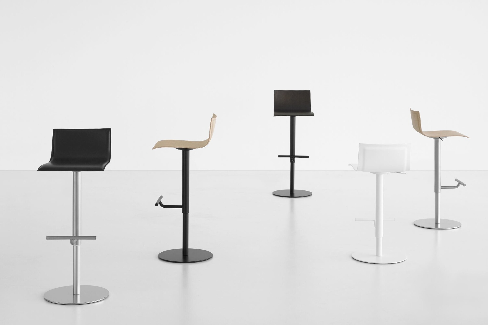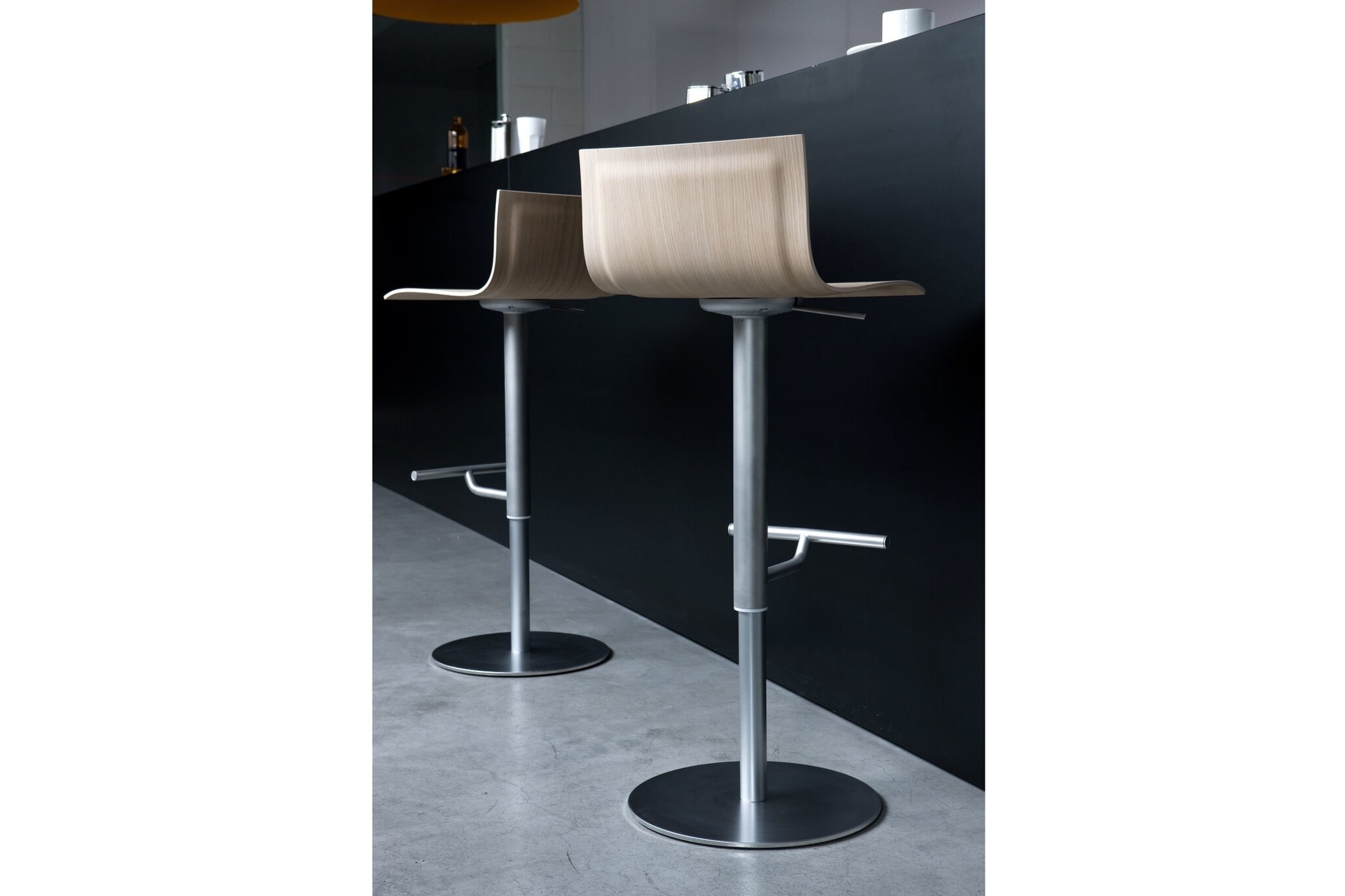 Lapalma Thin Barkruk van Lapalma met draaibare zitting en instelbare hoogte met gasveer. Poot in gezandstraald roestvaststaal, voet verzinkt met roestvaststalen plaat. Zitting uit gebogen multiplex met variërende dikte, dunner aan het uiteinde. Over Lapalma