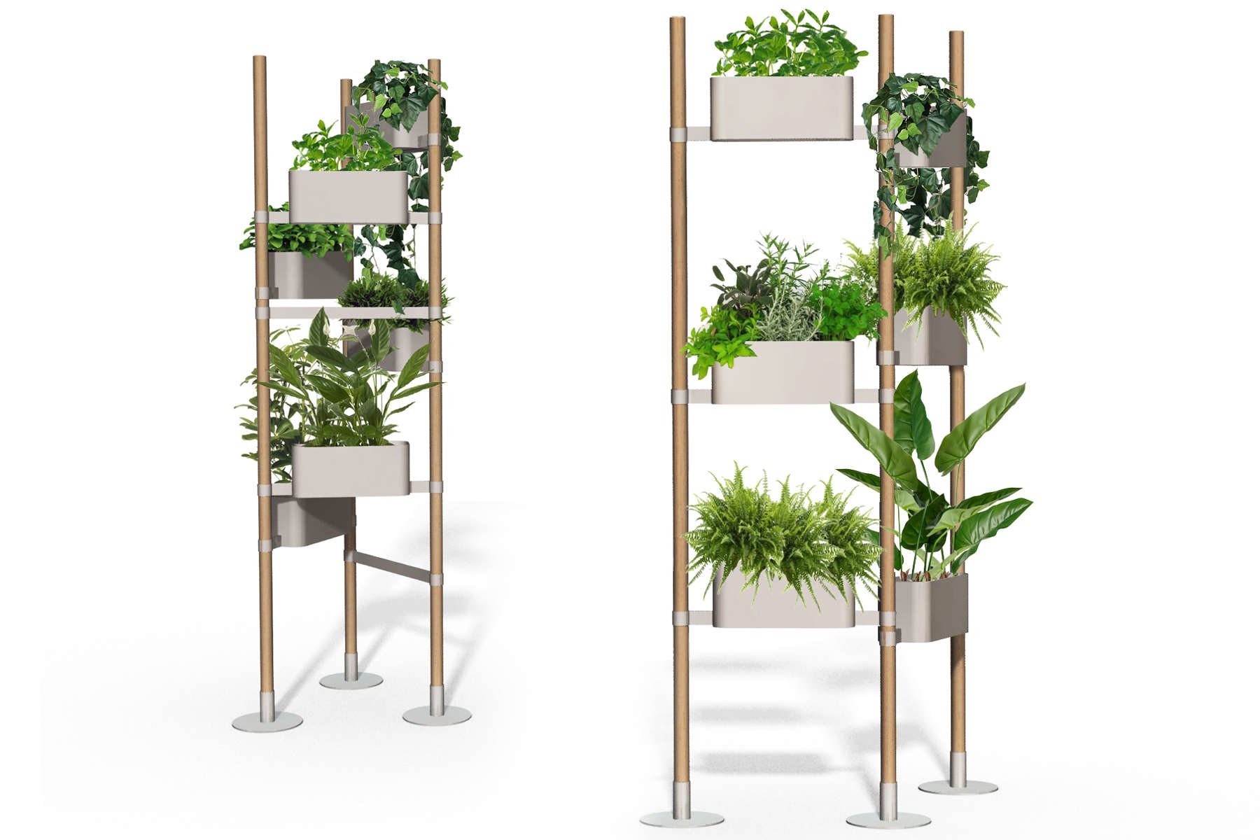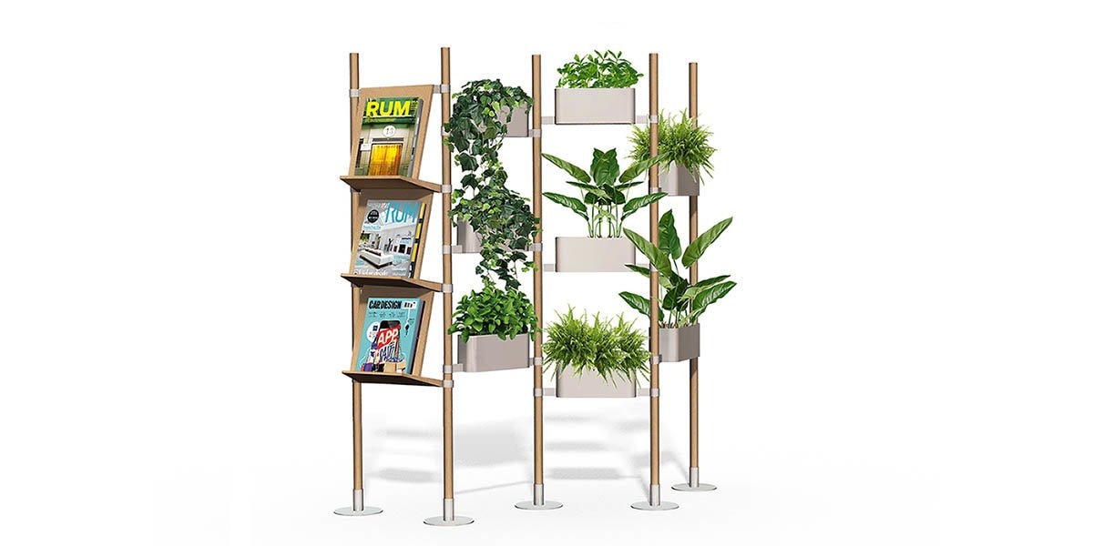 Lundbergs Möbler Bella is een roomdivider en scheidt op een mooie en functionele manier ruimtes van elkaar. Het systeem bestaat uit kolommen van houten pijlers en kan worden uitgerust met plantenbakken en tijdschriftenhouders. Naar gelang behoefte en wens kan het systeem eenvoudig uitgebreid worden met extra kolommen. Een mooie manier om invulling te geven aan meer groen op kantoor voor een gezond werk- en binnenklimaat en tijdschriften, vakbladen of magazines op een stijlvolle en decoratieve manier te presenteren.