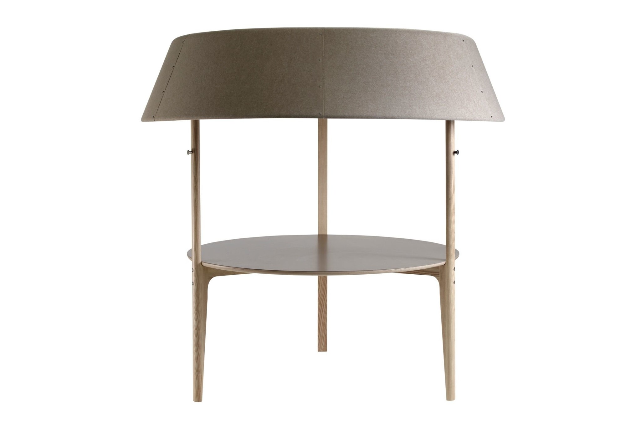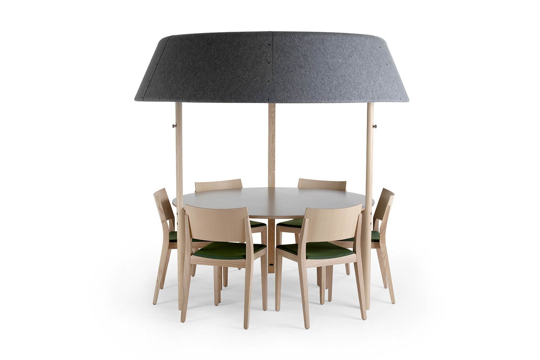 Tafel met akoestische vilten kap, voor prettige gesprekken in open of drukke omgeving.