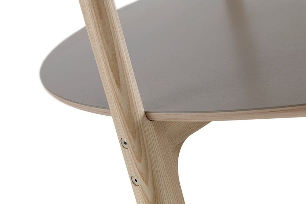 Het tafeloppervlak is gemaakt van Kayar, een materiaal van rubber met kokosvezels, dat geluid absorbeert en de nagalmtijd vermindert (of naar wens in Desktop linoneum, hpl of fineer).