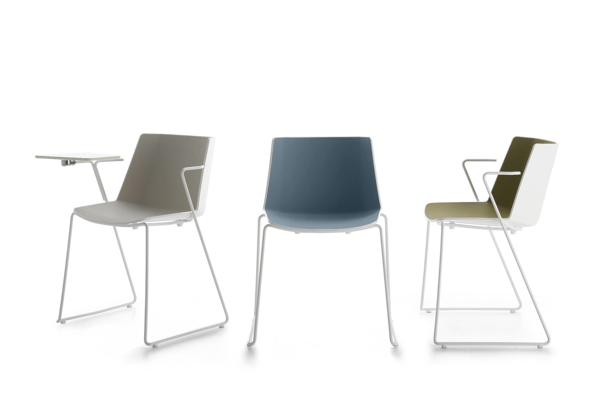 De stoel is verkrijgbaar met verschillende onderstellen: een vierpoots onderstel of een slede onderstel met of zonder armleggers, eventueel met schrijfblad.