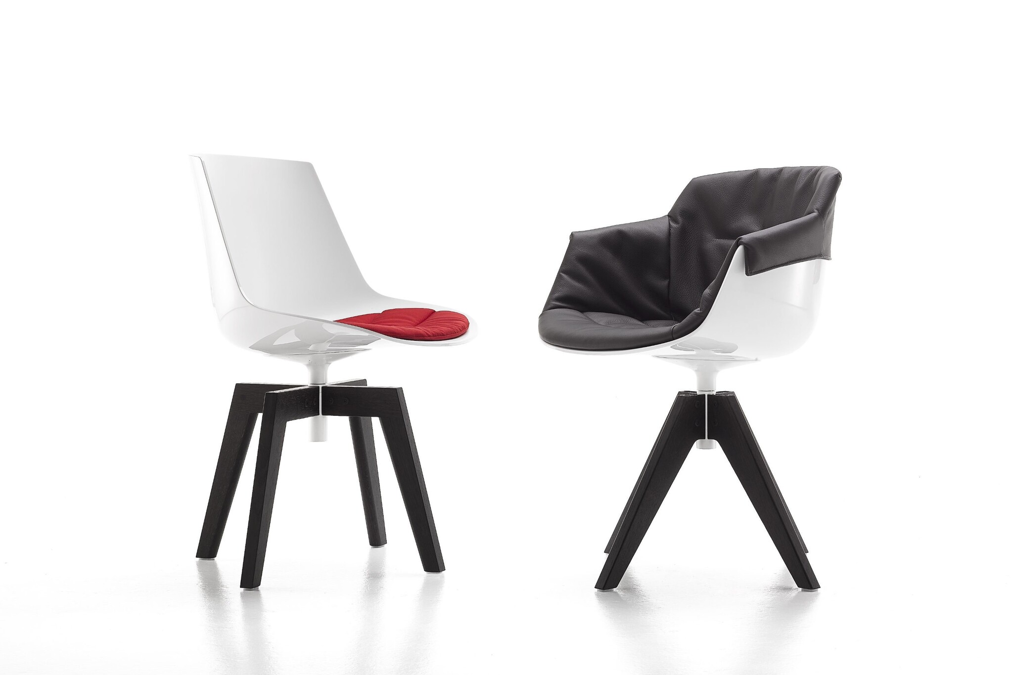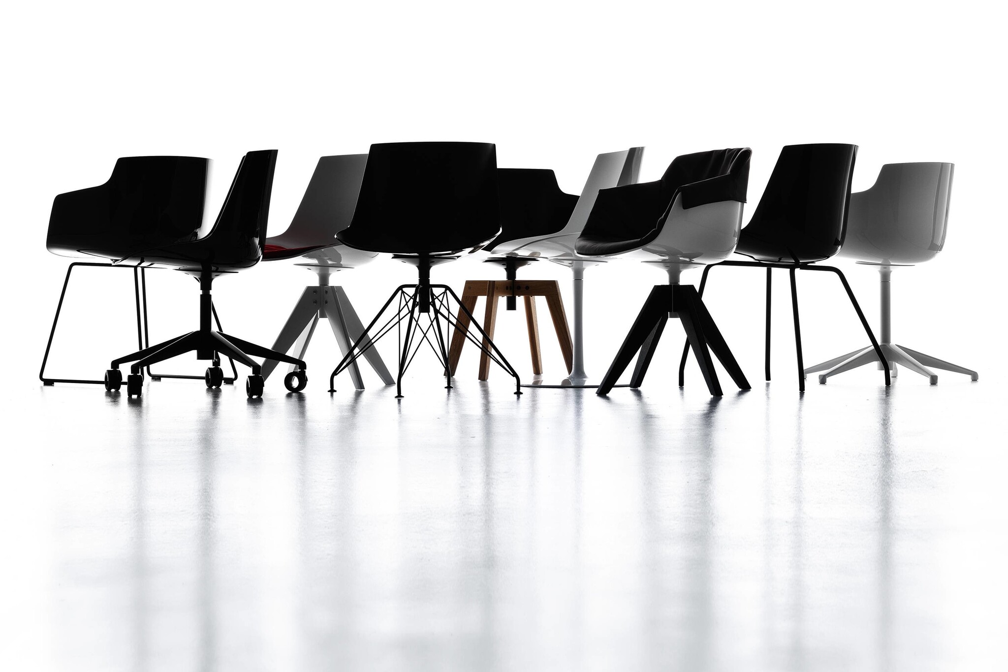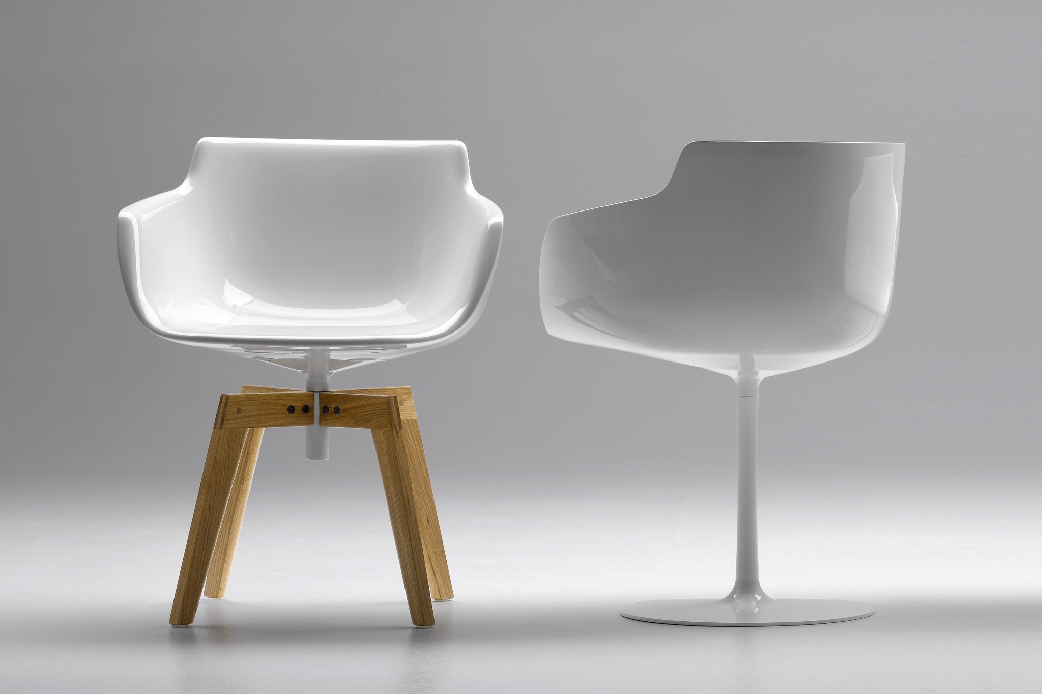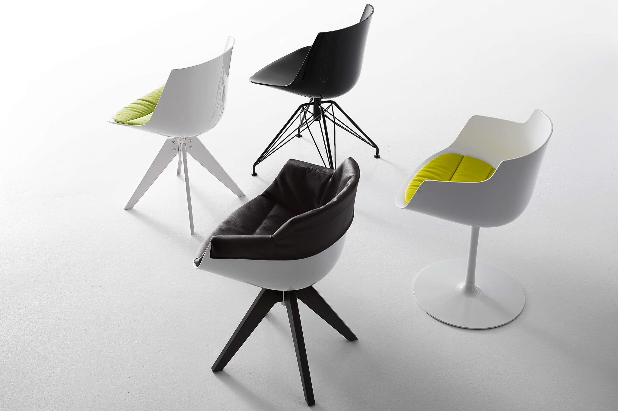 Mdf Italia Flow Armchair bestaat uit een familie van stoelen waarbij gekozen kan worden uit vele verschillende onderstellen. De kuip kan met of zonder bekleding. Zonder bekleding is er keuze tussen een 'soft touch' polyester kuip in hoogglans wit of zwart of in mat zwart, maar ook een harde polyethyleen kuip in mat wit of zwart. Kiest u voor bekleding dan is de totale schelp bekleed (Flow Textile) Mdf Italia Flow Armchair opties:
