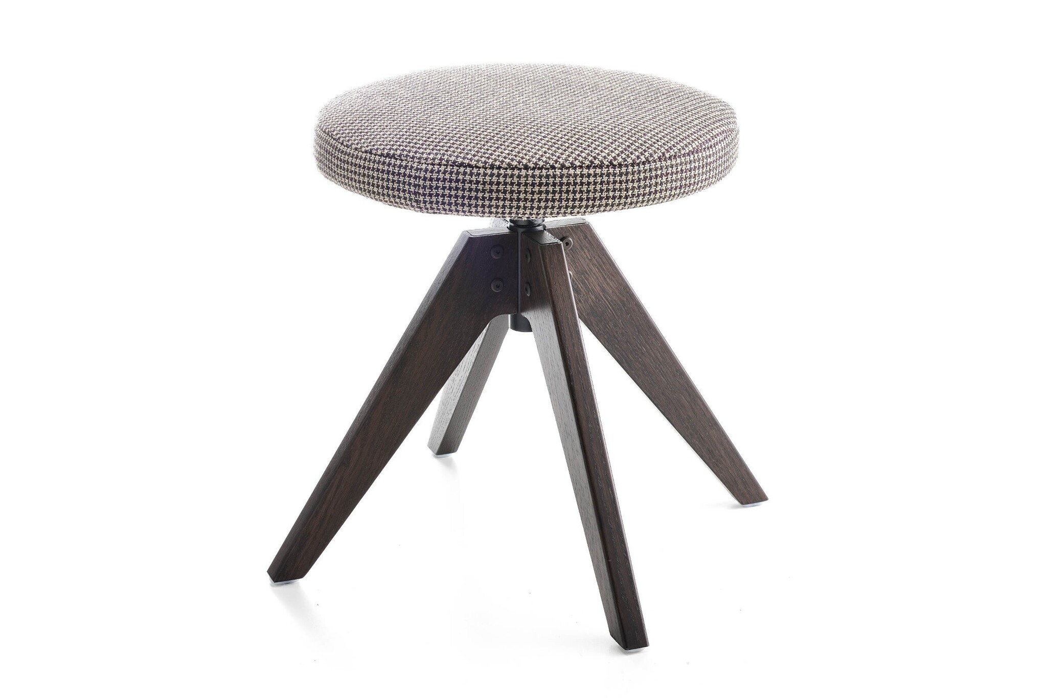 4 poten met een eiken basis, frame uit transparante gelakte eiken naturel massief hout met een natuurlijke, bruin of gebleekte afwerking, met een gelakt aluminium koppelinrichting in mat wit of grafiet. Geborsteld roestvrij staal voetsteun op alle versies. 360 graden draaibaar. Zithoogten beschikbaar in : 44, 65, 78 cm en voor de Flow Poef 48 cm.