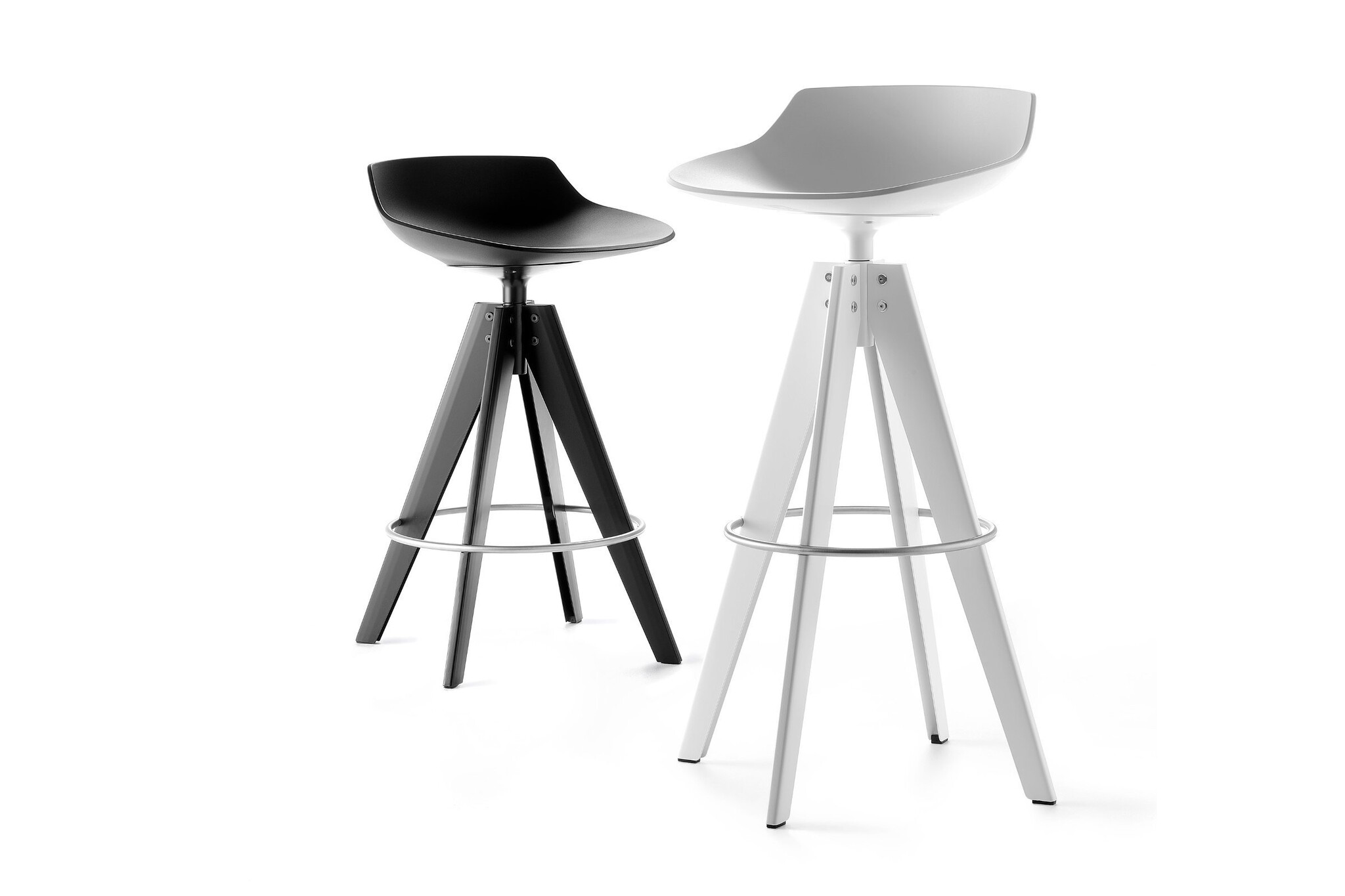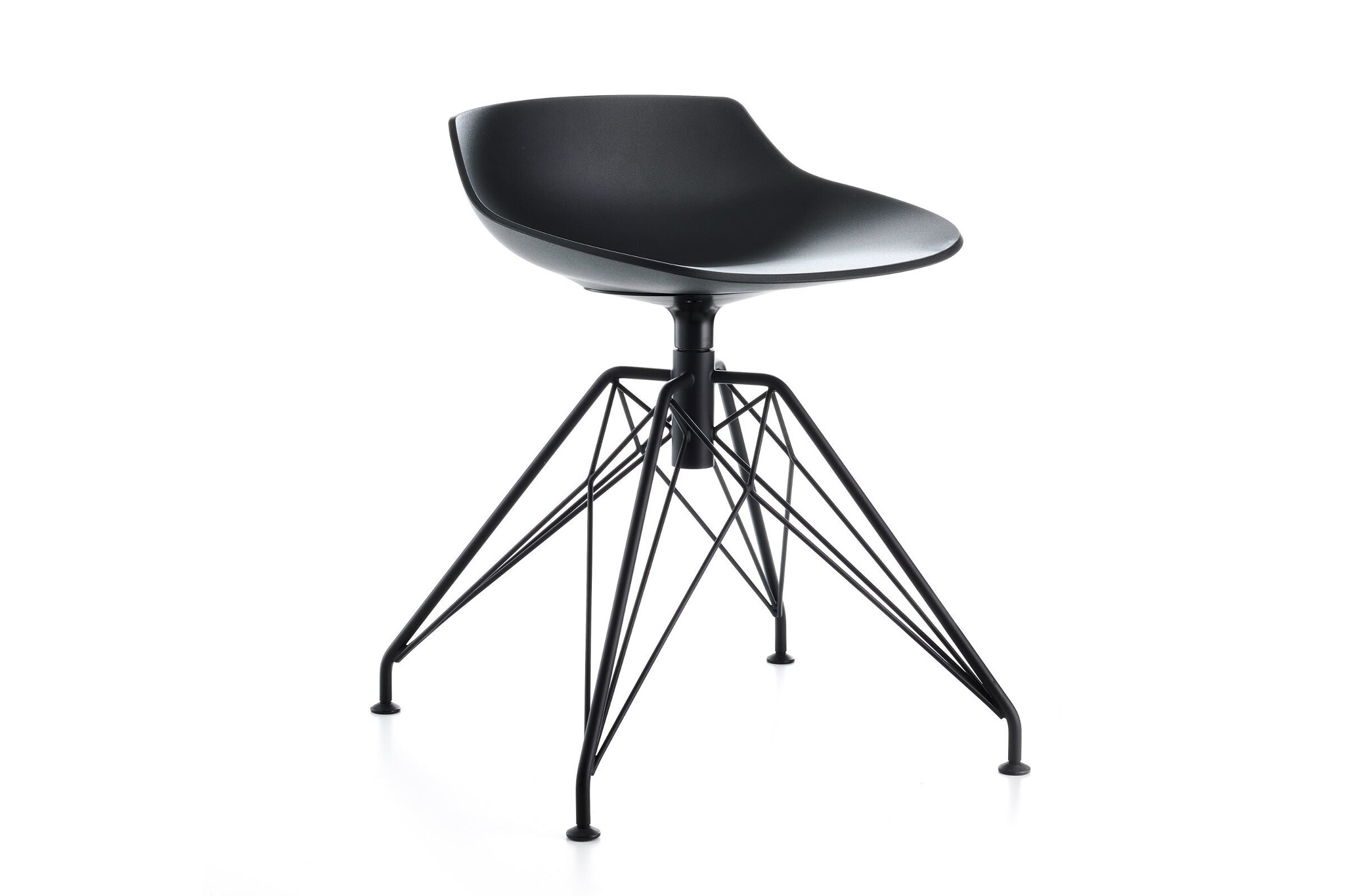 4 poten base staal, metaal, geschilderd mat wit of grafiet, met aluminium koppelinrichting in dezelfde kleur, 360 graden draaibaar. Stoelhoogte beschikbaar in: 44, 65 en 78 cm.