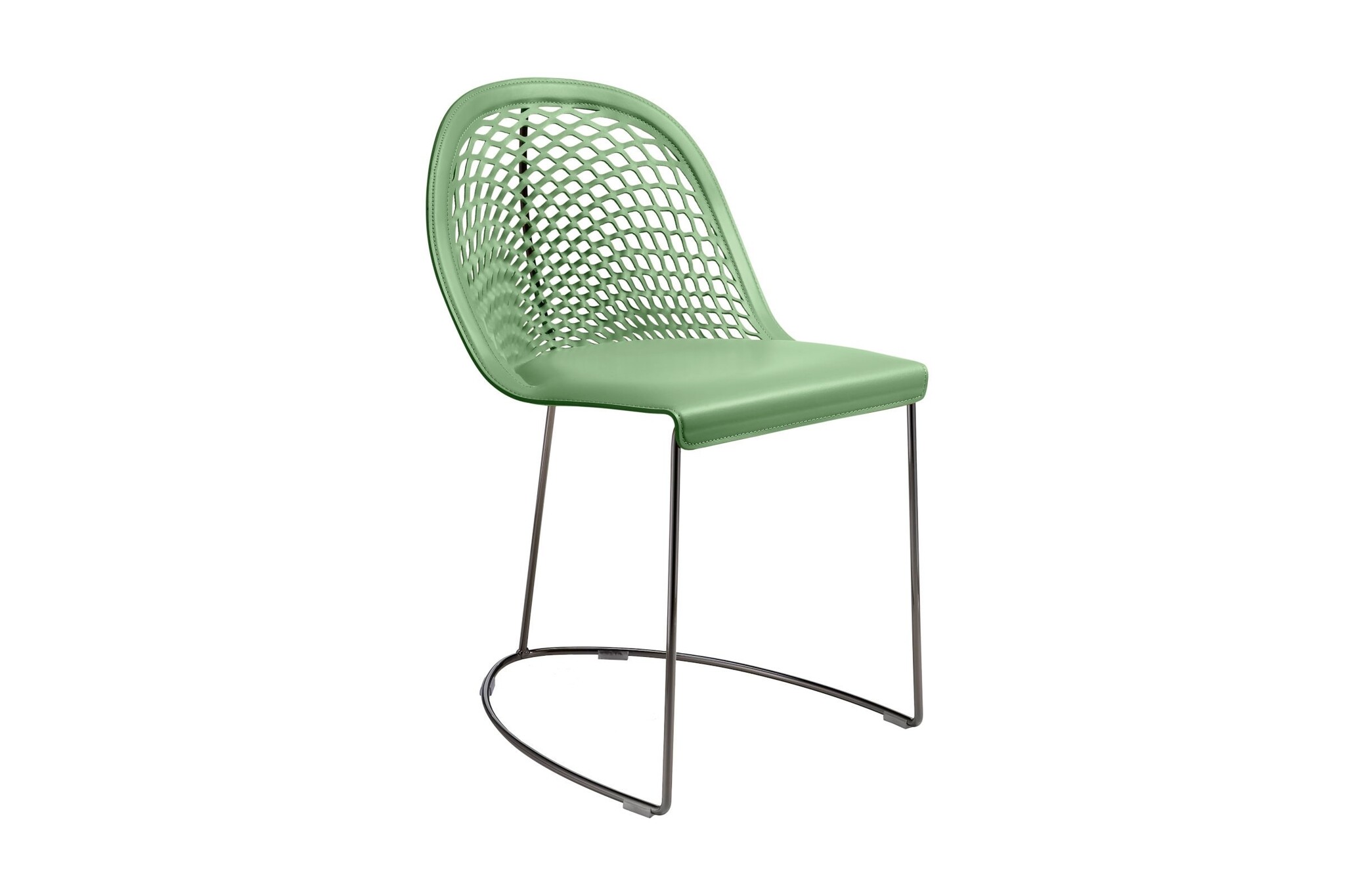 Stoel met slede onderstel, leverbaar in wit of zwart gelakt staal, chroom, rose goud en zwart nikkel.