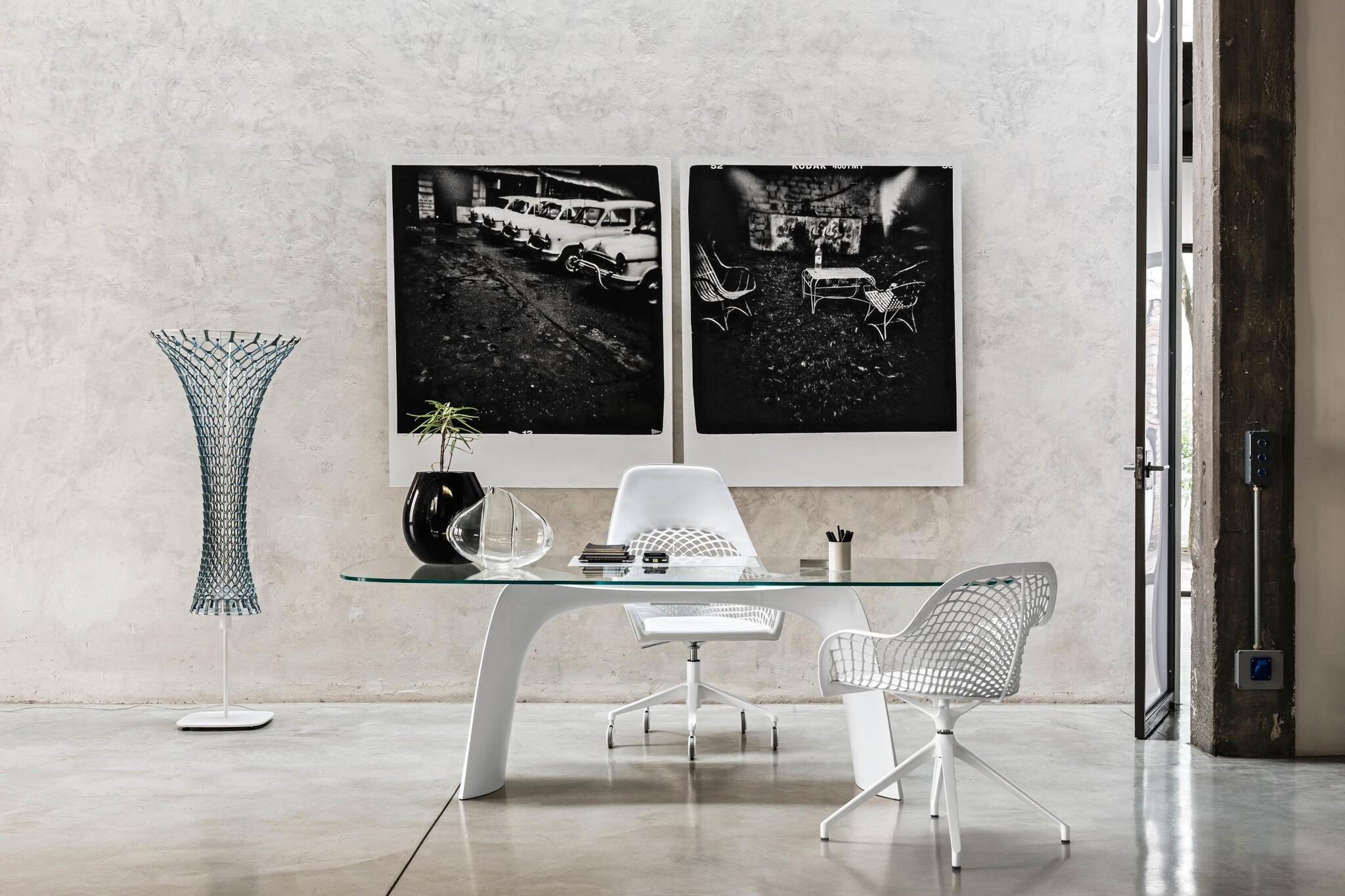 Verrijdbare stoel met hoge rug en stervoet onderstel, in hoogte verstelbaar. Onderstel leverbaar in in gelakt staal, wit staal in combinatie met witte wielen of zwart staal in combinatie met zwarte wielen.
