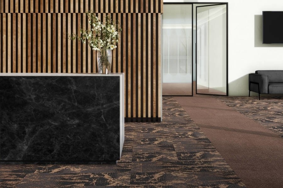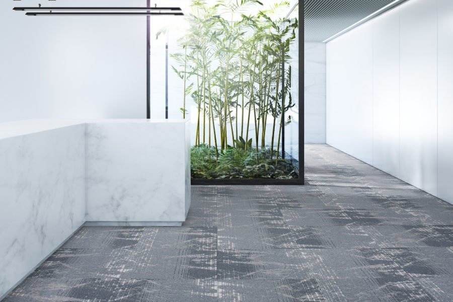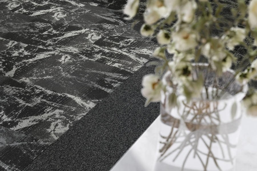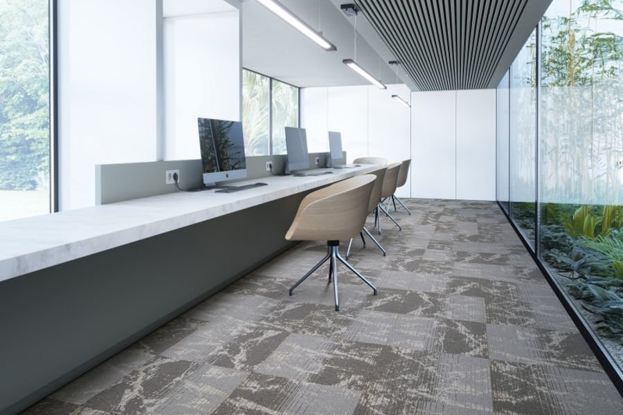 Modulyss Dawn is een collectie tapijttegels in vierkant formaat van 50 x 50 cm. De tapijttegels zijn vervaardigd van duurzame Econyl garens die op ecologische wijze verkregen zijn. Hiervoor zijn onder andere gebruikte visnetten gebruikt en verwerkt tot Econyl garens van nylon. De kleurencollectie omvat 18 kleuren met een luxe marmereffect dat elke zakelijke omgeving of kantoor een uitstraling van luxe en comfort geeft. De indicatieprijs is per m².