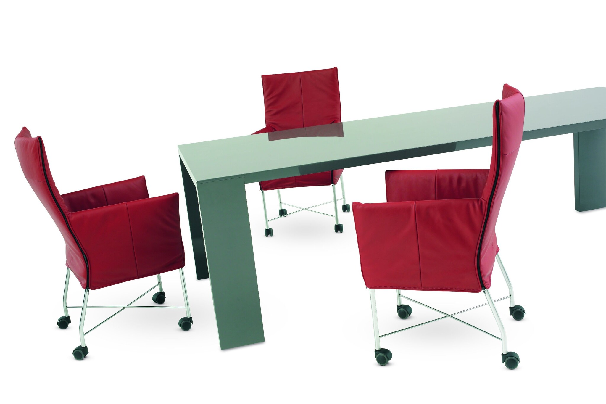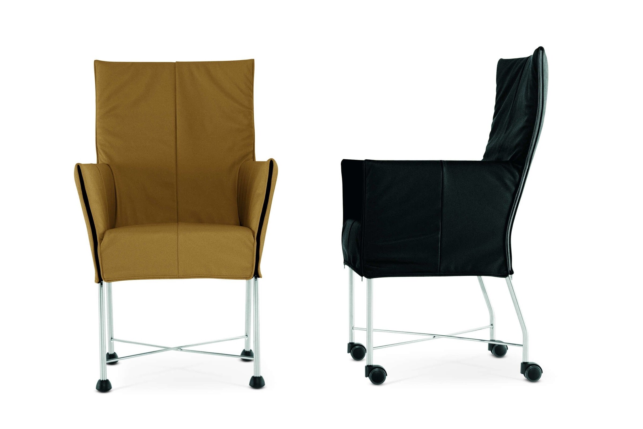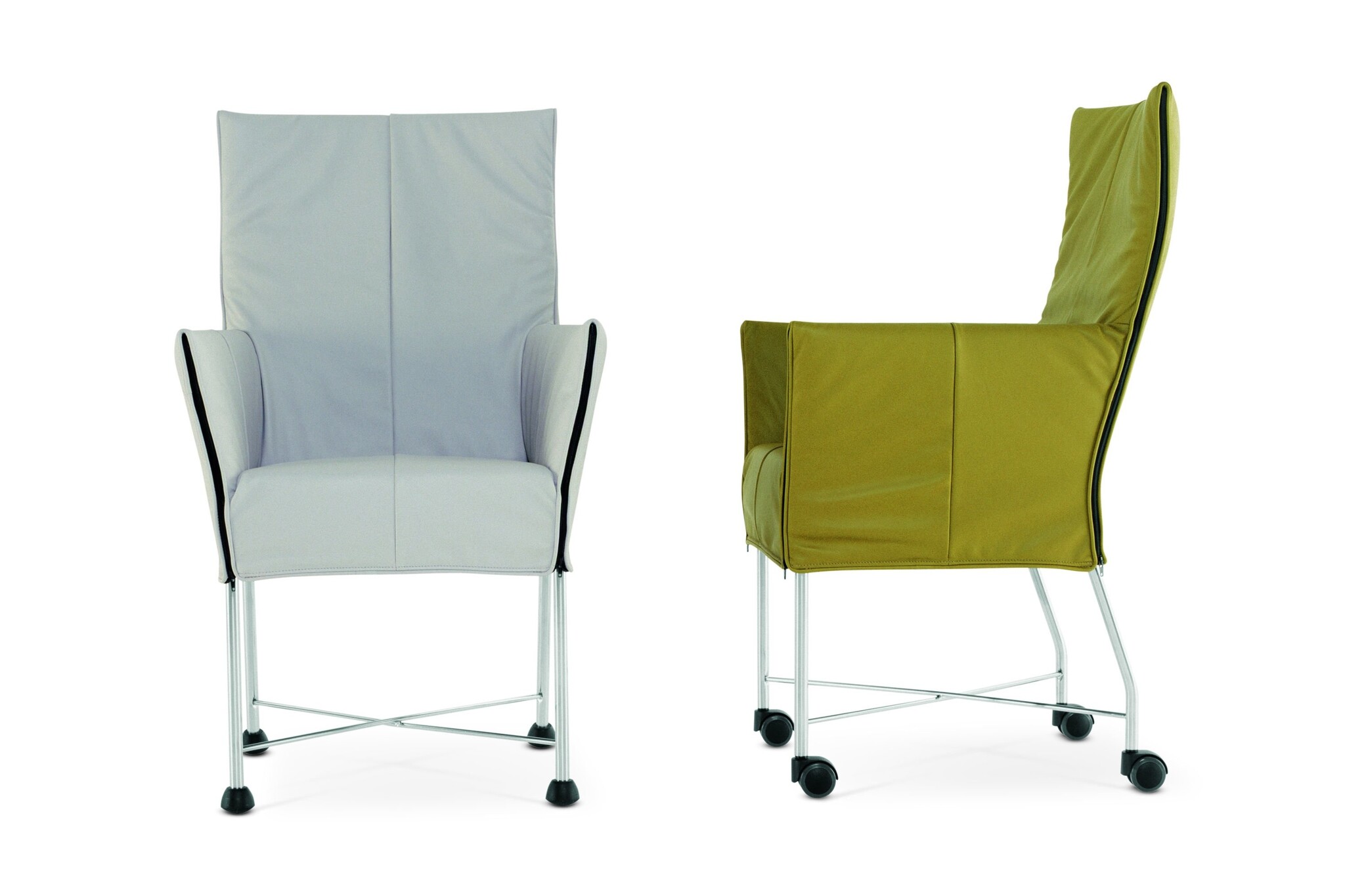 Deze Montis Chaplin stoel is ontworpen door de Nederlandse interieurontwerper Gerard van den Berg. De stoffering van Montis Chaplin bekleedt het onderstel als een kledingstuk voor een mens. De hoes drapeert nonchalant als een gewatteerde 'jas' en wordt door ritsen gesloten. De stoelen lenen zich uitstekend voor een comfortabele eethoek of gespreksruimte. De uitvoering op wielen biedt een goede toepassing voor een werkruimte. U kunt zich hierdoor makkelijk verplaatsen.