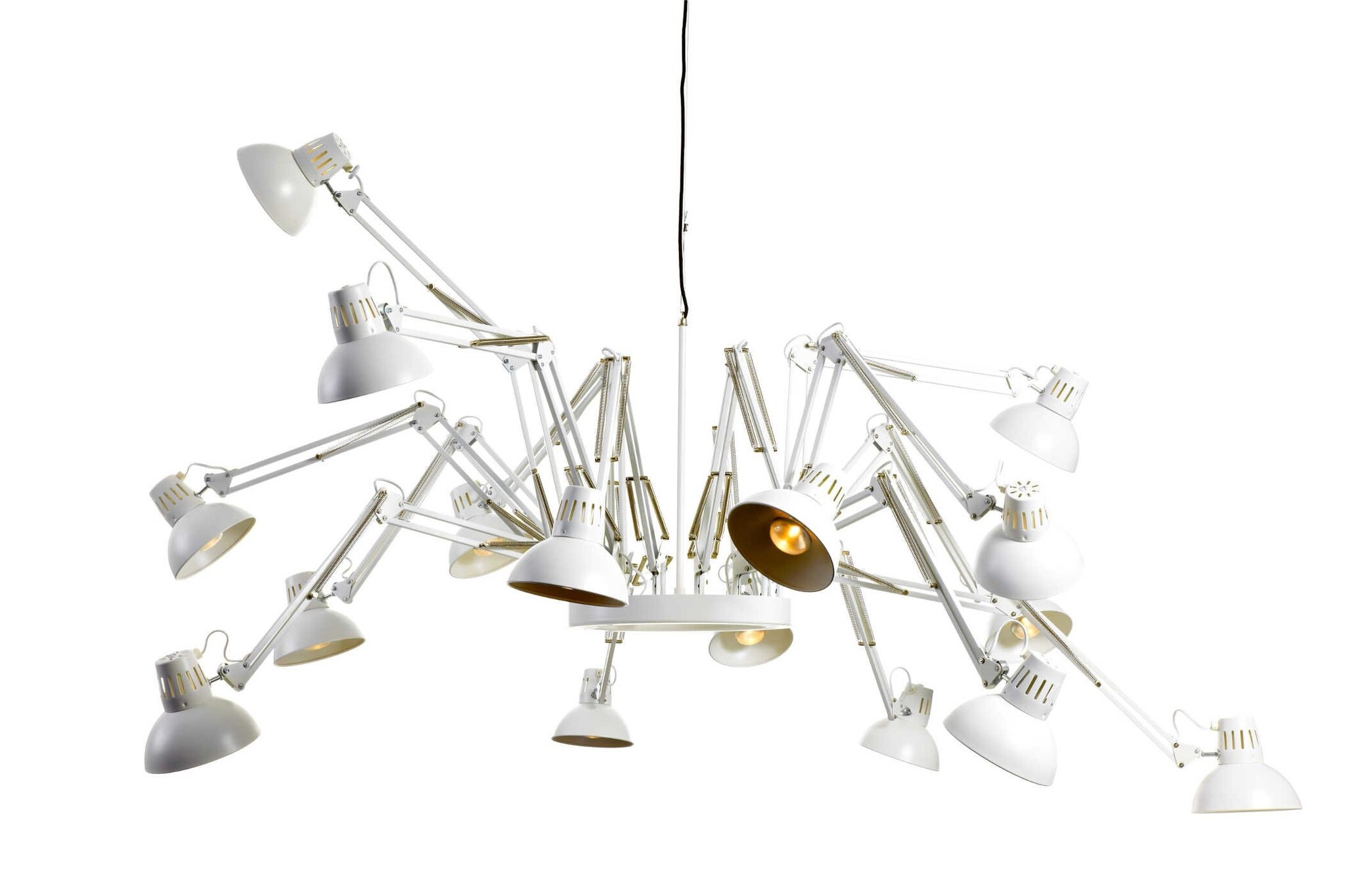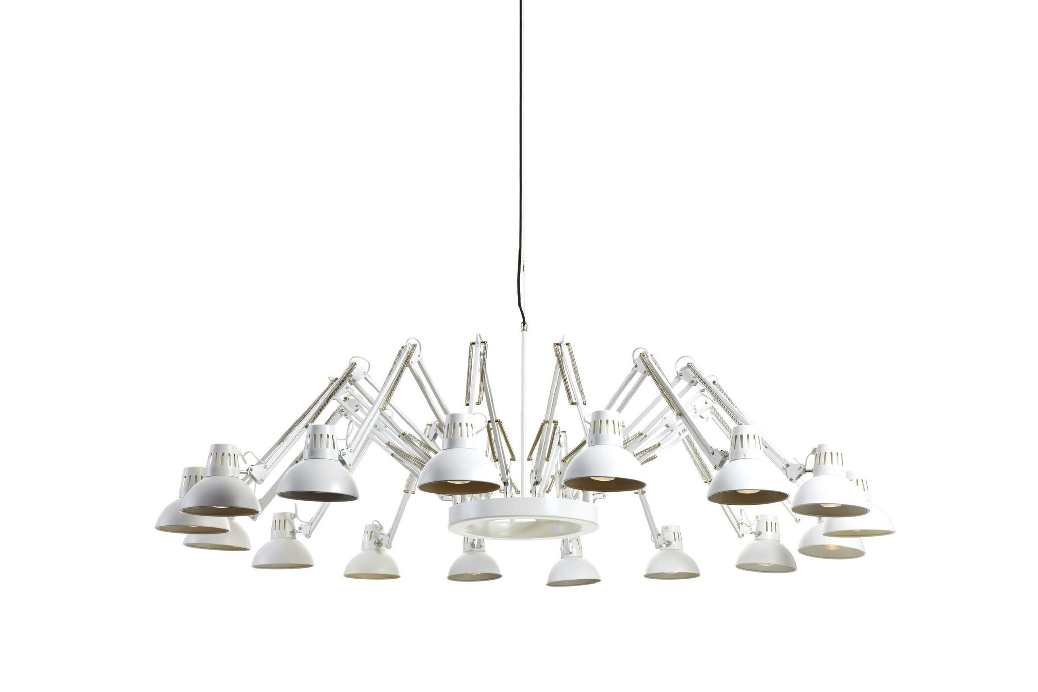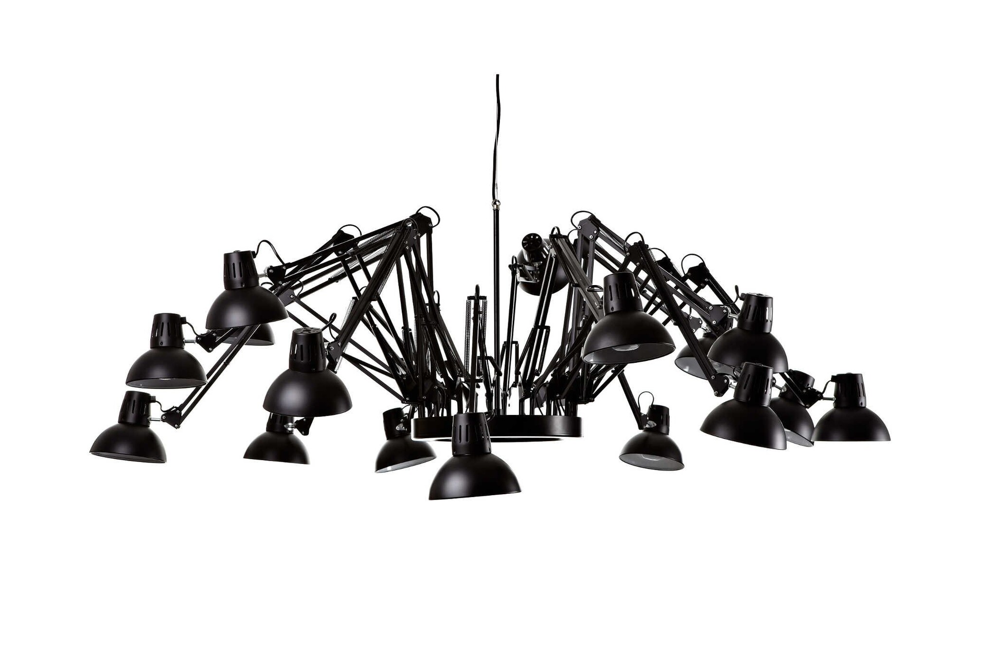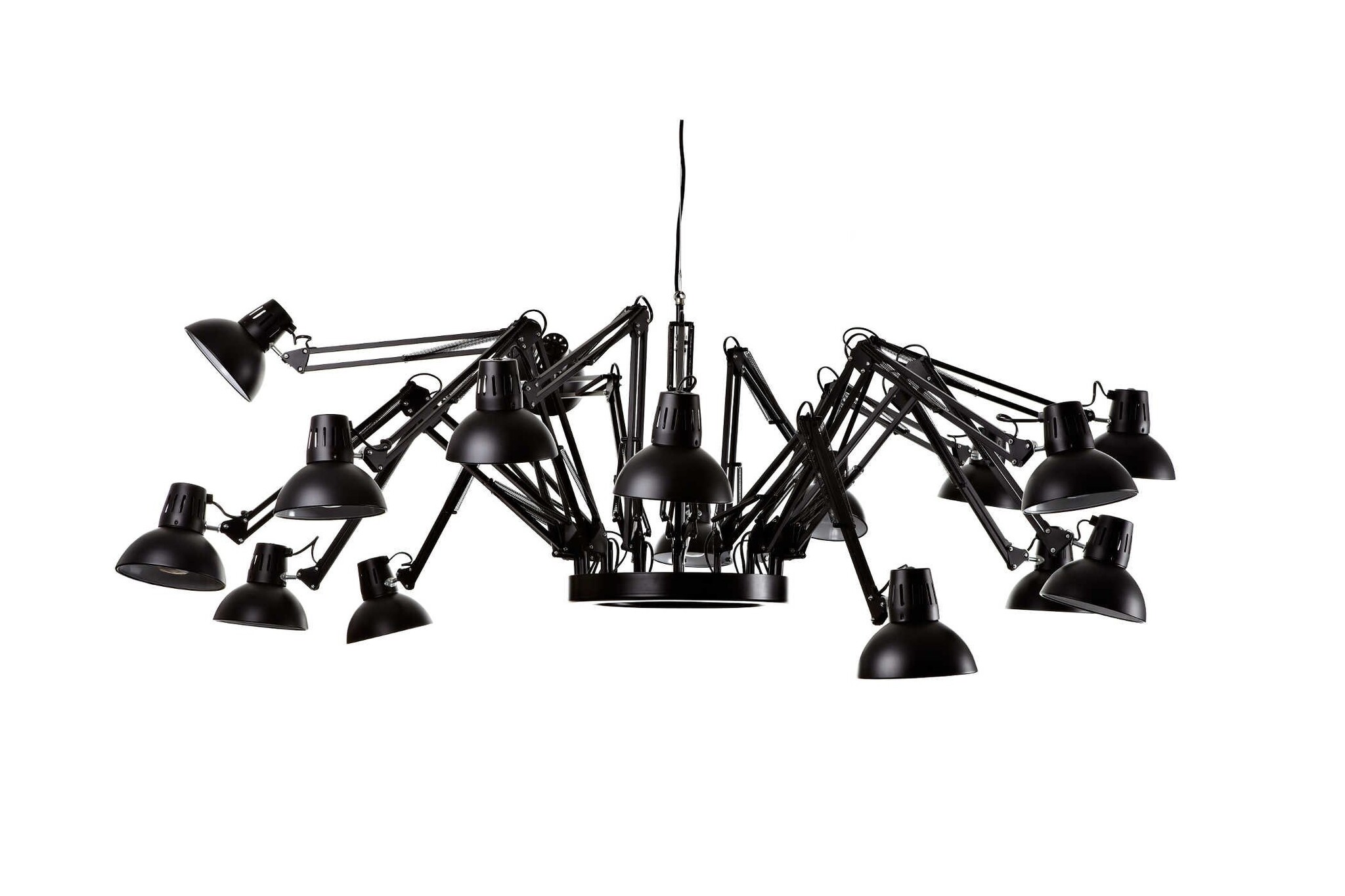 Bestaat uit 16 individueel verstelbare bureaulampen. Voor een strakke inrichting kunt u ze allemaal even lang maken en dezelfde richting opzetten, maar voor een speels effect kunt u de lampen ook allemaal apart verstellen en een richting op zetten.