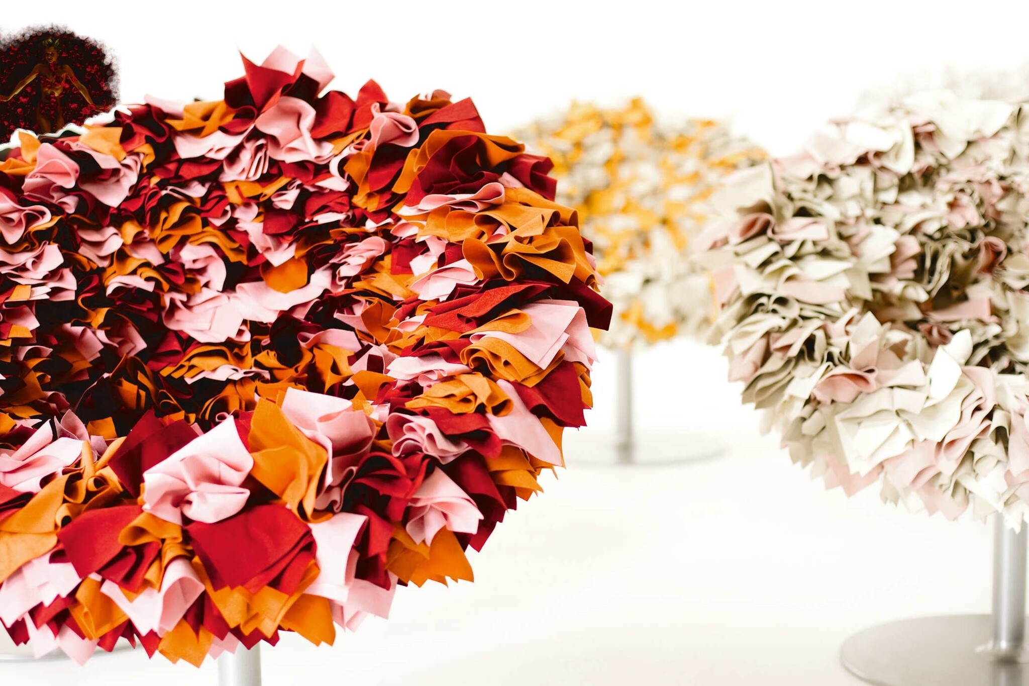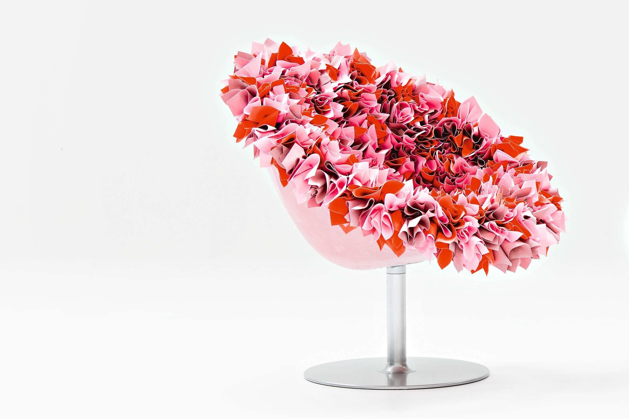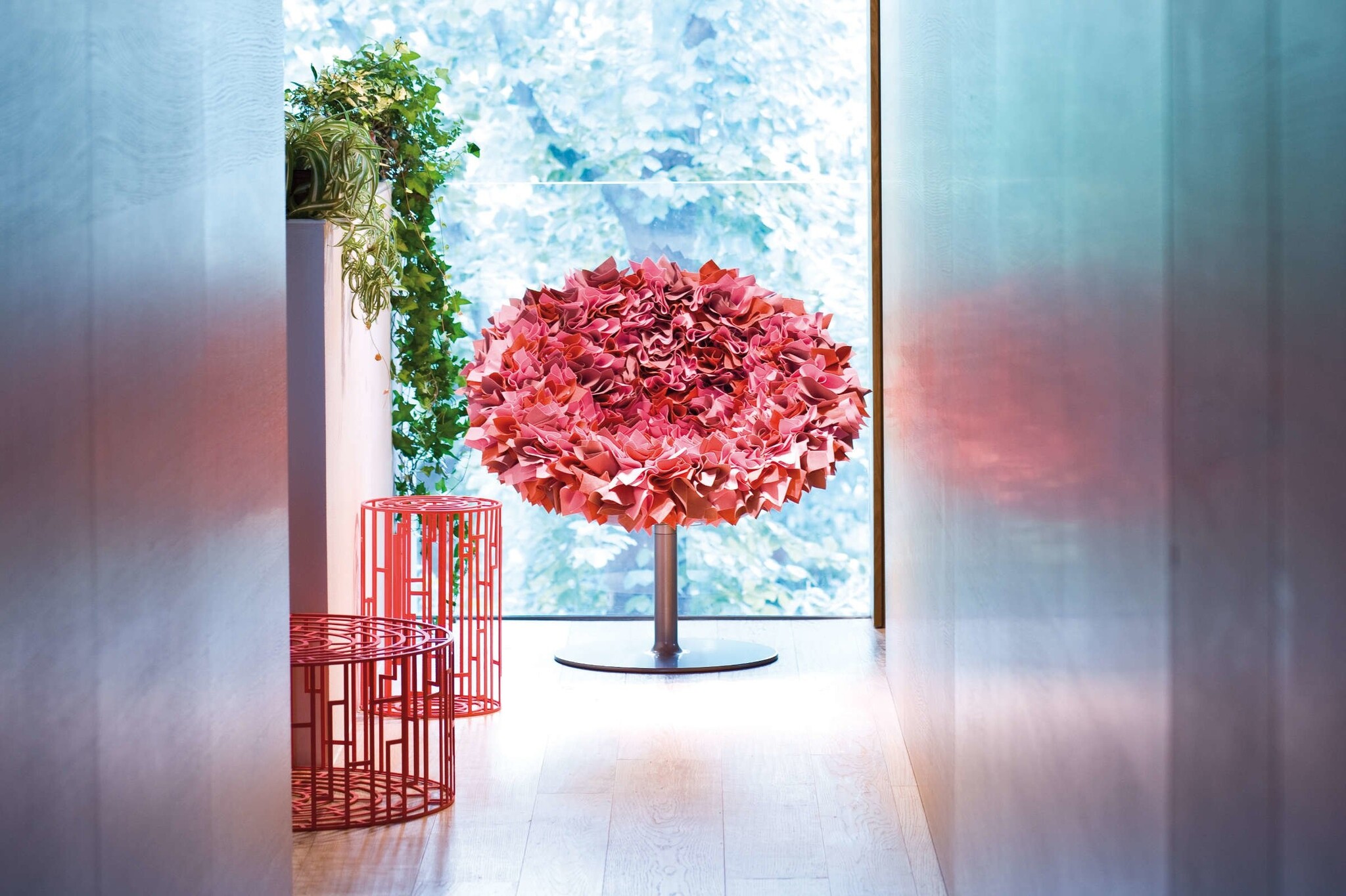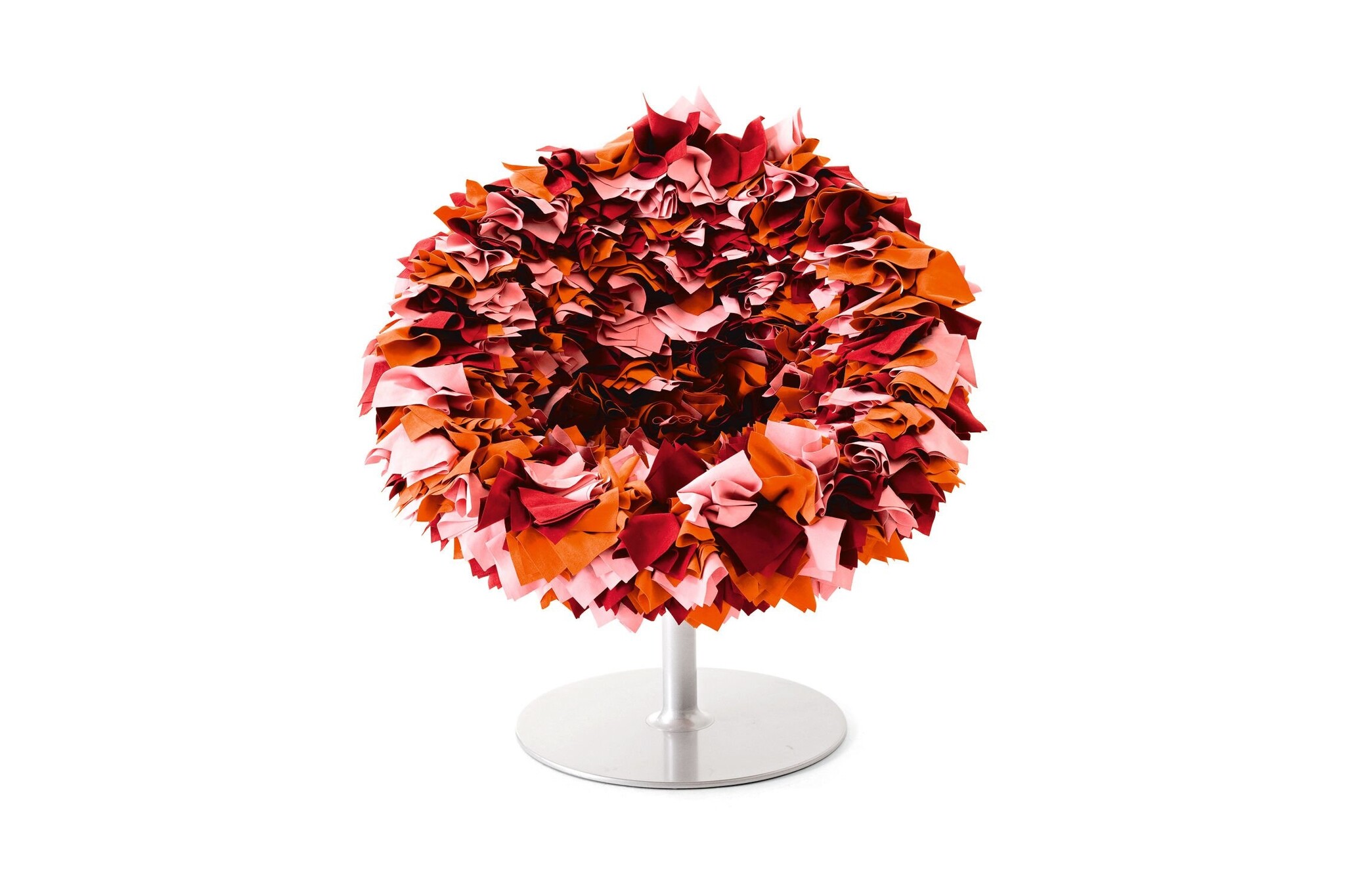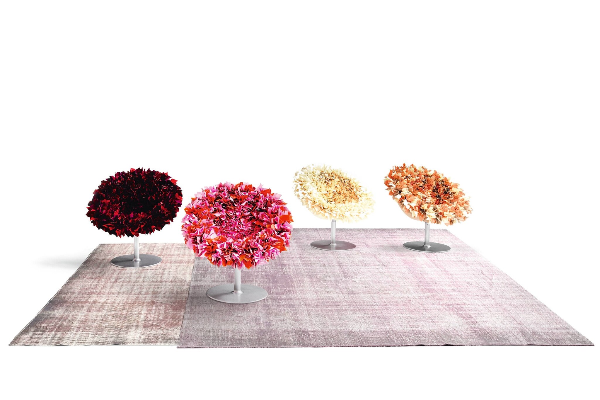 Moroso Bouquet Chair combineert eenvoud met een innovatief ontwerp van Tokujin Yoshioka. De stoel is bedoeld om mensen blij te maken, zoals een boekt met bloemen ook doet. De krachtige kleuren bieden voor iedereen een eigen ervaring. De Bouquet Chair 'bloeit' op een slanke verchroomde stalen onderstel met witte of pastel gekleurde 'blaadjes' van hand gevouwen stof. Moroso Bouquet Chair afmetingen
