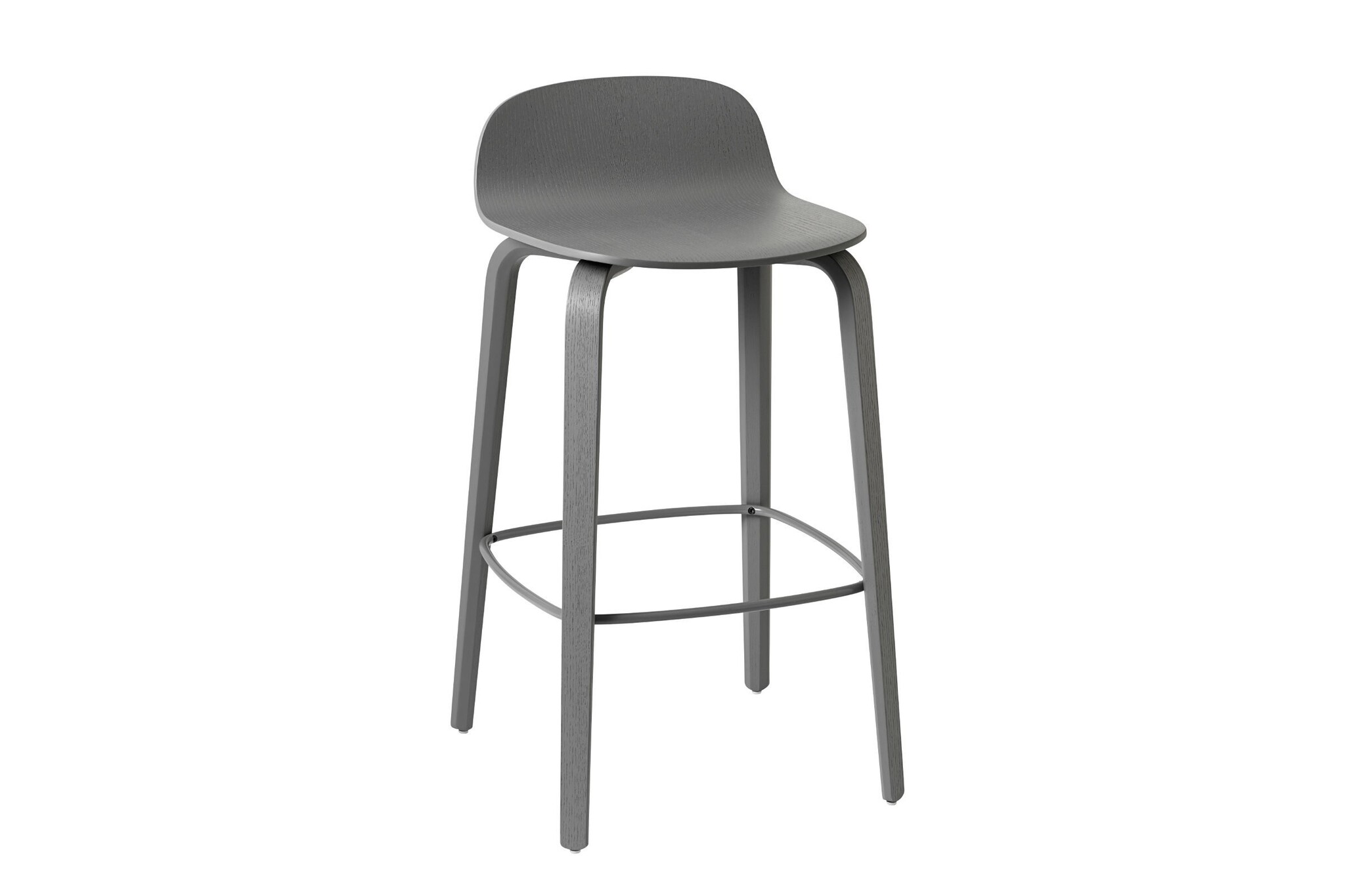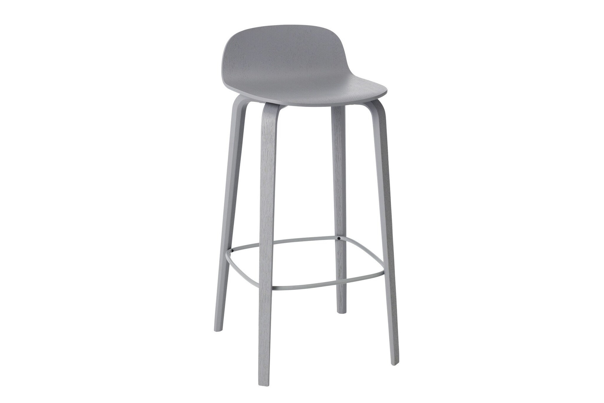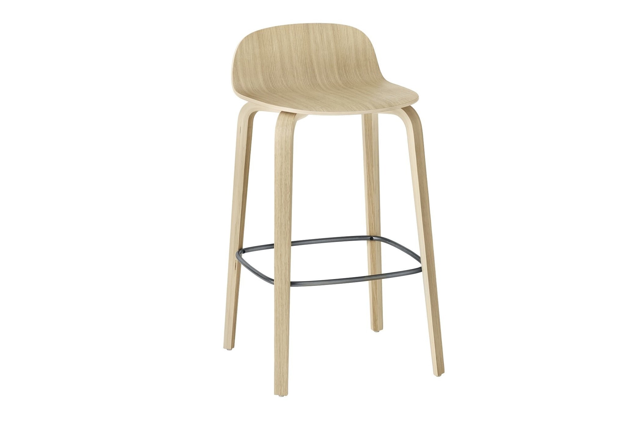 De eikenhouten barstoel is gemaakt van een eik base, eiken fineer zitschaal en een stalen voetsteun. De gekleurde stoel is gemaakt van PU-gelakt ash base, essen fineer shell en een PU-gelakt staal voetsteun. Verkrijgbaar in de volgende kleurmogelijkheden: eiken, grijs, zwart. Afmetingen Muuto Visu barkruk
