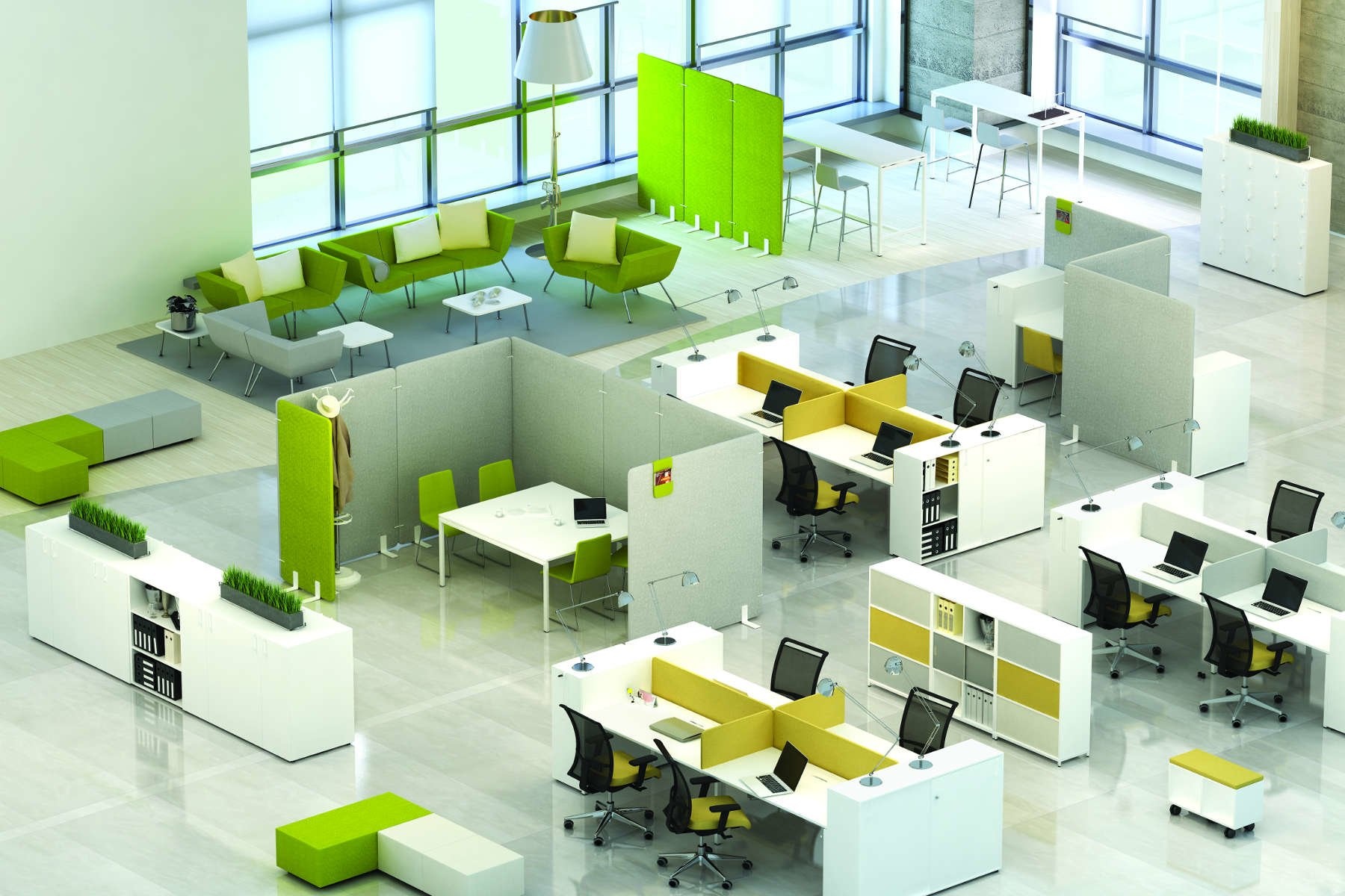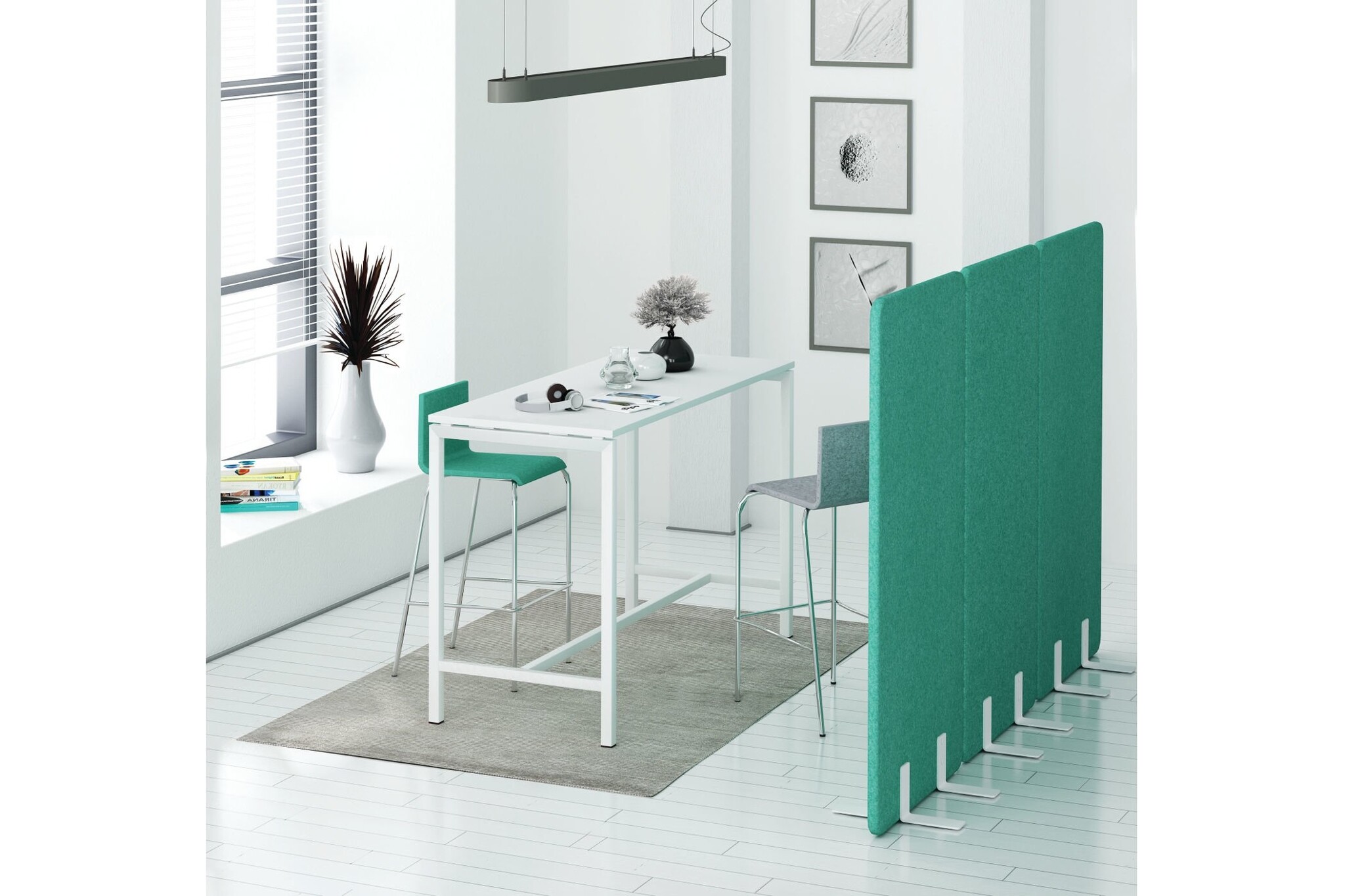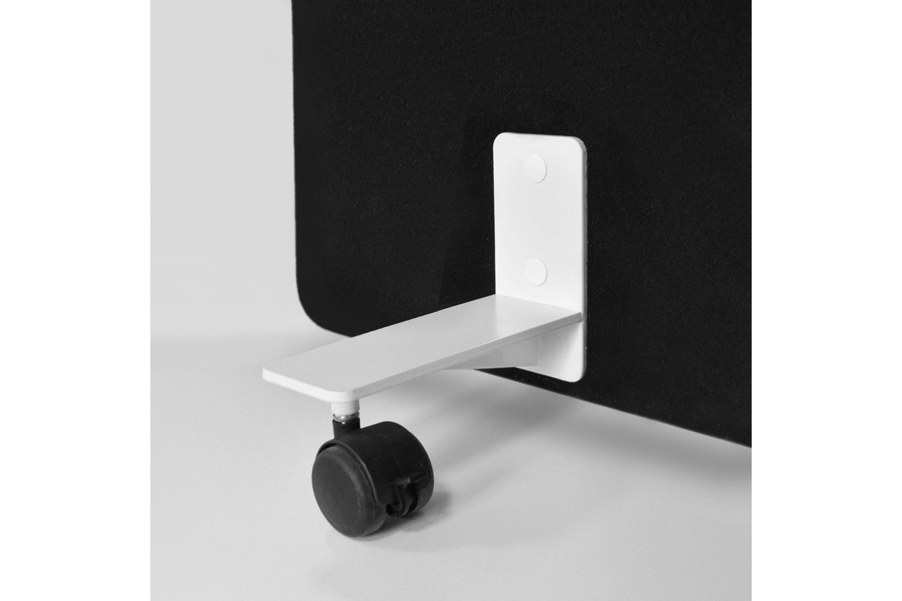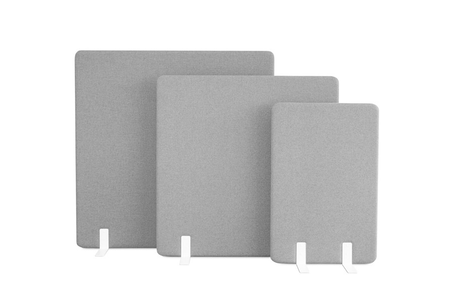De vrijstaande scheidingswanden kunnen worden geleverd met een pootset of een verrijdbare pootset in de kleuren wit, antraciet of aluminium.