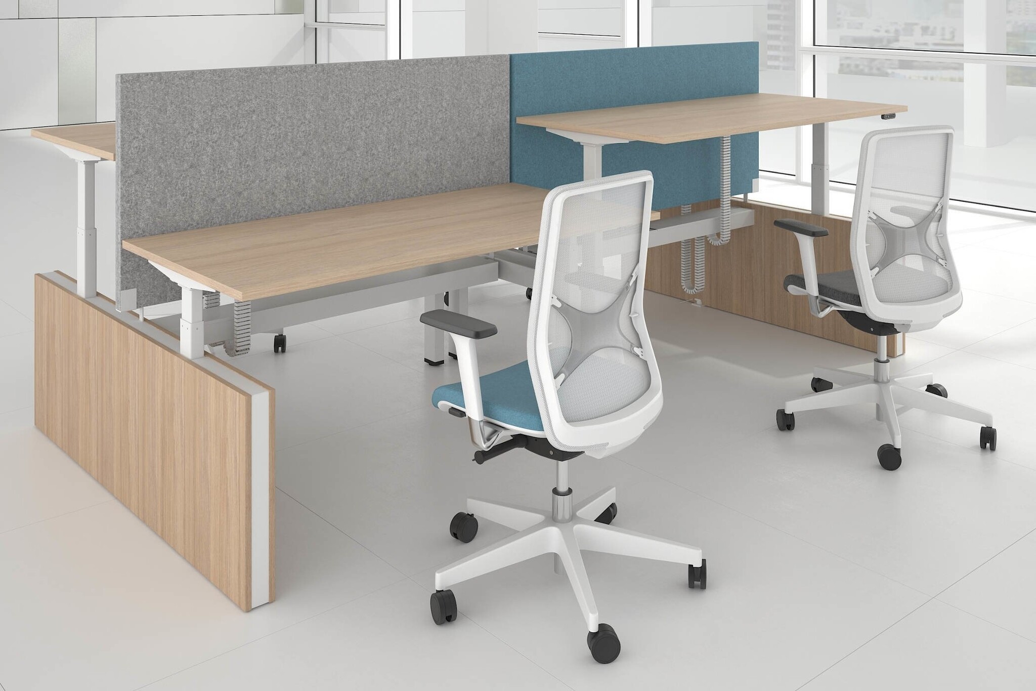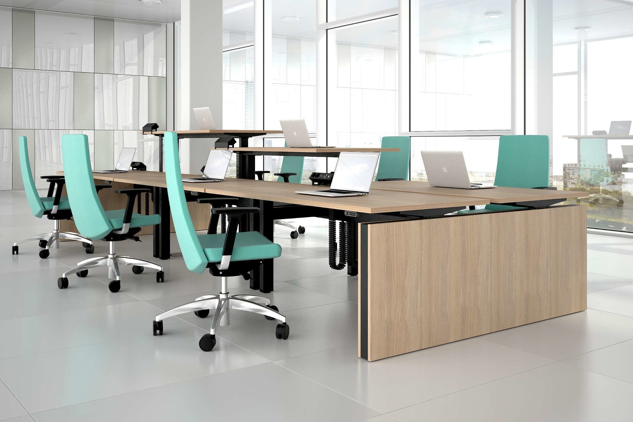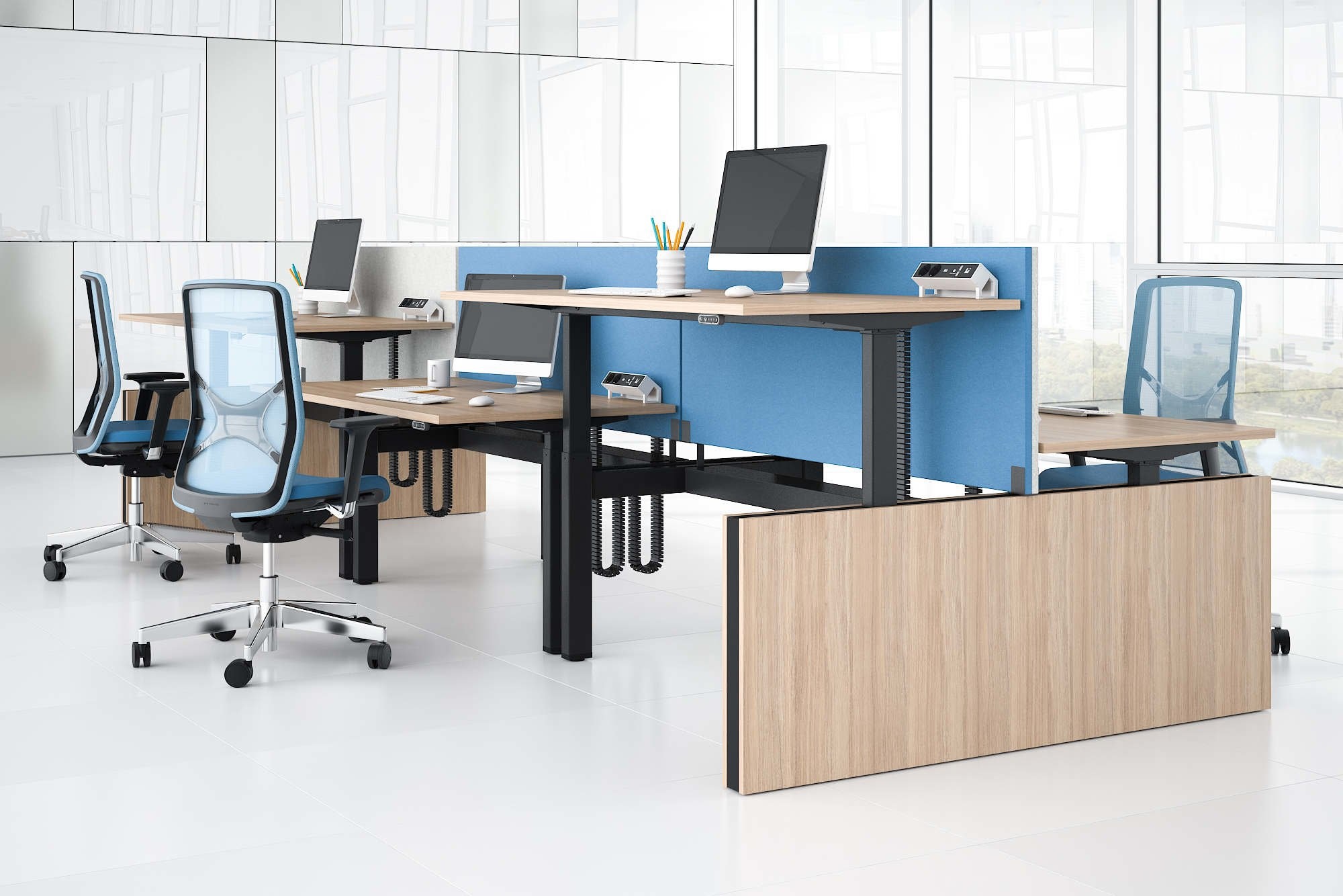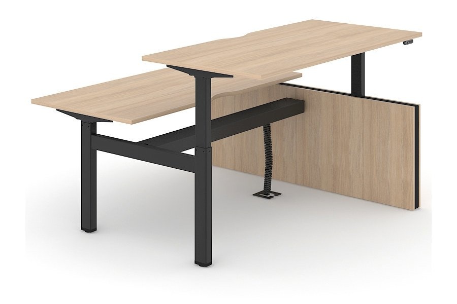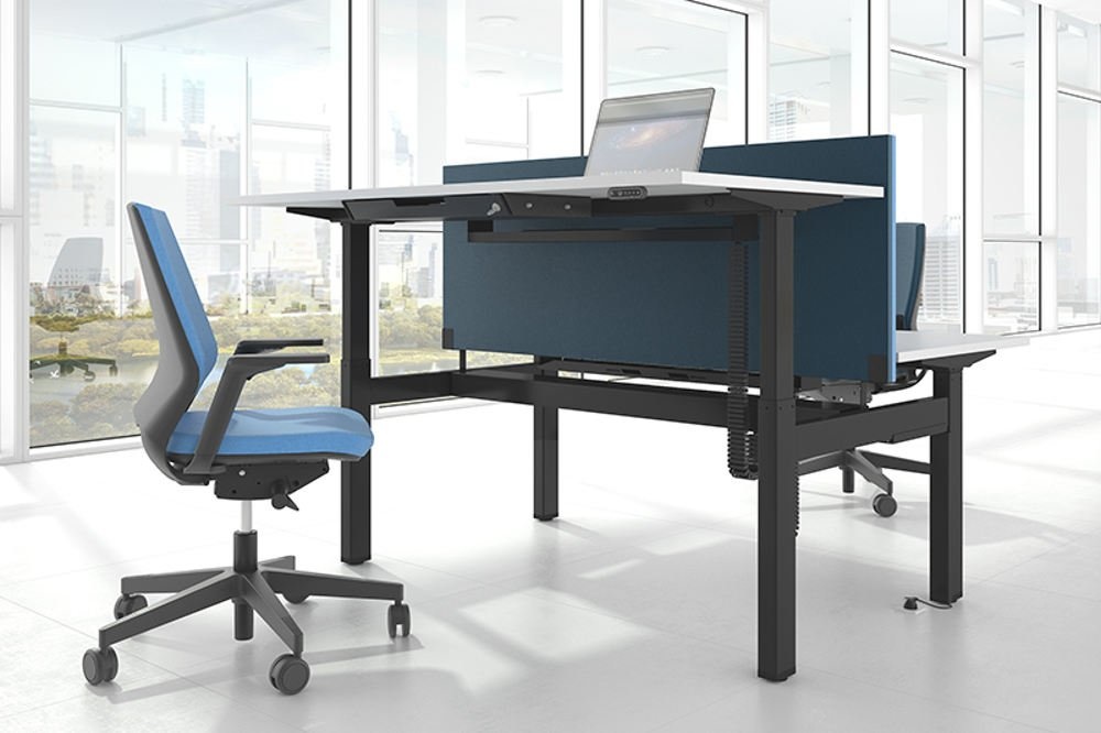Narbutas Motion zijn elektrisch in hoogte verstelbare zit sta bureaus voor een dynamischere en gezondere werkstijl. We werken op kantoor en besteden hier onze tijd meer dan ooit tevoren. Daarom moeten we serieus nadenken over ons welzijn op de werkplek en de factoren die daarop van invloed zijn. Onze lichamen zijn niet ontworpen om lange tijd in dezelfde positie te blijven, daarom moeten we ons bewegen en actief zijn. De hele dag een paar uur opstaan kan een positieve invloed hebben op onze gezondheid en werkefficiëntie. Het Narbutas Motion zit sta bureau maakt het mogelijk om eenvoudig van positie te veranderen van zitten naar staan. Regelmatig veranderen van uw lichaamspositie verbetert het welzijn en de concentratie. Dit bureausysteem is ontworpen voor een flexibele werkorganisatie en is goed aangepast voor individueel werk of voor samenwerking.De open-type type kantoren zijn tegenwoordig de meest voorkomende. Narbutas Motion bureaus worden aangevuld met vaste hoogte-akoestische schermen om het akoestisch comfort te verbeteren, chaos te voorkomen en de nette kantoorlook te behouden.