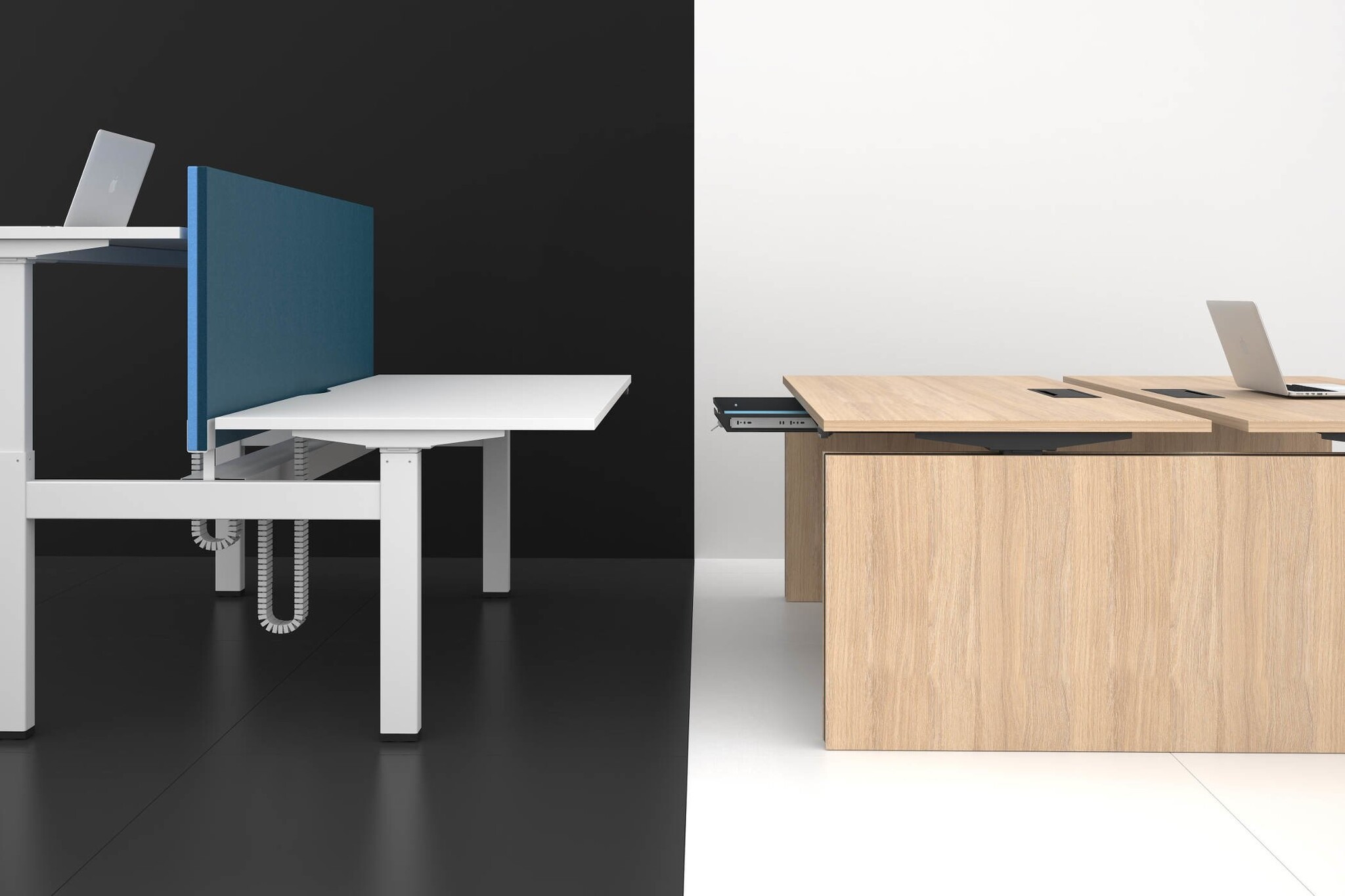Keuze uit twee soorten poten te kiezen: H-vormige metalen poten en wangpoten (optie voor diegenen die meer privacy wensen). Dit type poot bedekt visueel de ruimte onder het bureau en zorgt voor een esthetische uitstraling van het kantoor.