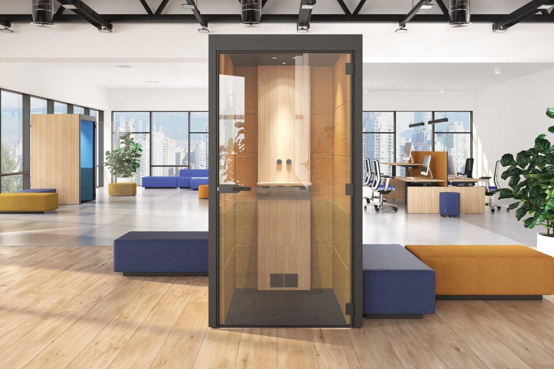 Dé akoestische oplossing voor op het kantoor: Narbutas Silent Room S. Deze kleine, maar fijne ruimte geeft u de mogelijkheid om midden in het kantoor te bellen zonder uw collega’s te storen. Deze kleine ruimte wordt dan ook wel een belcel genoemd, omdat u er in kunt staan en telefoneren, maar uiteraard kunt u het ook gebruiken als concentratiewerkplek of voor een conference call. Deze Silent Room kan door zijn formaat in praktisch alle ruimtes worden geplaatst. Kenmerken van de Narbutas Silent Room S