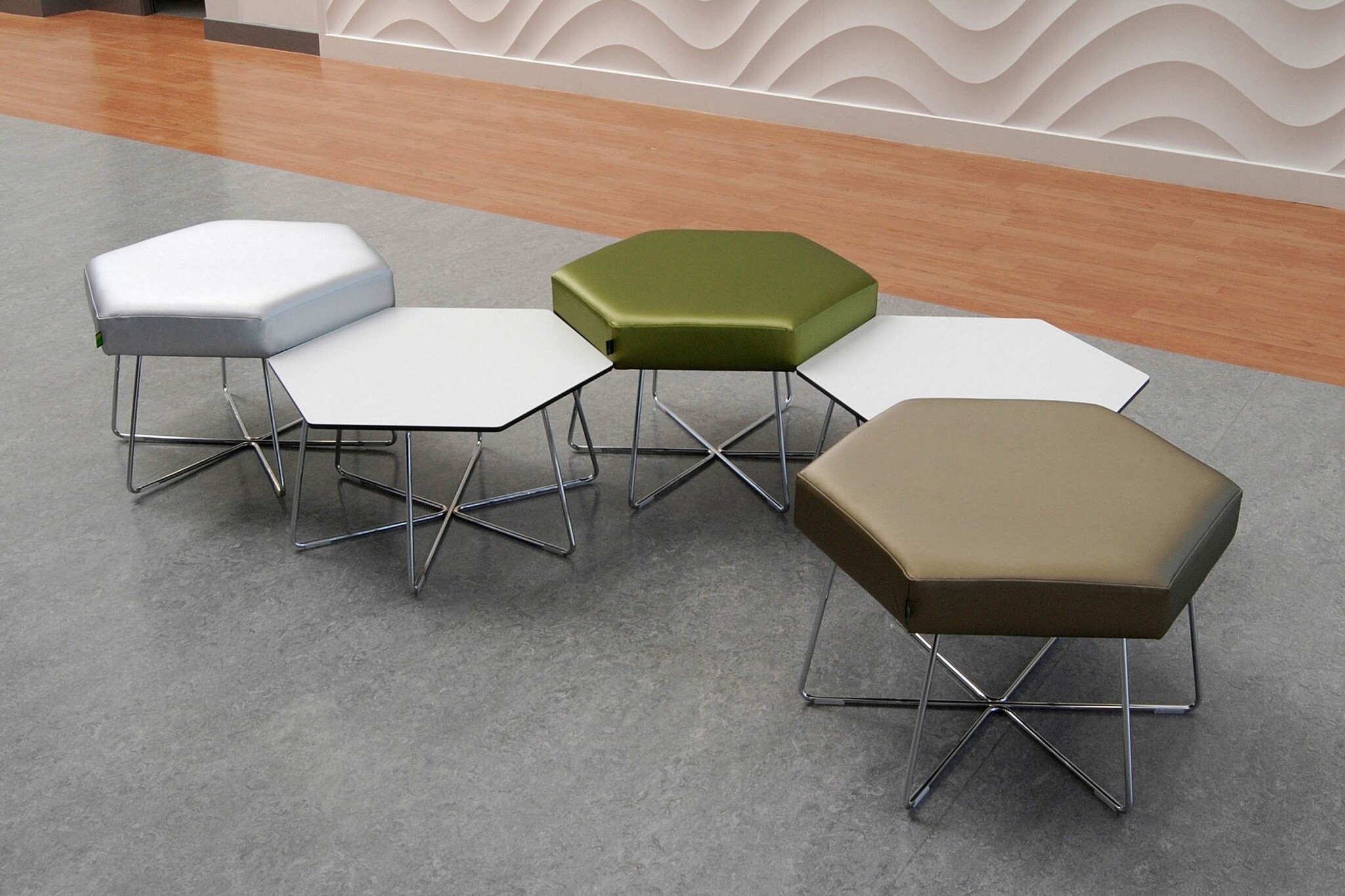 De Naughtone Pollen is een tafel gemaakt in de vorm van een hexagon. Deze kan in herhalende vorm worden gebruikt in zowel kleine groepen, rechte lijnen, bochten of verscholen in hoeken. Dit maakt Pollen een echt dynamische tafel voor elke zakelijke, publieke of educatieve ruimte. De tafels en stoelen gebruiken dezelfde basis, zodat ze mooi bij elkaar passen. Gebruikte materialen Nauhtone Pollen