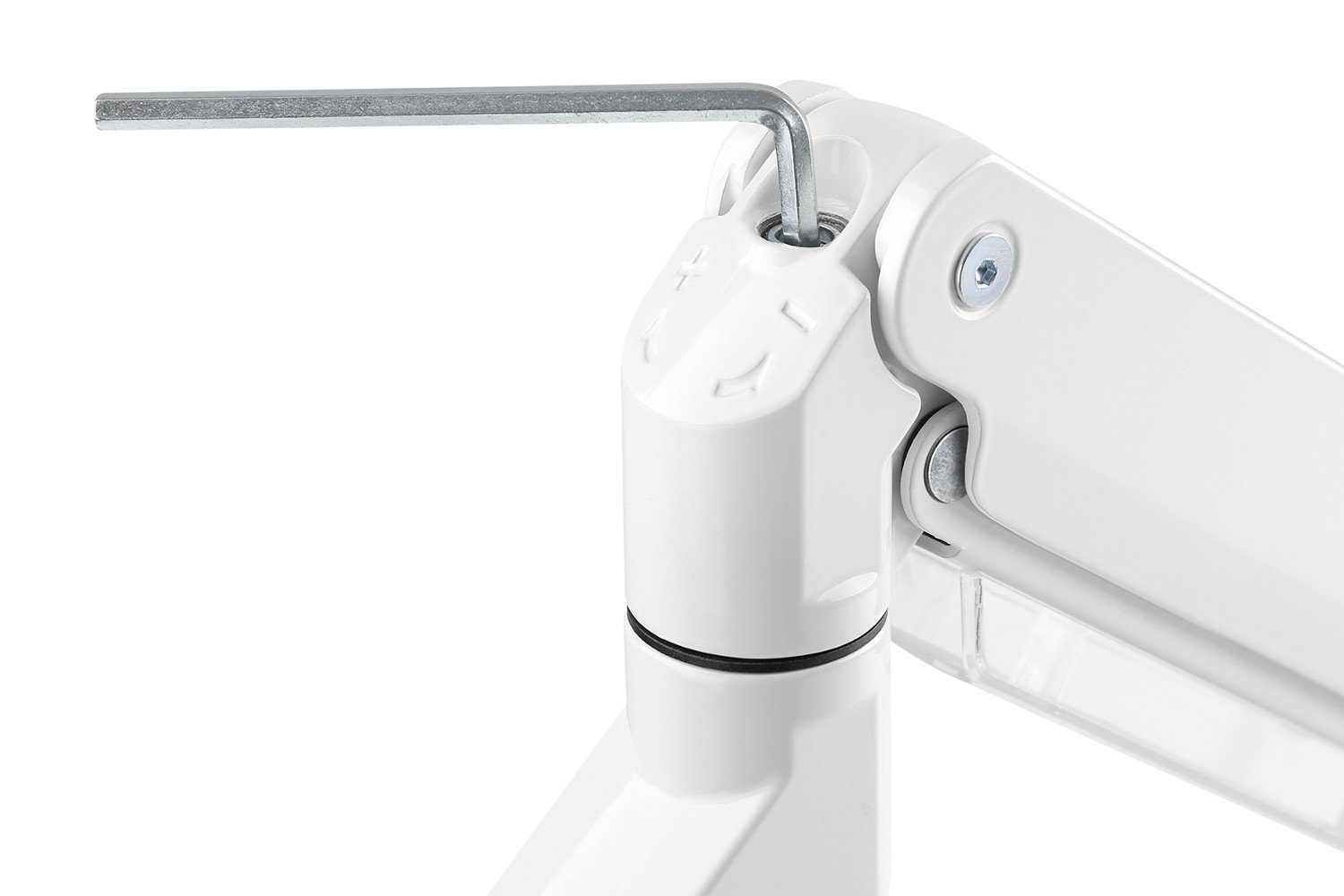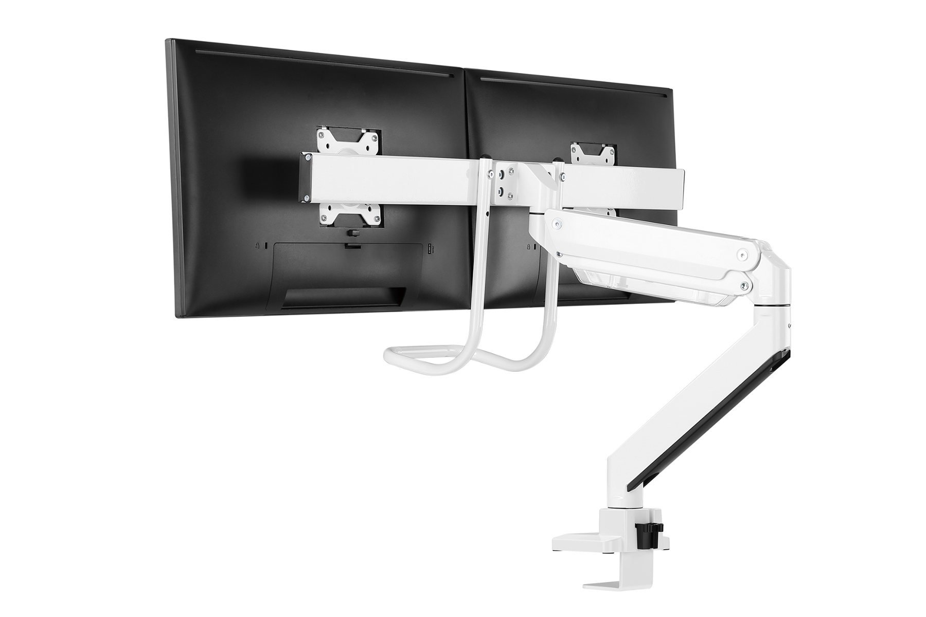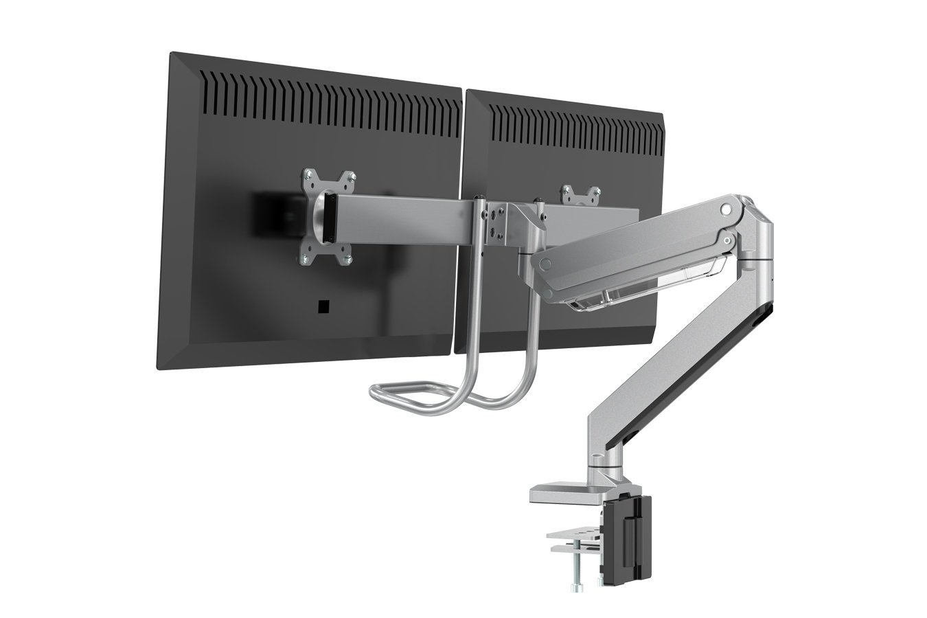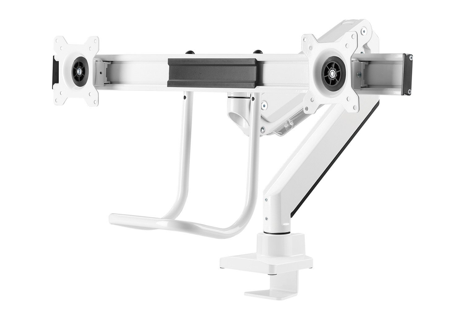 Deze monitorarm is toepasbaar voor 2 beeldschermen tot 812,8 mm. Deze beeldschermarm is te leveren in de kleuren: wit, zilver en zwart. Het maximale gewicht wat deze arm kan dragen is 9 kilo per scherm, dus 18 kilo in totaal. VESA van: 75 x 75 mm – 100 x 100 mm, dit is een makkelijk en veel voorkomend monteersysteem wat doormiddel van gaatjes gedaan wordt. De bureaumontage gaat via een bureauklem of bureaudoorvoer. De hoogteverstelling is doormiddel van een gasveer. U heeft 5 jaar recht op garantie.
