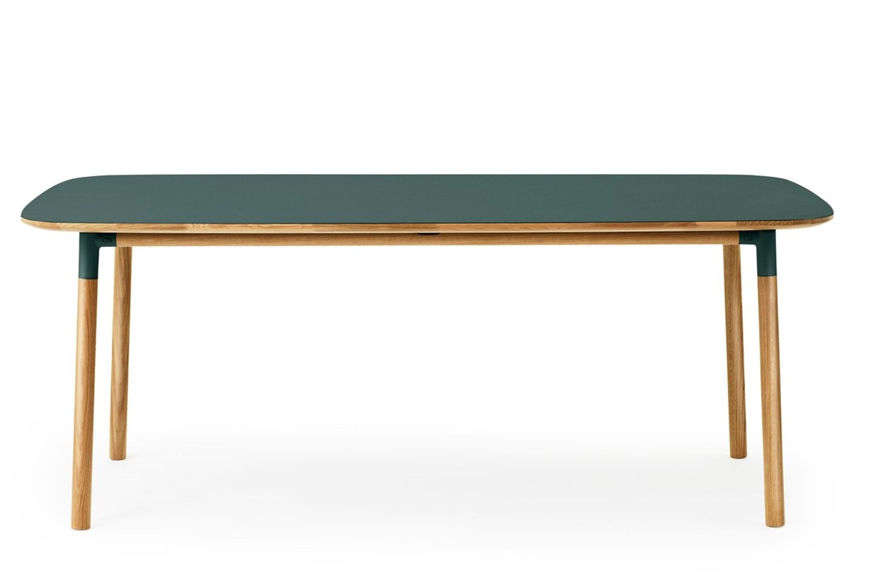Deze Form Table tafels van Normann Copenhagen zijn verkrijgbaar in de kleuren wit, grijs, zwart, blauw, groen en rood. De poten zijn gemaakt van eikenhout en het tafelblad is van linoleum.
