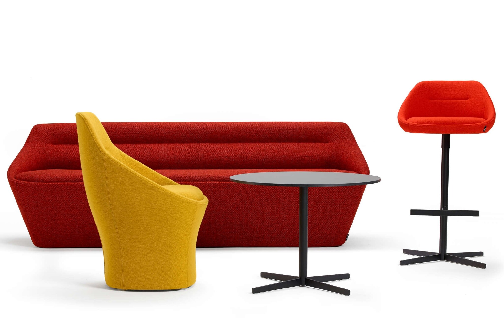 De collectie Ezy bestaat uit een bank, fauteuil, barkruk, ronde en vierkante tafels in drie verschillende hoogtes. Afmetingen Offecct Ezy