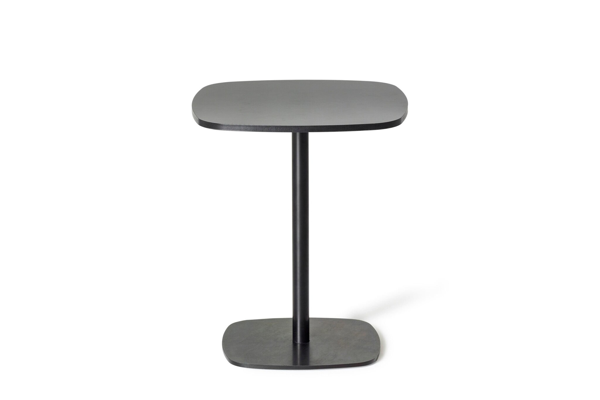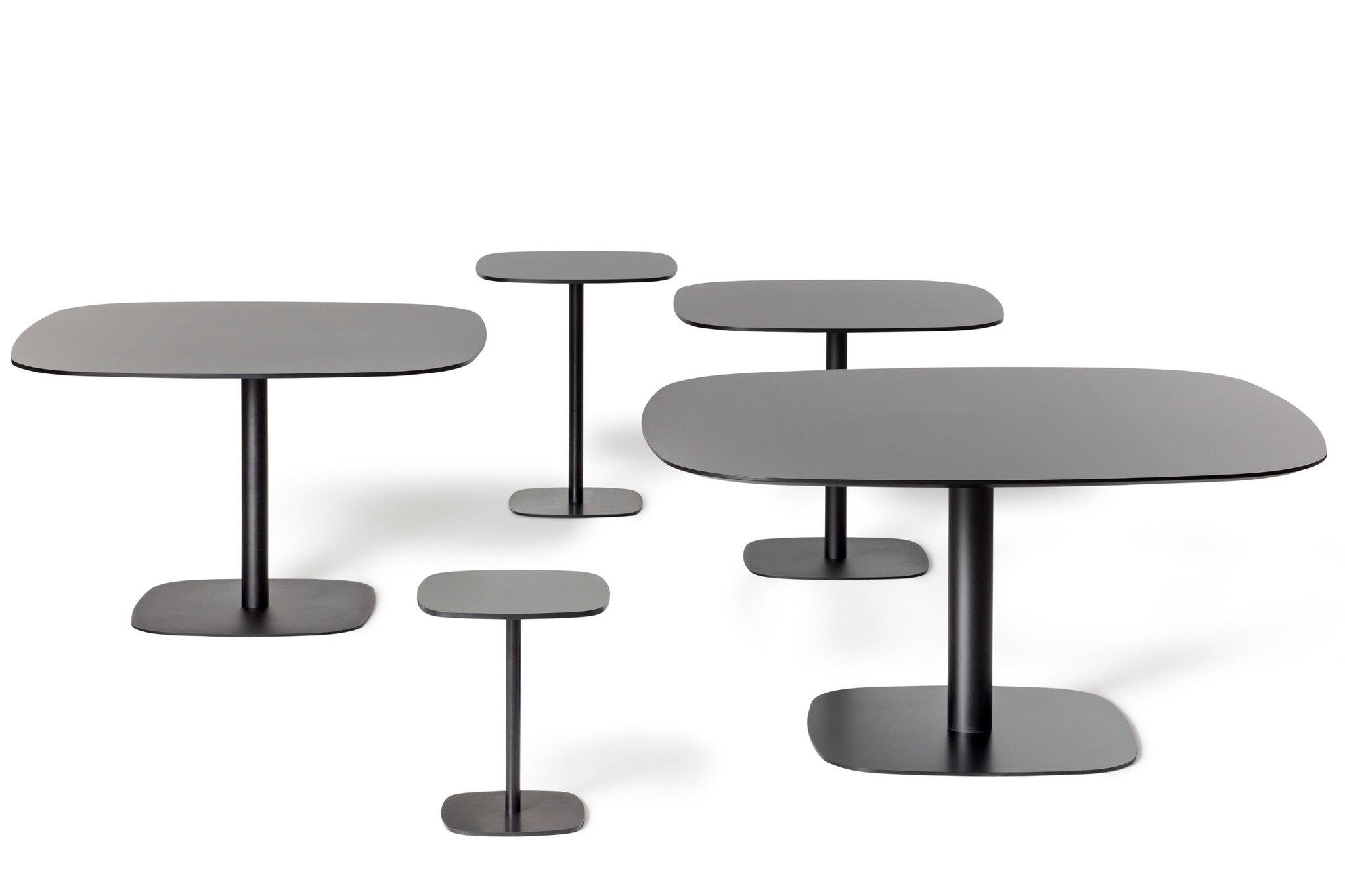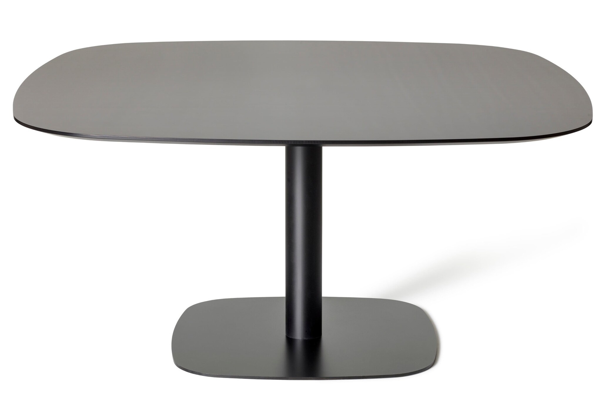 Offecct Nobis tafelserie - salontafel, kantine- of restauranttafel, statafels met een kolomvoet. Het tafelblad is zwart of wit uit compact laminaat met zwarte randen. Onderstel gelakt frame in RAL 9005.